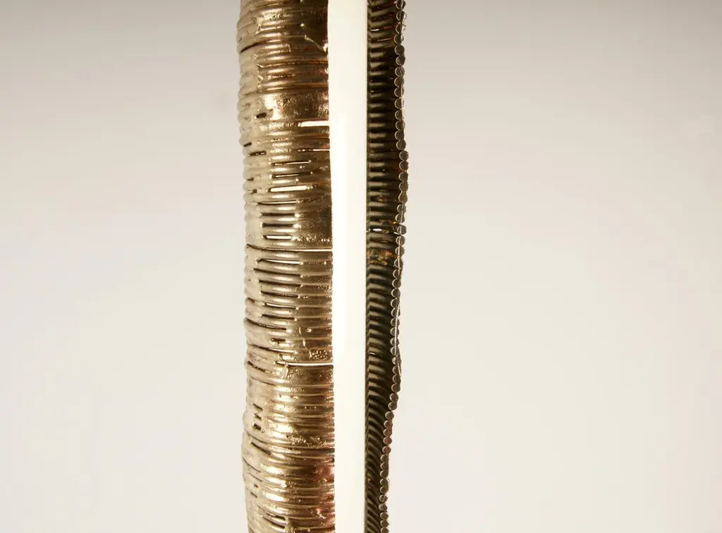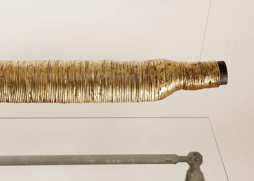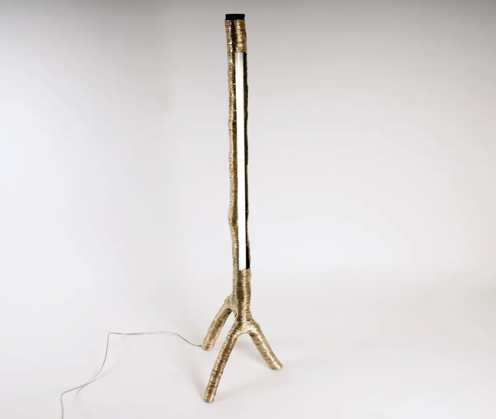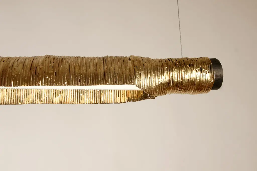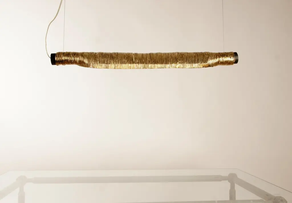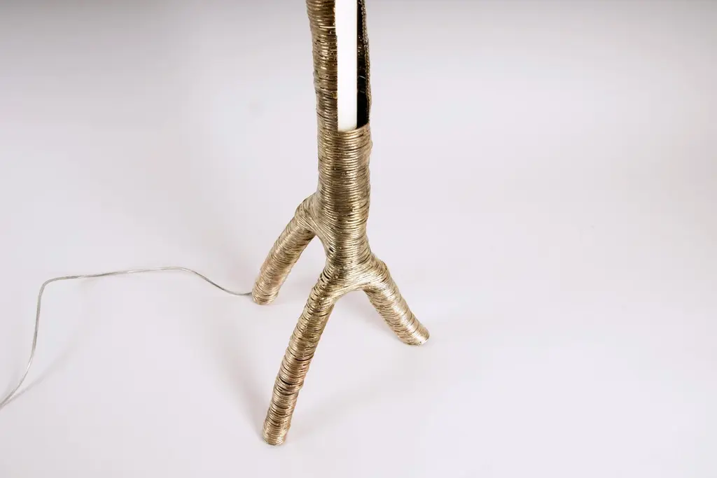 Wrap pendant light by Johannes HemannMaterial: Steel, brass, glass. Dimensions: Ø 10 x H 75 cm.All our lamps can be wired according to each country. If sold to the USA it will be wired for the USA for instance.Wrap examines the shells of things remaining after their disappearance. For this branches of trees are covered in steel wire which is then soldered. The branch being burnt out of the cast. The original shape of the branches remaining in the cover of steel wire now defining the shape of the lamp, side table. The shape of model / items is not only defined by the process of covering, but mostly by the shape of the branch. And from the shape of the branch you can guess to which tree the branch belonged. The spruce branches which I used for some lamps, for example, opening wide and wild, the beech branches creating leaner, higher forms, the surface on the outside is polished until you can see the two materials: the steel wire and the brass soldering wire, The different colours also reminiscence of the making and the annual growth rings, the inside has not been polished or treated, but only been lacquered, to actually show the process.