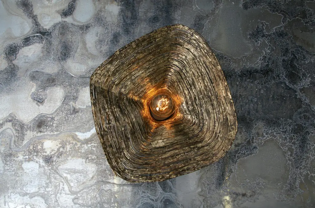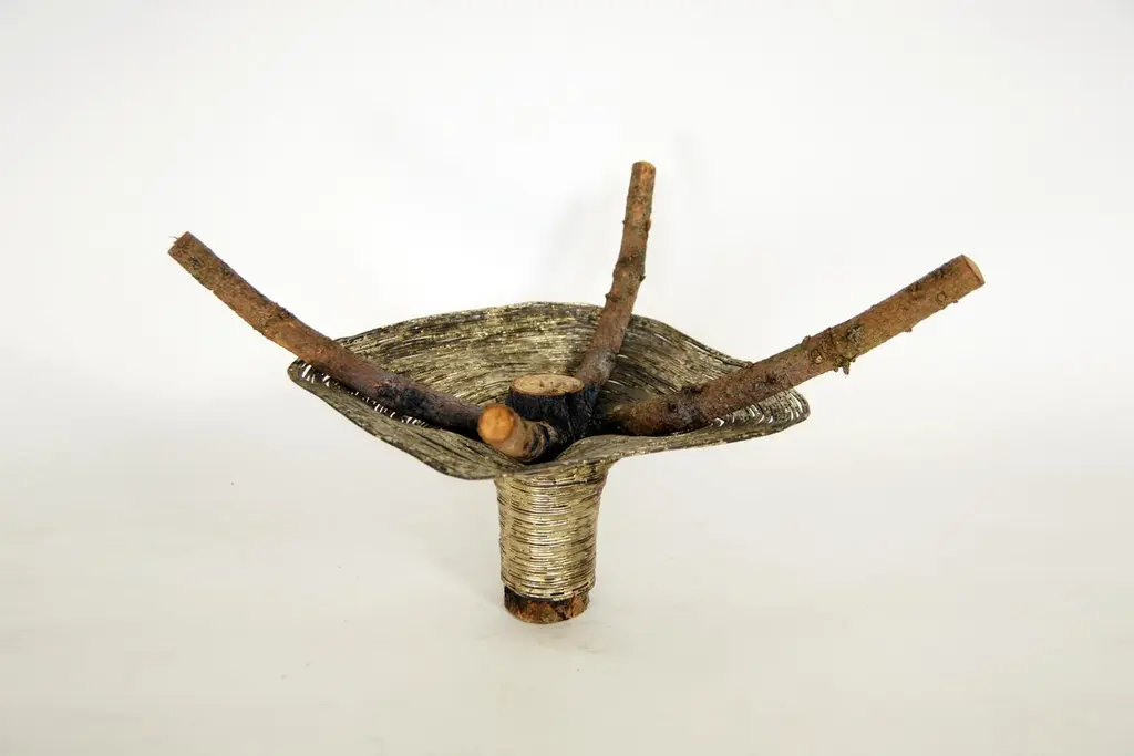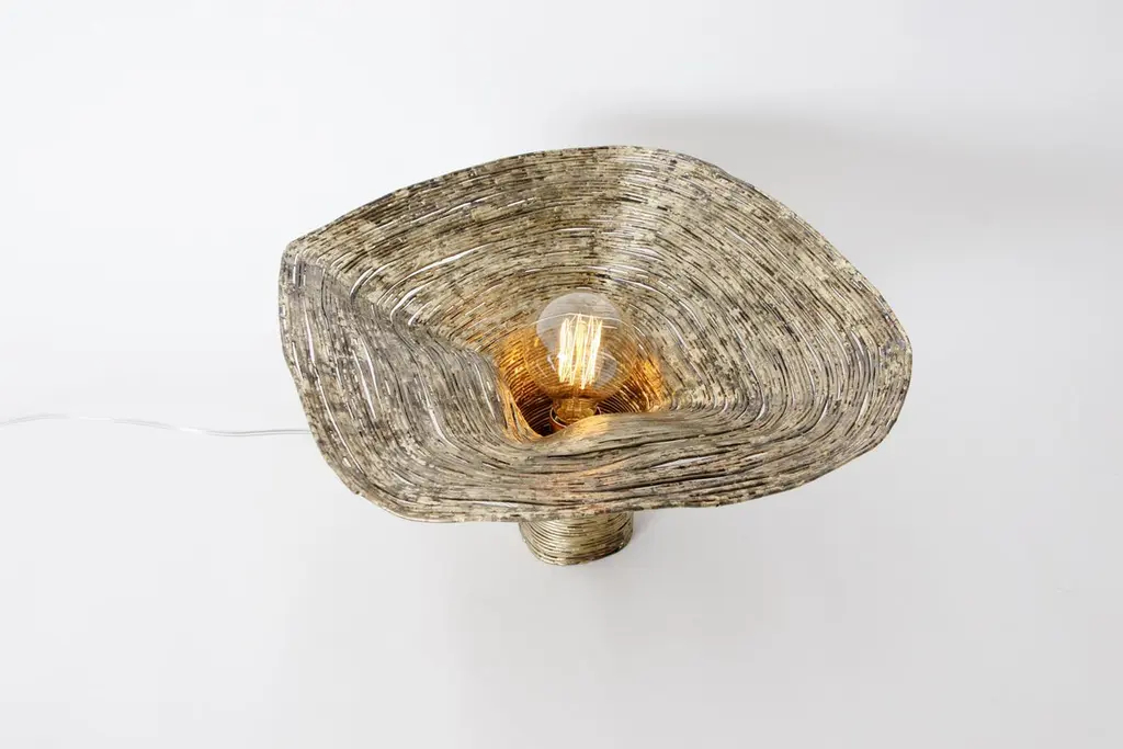 Wrap spruce table light by Johannes Hemann.Materials: Steel wire, brassDimensions: height 27cm, Ø 42cm.‘wrap, the series of objects by German designer Johannes Hemann examines the shells of things remaining after their disappearance. For this branches of trees are covered in steel wire which is then soldered. The branch being burnt out of the cast. The original shape of the branches remaining in the cover of steel wire now defining the shape of the lamp, side table… The shape of the models/ items is not only defined by the process of covering, but mostly by the shape of the branch. And from the shape of the branch, you can guess to which tree the branch belonged. The spruce branches which I used for some lamps, for example, opening wide and wild. The beech branches creating leaner, higher forms. The surface on the outside is polished until you can see the two materials: the steel wire and the brass soldering wire. The different colours also a reminescence of the making and the annual groth rings. The inside has not been polished or treated, but only been lacquered, to actually show the process.All our lamps can be wired according to each country. If sold to the USA it will be wired for the USA for instance.