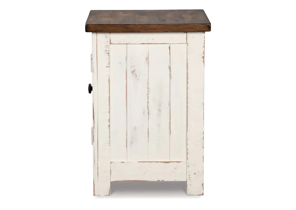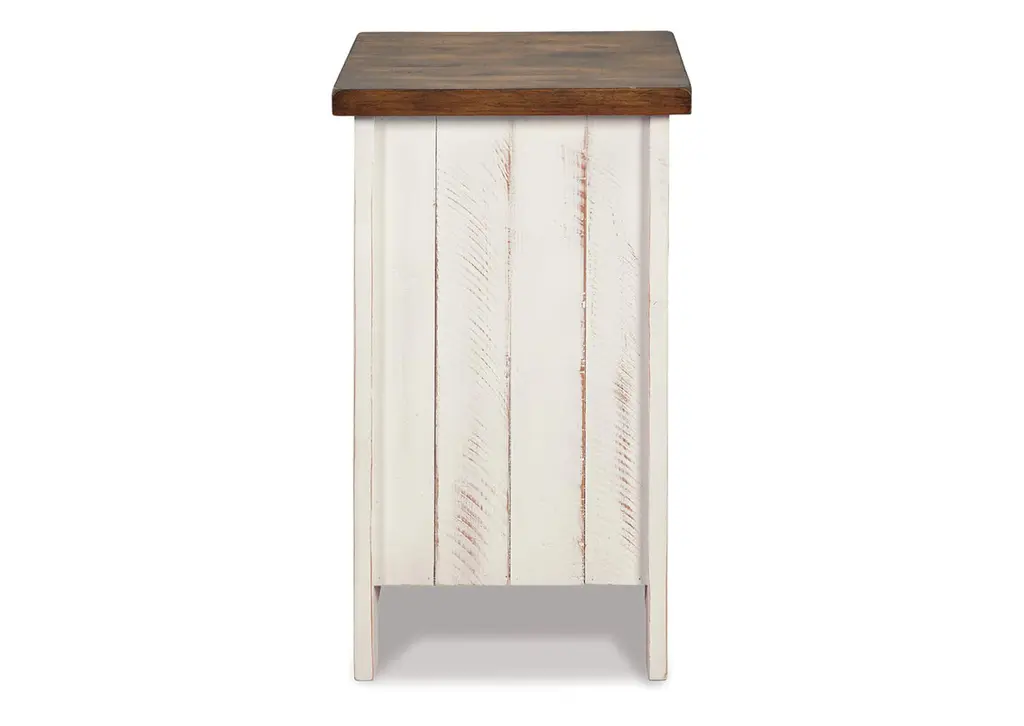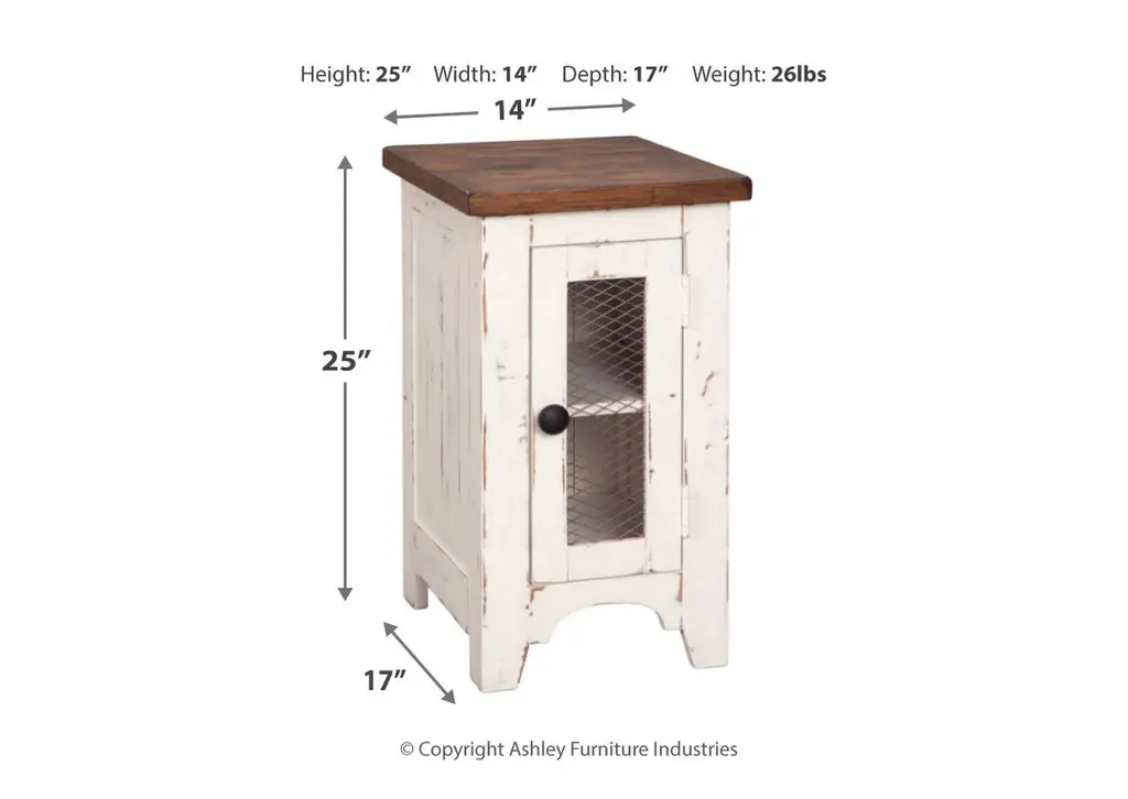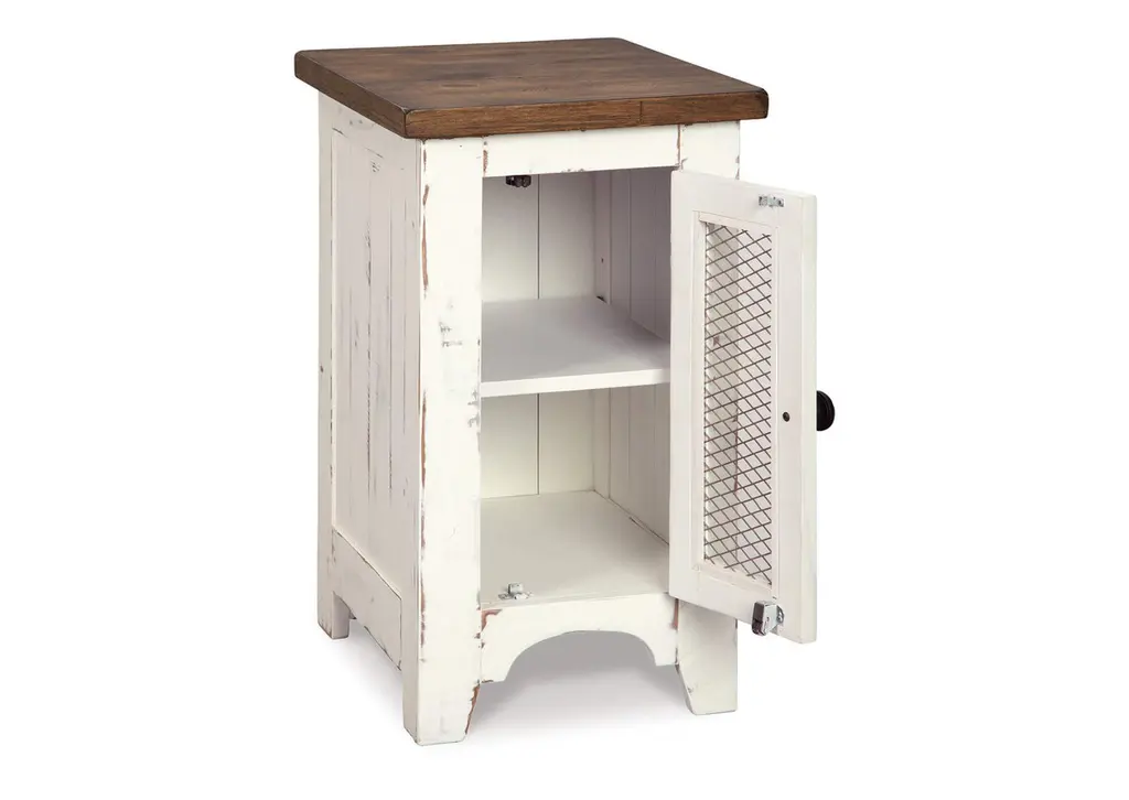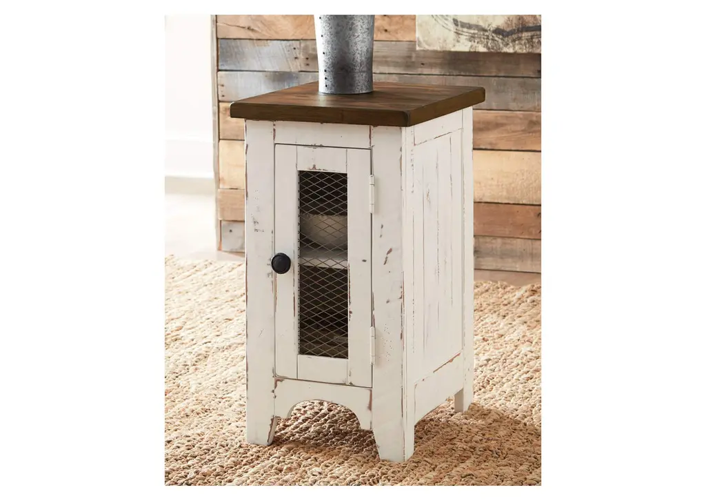 Double take. Sporting a two-tone finish that pairs a distressed vintage white with aged natural pine color, the Wystfield chairside end table elevates the art of rustic farmhouse living. Enhancing its charm: shelved storage visible through the cabinet door with inset metal grill. Weight 26.000 lbs. (11.7kgs.)