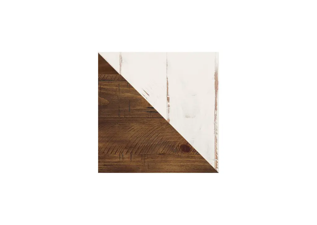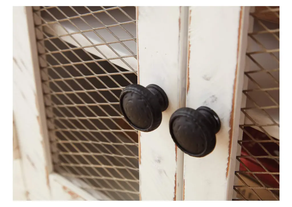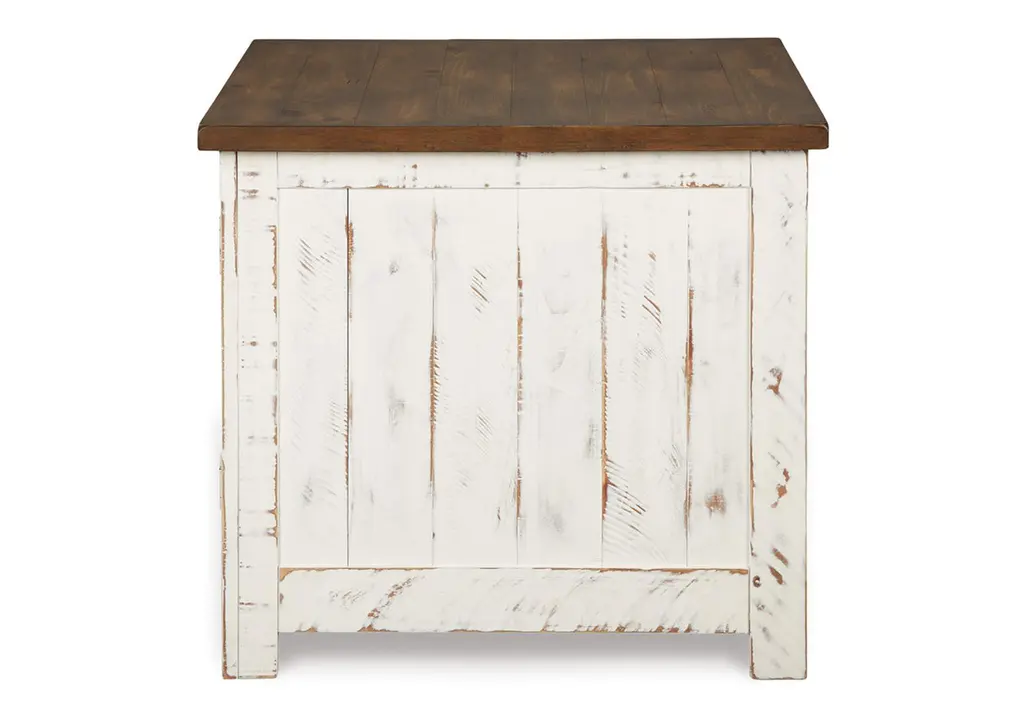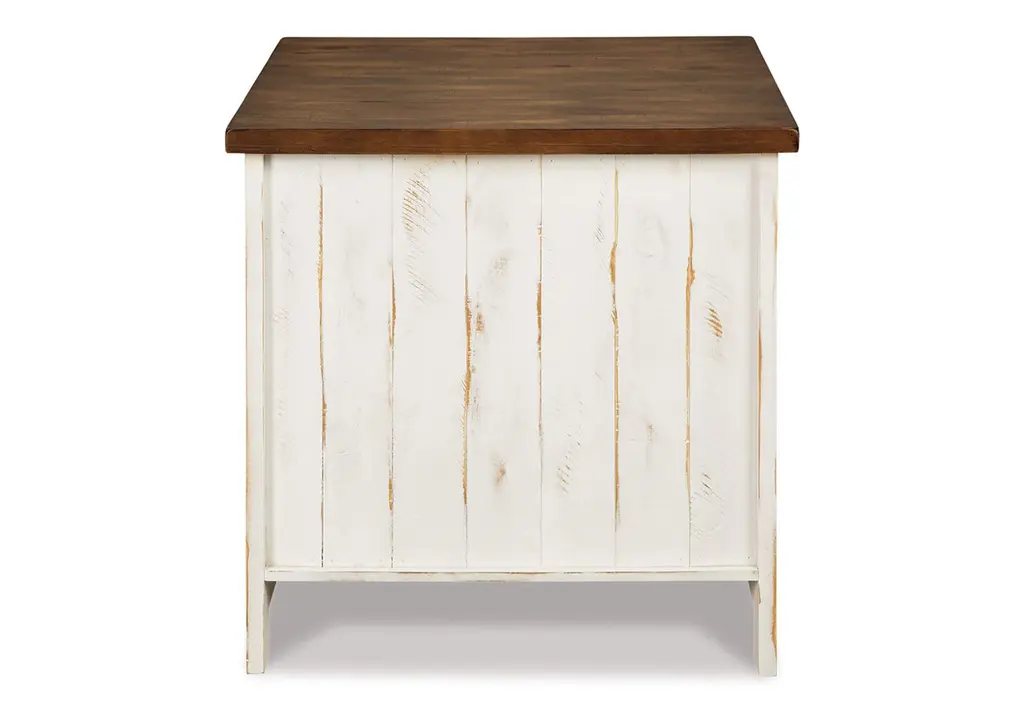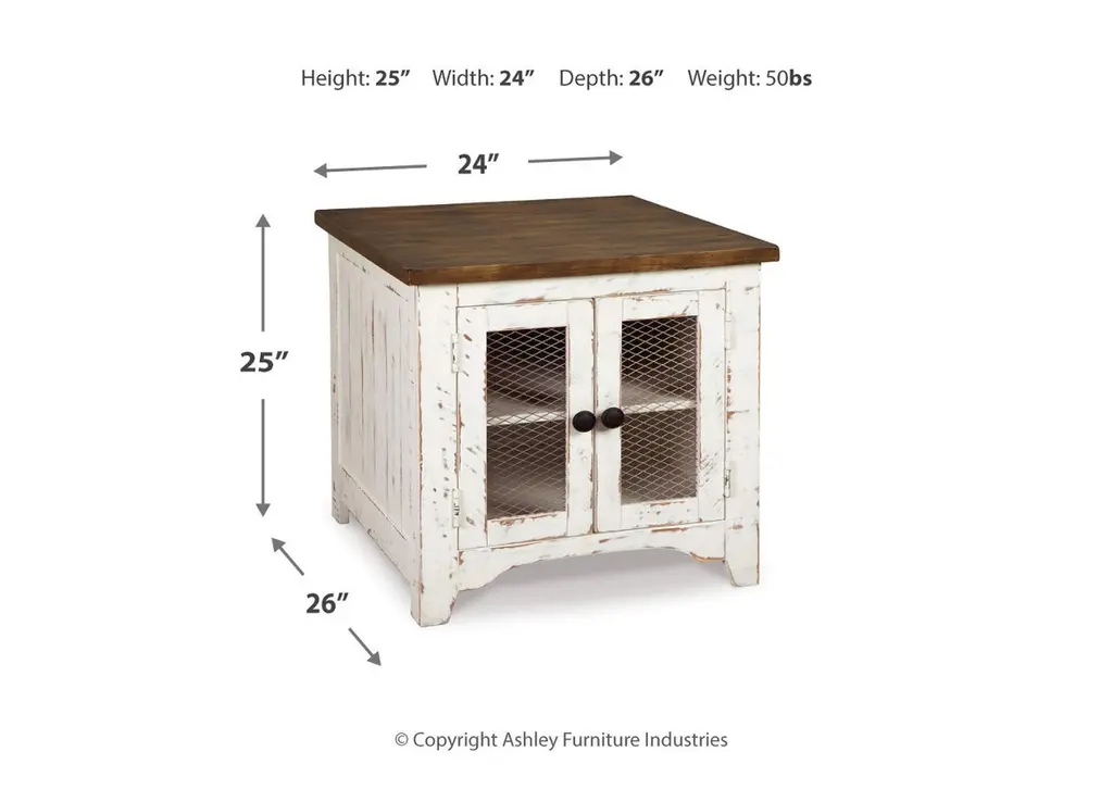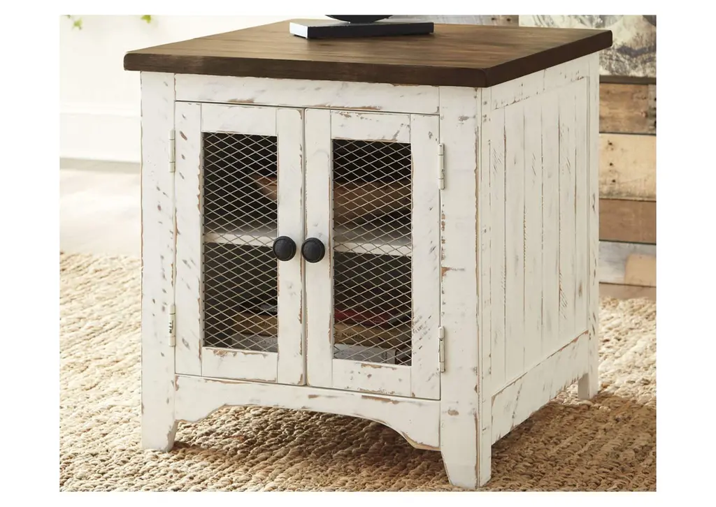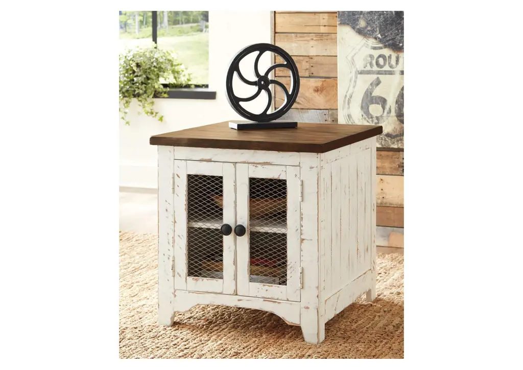 Double take. Sporting a two-tone finish that pairs a distressed vintage white with aged natural pine color, the Wystfield end table elevates the art of rustic farmhouse living. Enhancing its charm: shelved storage visible through cabinet doors with inset metal grills. Weight 50.000 lbs. (22.5kgs.)