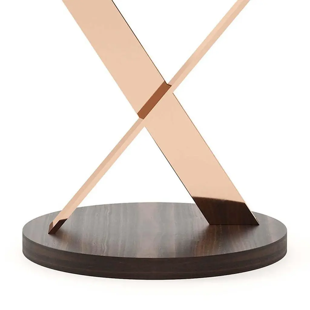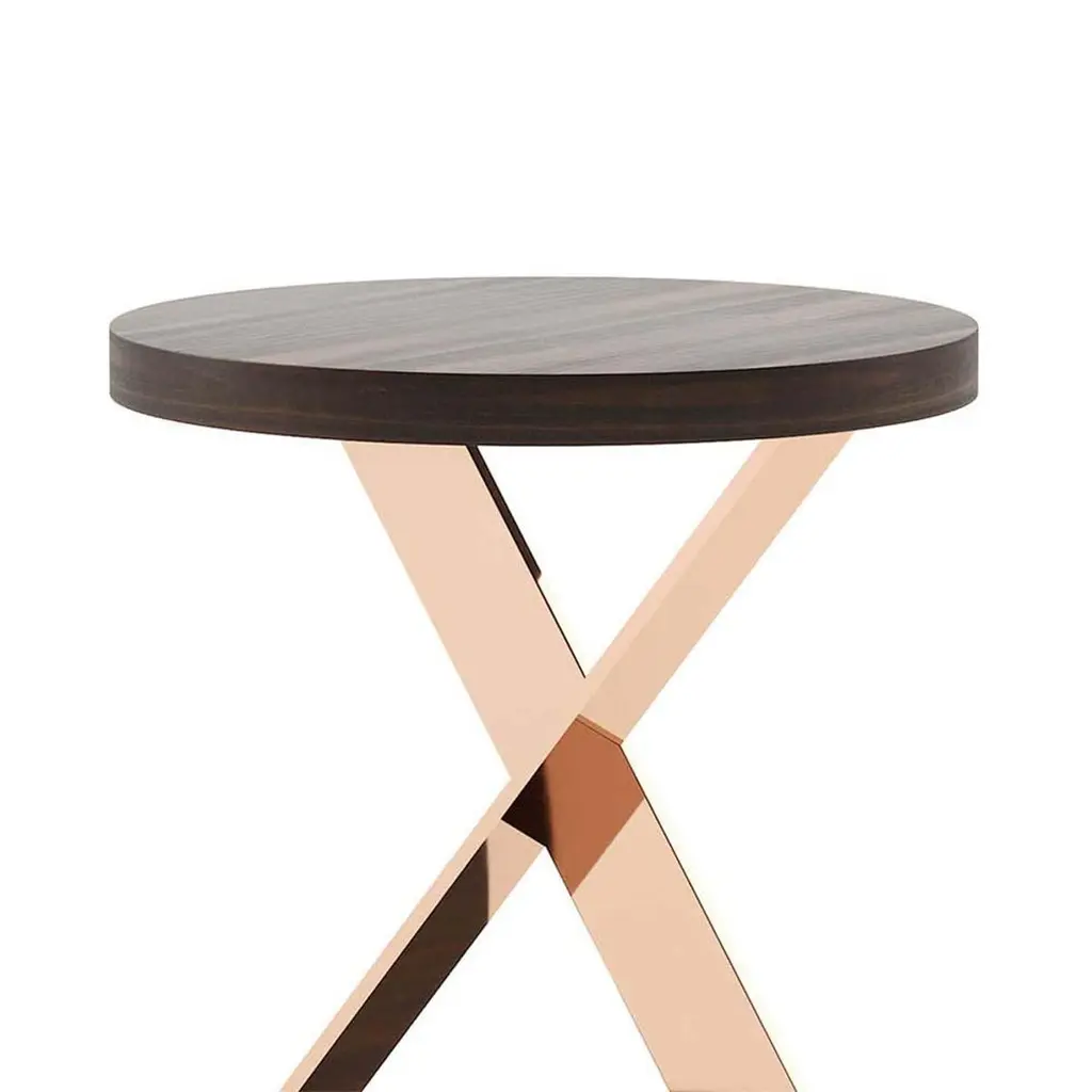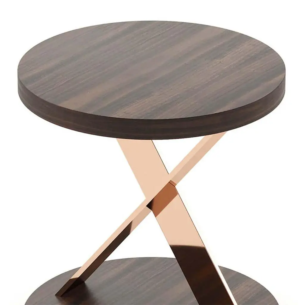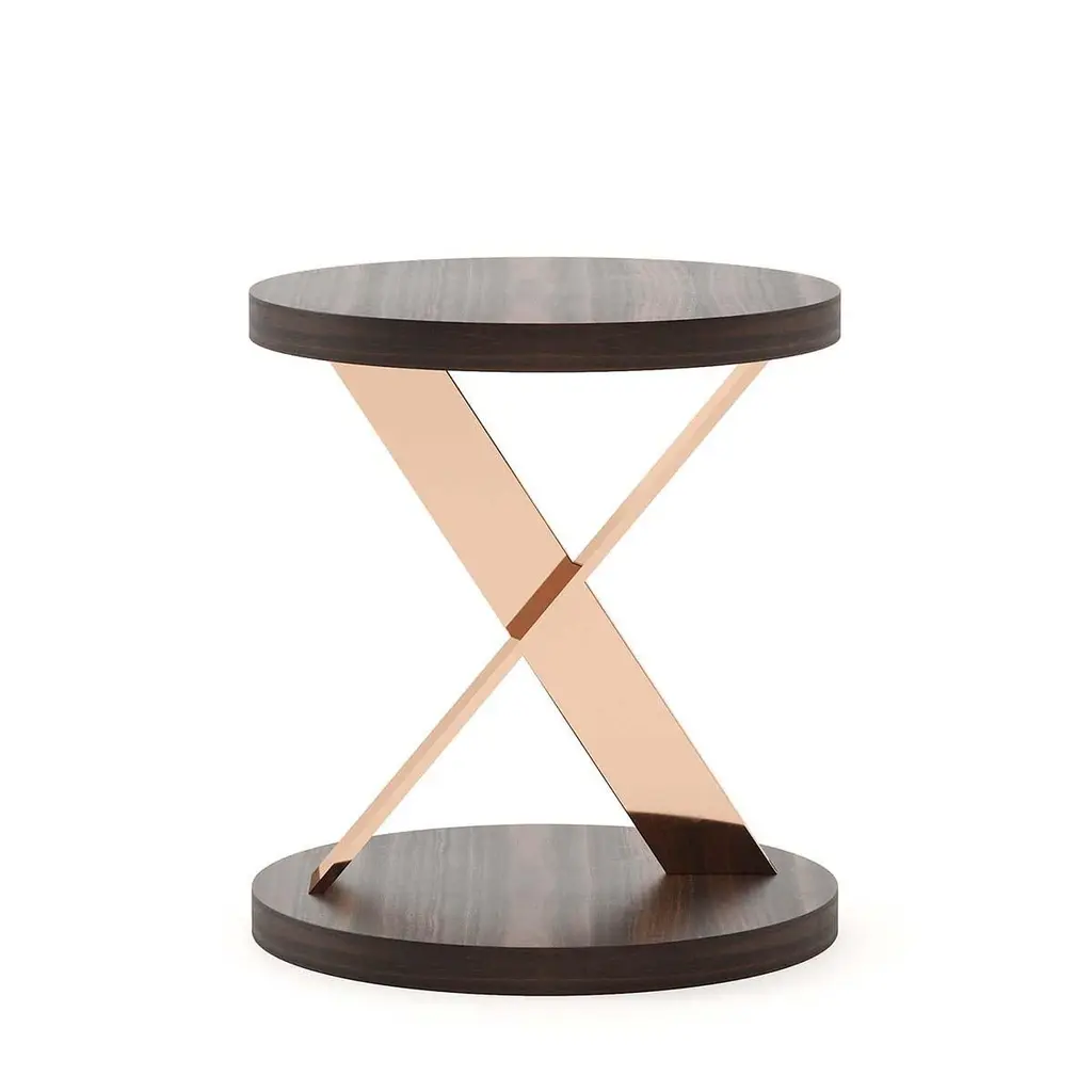Side table Xena with stainless steel basein copper finish, with up and down tops ineucalyptus wood veneer in matte finish.Also available on request with other stainless steel finishesand with other wood finishes.