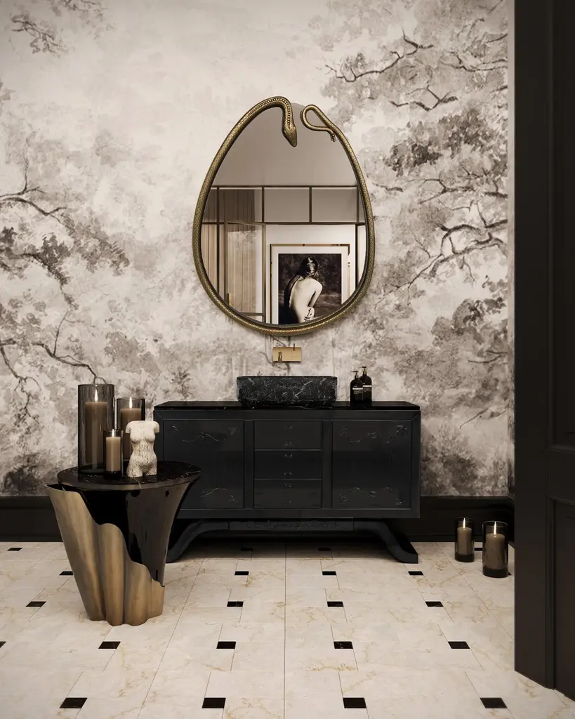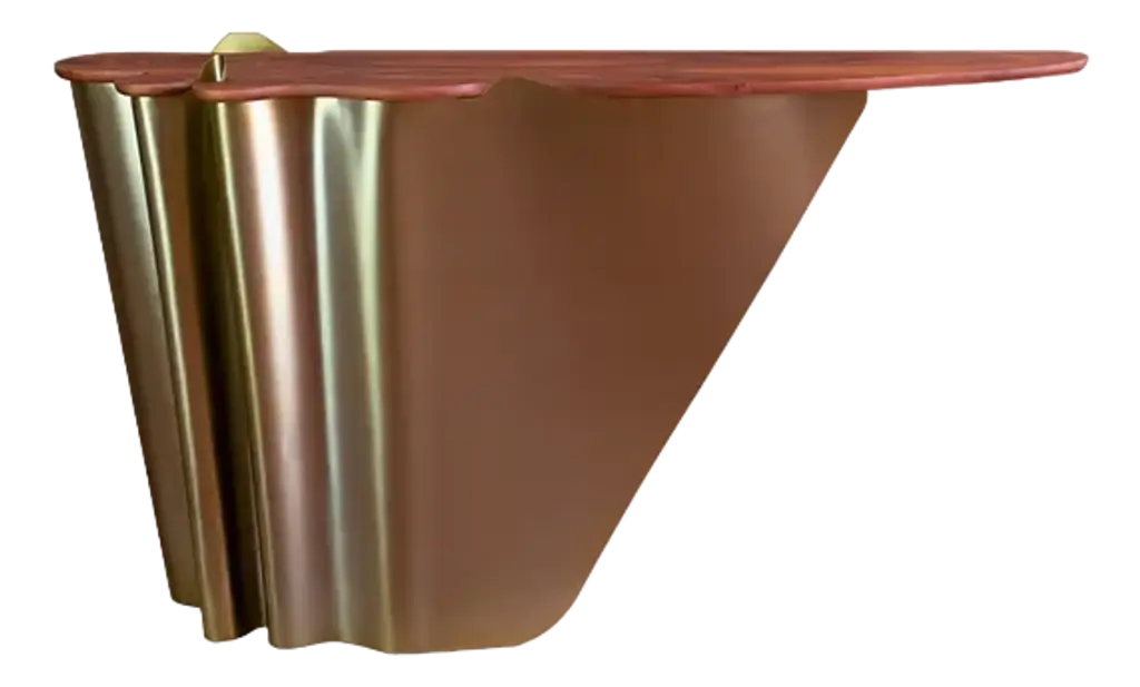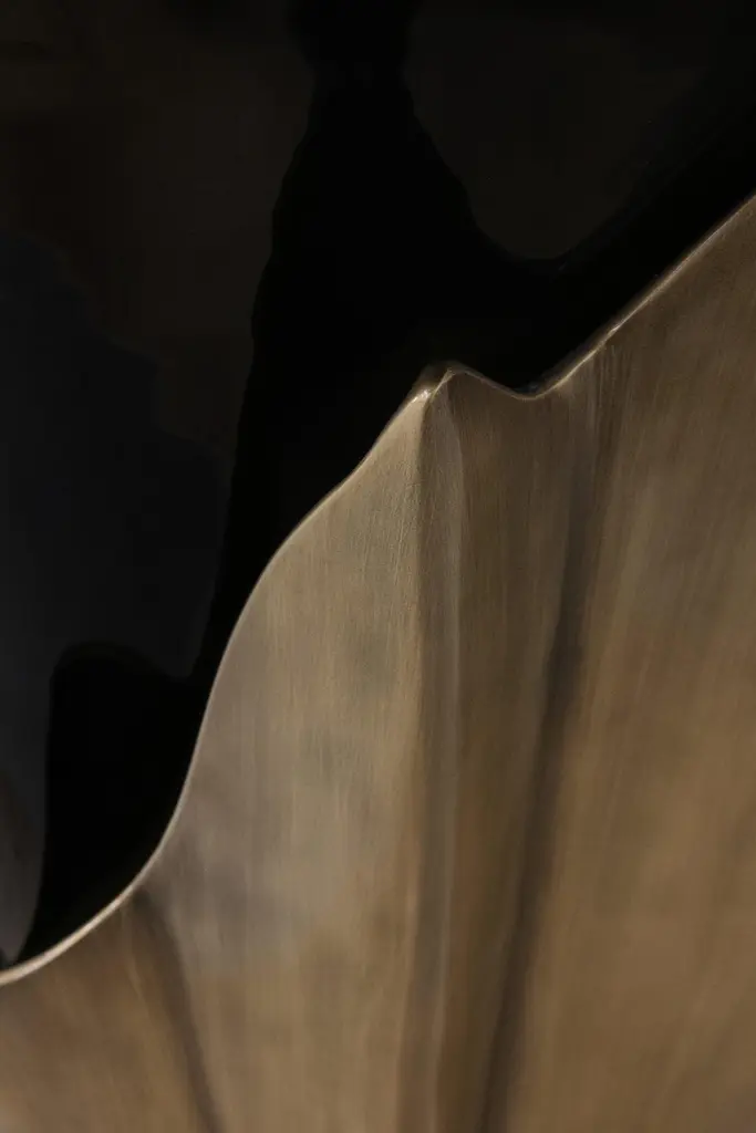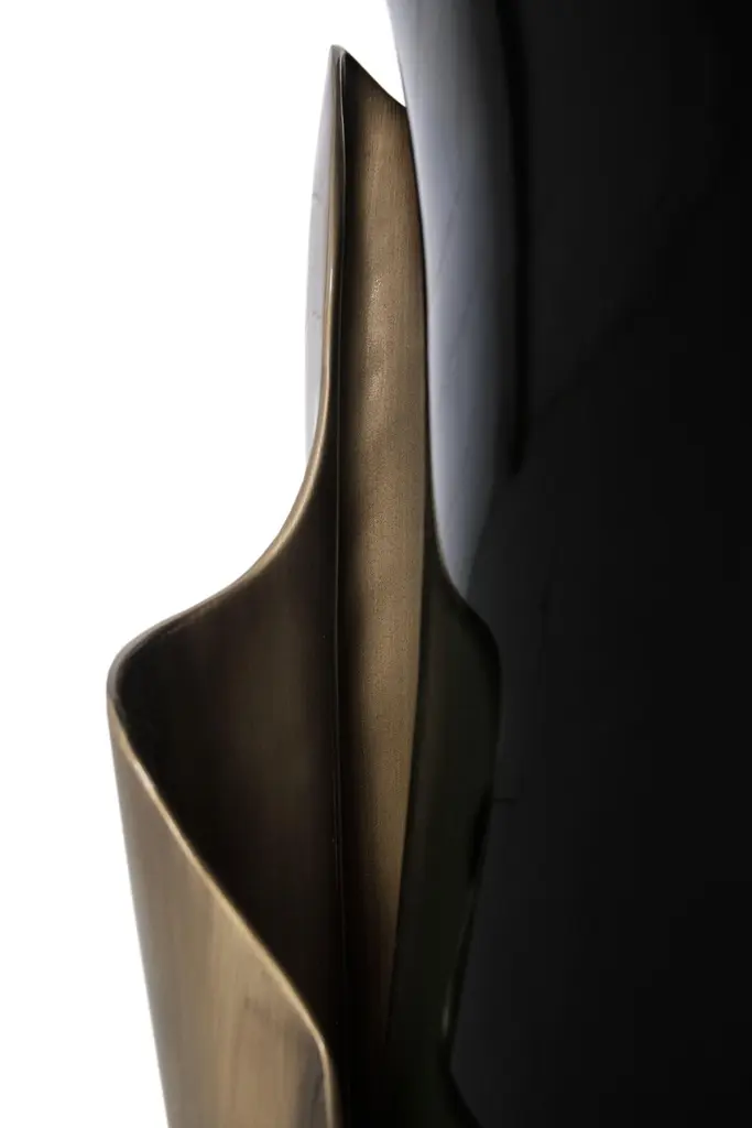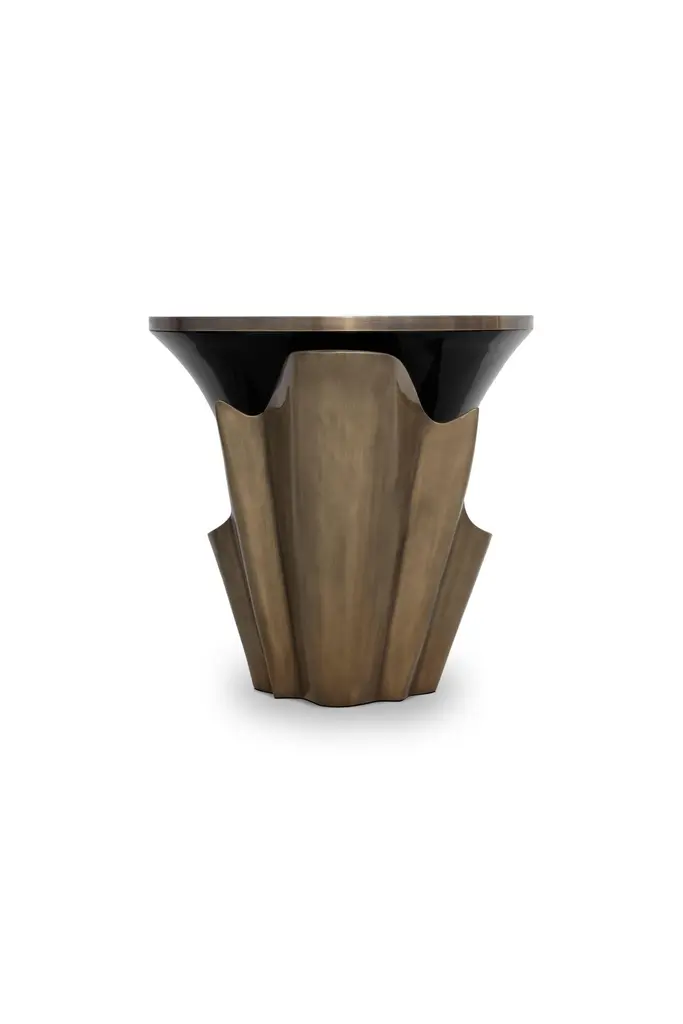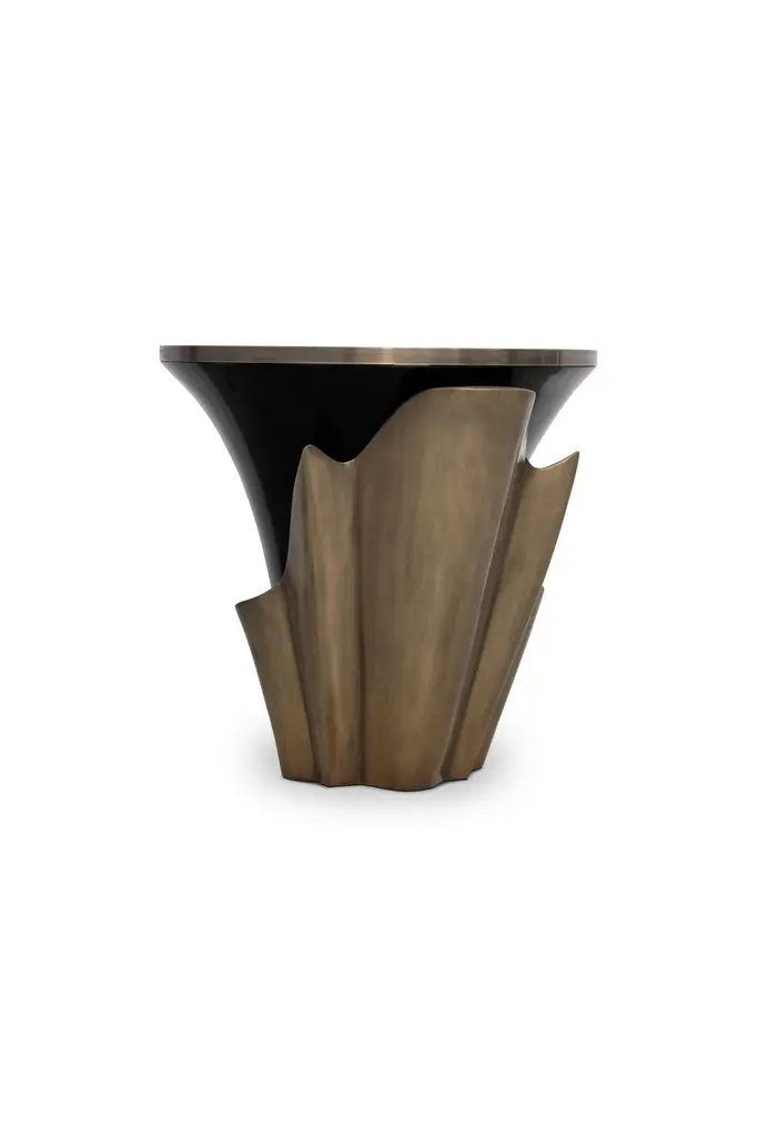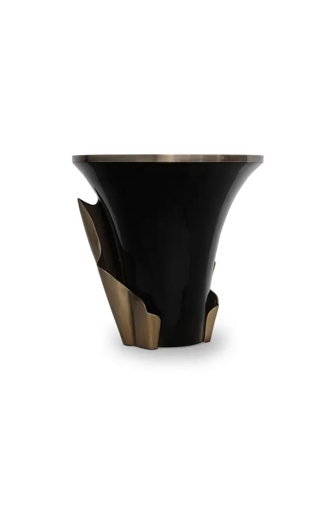A central piece to any space, the contemporary design of the Yasmine side table will have everyone doing double takes. The sultry silhouette is fashioned from tailored veneer. Classic lacquer and luxurious plated aluminum intermix arching back and forth to reveal each color's respective dominance in the design.Materials & Finishes: Top: Ebony Veneer (High Gloss Finish)Top Detail: Aged Brass (High Gloss Finish)Base: Black Lacquer (High Gloss Finish)Base Detail: Aged Gold Leaf (High Gloss Finish)Clean & Care: Wood and lacquered pieces have been stained and/or polished to bring depth and beauty to each finish. Although most are protected with either a clear coat or wax, they are still susceptible to wear. Care for your wood and lacquer pieces by dusting regularly with a soft cloth. Maintain wood, lacquer and mother of pearl by not placing near heaters and air conditioning units to prevent over drying or exposure to excessive moisture. Avoid extreme humidity changes in your home, as extremely dry air can cause wood to crack and lacquer to lift. Do not place/leave hot or moist objects directly on the wood. Rubber or plastic left on the wood finish can also damage the finish