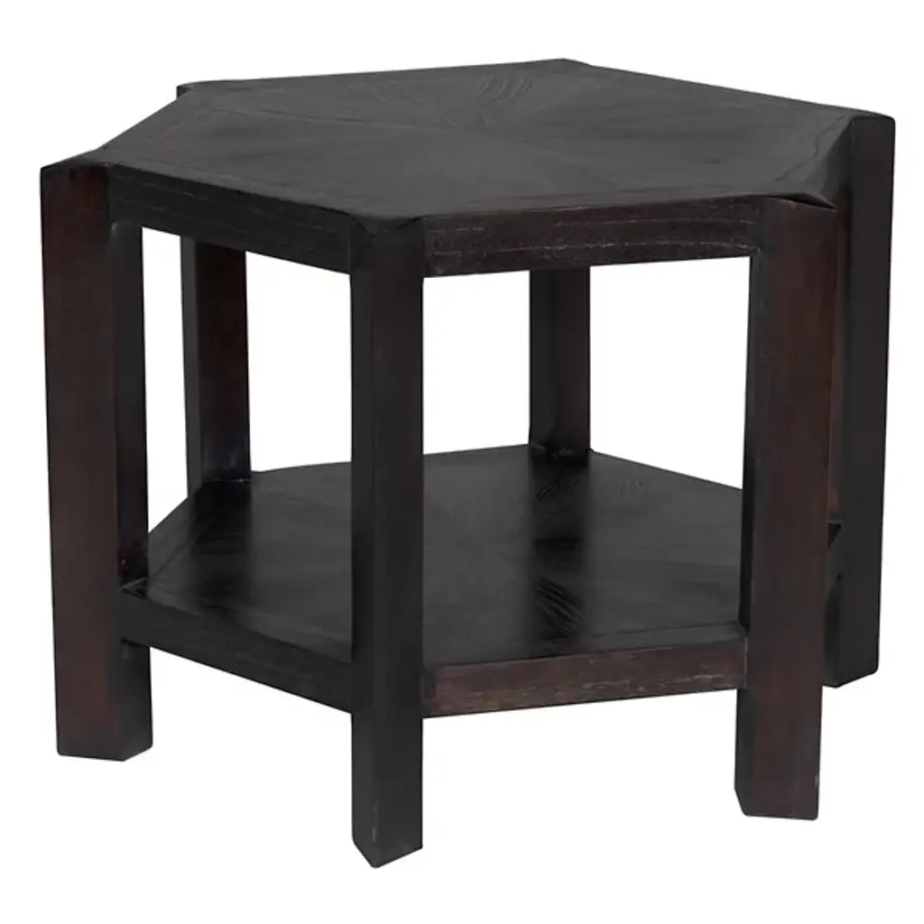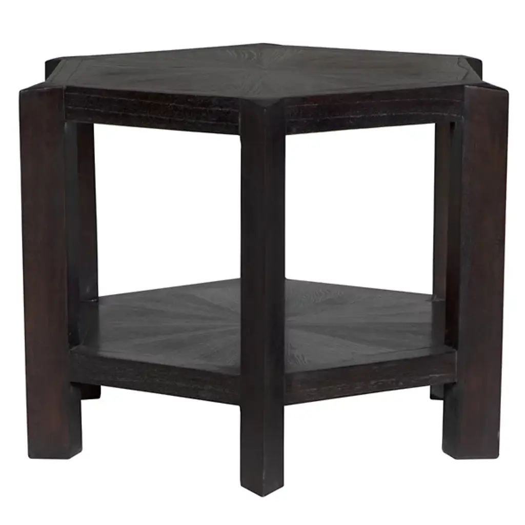 The Yehuda Large Side Table from Noir presents a hexagonal outline that breaks away from traditional round and square designs. Crafted from Mindi wood with a somber finish, this table incorporates geometric precision that catches the eye without overwhelming surrounding décor. The substantial lower shelf provides practical storage space while maintaining the table's clean lines. Each edge and corner has been carefully shaped to achieve a balanced look that works across multiple design styles. The sturdy legs anchor the piece firmly, making it equally suitable for busy family rooms or quiet reading corners.