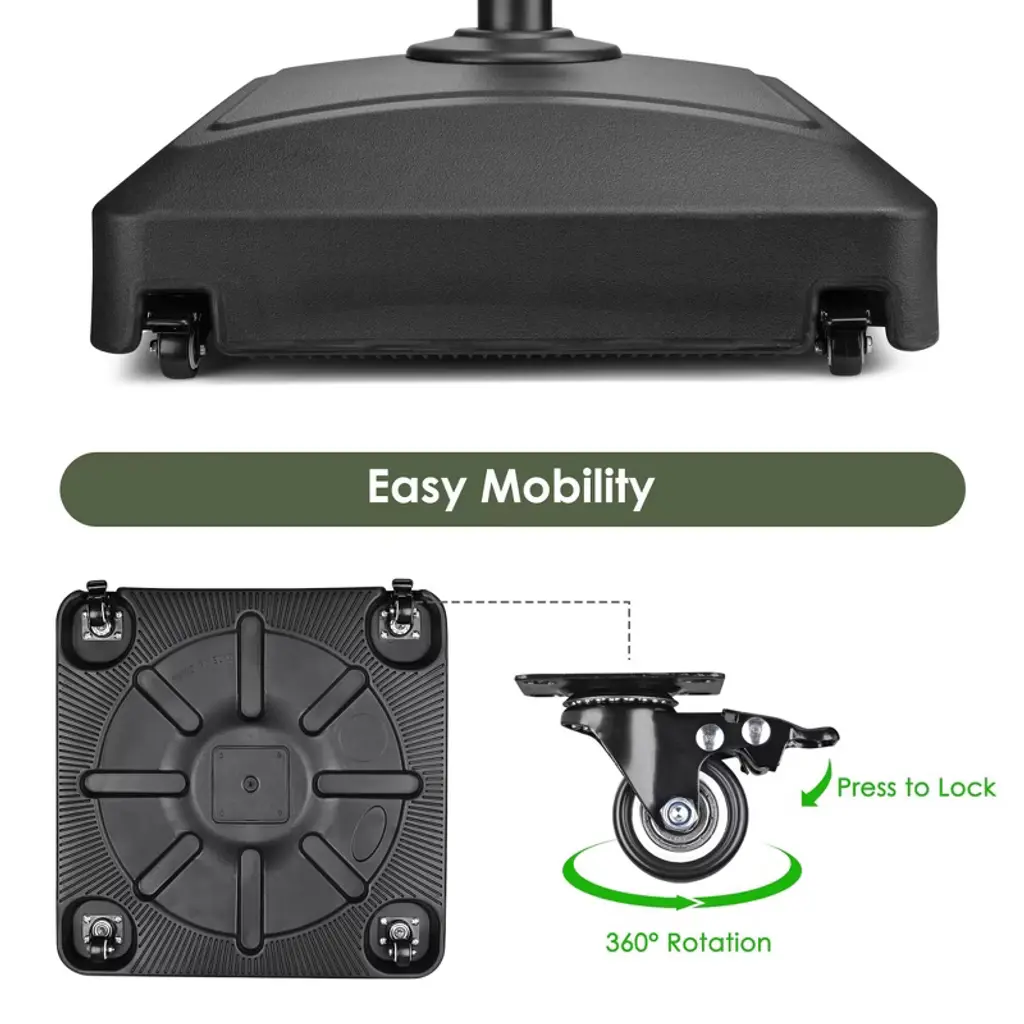 Features:- Patio Umbrella- 13ft Outdoor Patio Umbrella features a strong German beech wood frame with uniform texture, fitting with retro and American style furniture, along with 8 ribs providing excellent stability and support to the structure, ideal for shading and decorating your outdoor spaces- UV30+ Protection & Water Resistance - Features UV30+ protective canopy to shade you from sunburn and harmful UV rays, while also being water-repellent, allowing you to enjoy the breeze and scenery outdoors during light rain- Fade-Resistant - High-quality 180g PFAS-free polyester fabric offers great durability and resistance to wear-and-tear, along with Level 4 European Standard Color Fastness for anti-fade properties under prolonged sun exposure, ensuring long lifespan- Umbrella Base- Easy Mobility - 22"x22"x15" Patio Umbrella Base with 4 universal wheels can be moved easily to any place you like, while 2 wheels are lockable to keep your umbrella stand still for added stability in the outdoor areas; Weighs only 11 Lbs when empty- 2 Weighted Methods - Fillable design allows you to increase its weight by adding water or sand into the umbrella base, weighing a maximum of 88 Lbs when filled with water or 143 Lbs when filled with sand to provide stable & strong support for the umbrellaSpecifications:- Patio Umbrella- Overall Dimension(Dia.xH) 157 1/16" x 107 3/8"- Pole Diameter 1 7/8"- Bare Umbrella Pole Length After Closing 24 13/16"- Net Weight 30.1 Lbs- Umbrella Base- Overall Dimension(LxWxH) 21 15/16" x 21 15/16" x 14 3/4"- Load Capacity 88 Lbs, Water; 143 Lbs, Sand- Net Weight 9.8 LbsPackage Contents:- 1x Wooden Umbrella- 1x Finial- 1x Pole- 1x Base- 4x Wheels- 1x Metal Plate- 1x Umbrella Holder- 1x Umbrella Holder Sleeve- 1x Top Cover- 2x Sleeves- 2x Knobs- 1x Allen Key