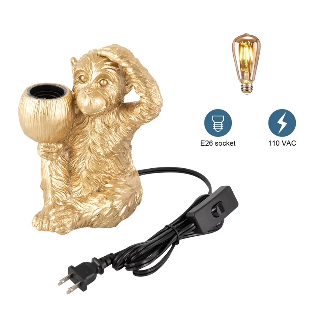 This charming sitting monkey table lamp combines playful artistry with practical lighting, making it a delightful addition to any room. Handcrafted with detailed painting and carving techniques, the resin monkey figure brings a whimsical yet royal touch to desks, bedside tables, or living spaces. Its open design accommodates a 60W E26 bulb (not included), casting a warm and luminous glow across areas up to 107 ft². Sturdy, rust-resistant, and easy to clean, this lamp is built for long-term use. With a compact footprint, user-friendly switch, and extended power cord, it’s both functional and decorative—perfect as a unique gift or standout decor piece.