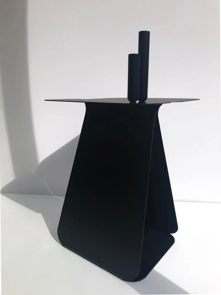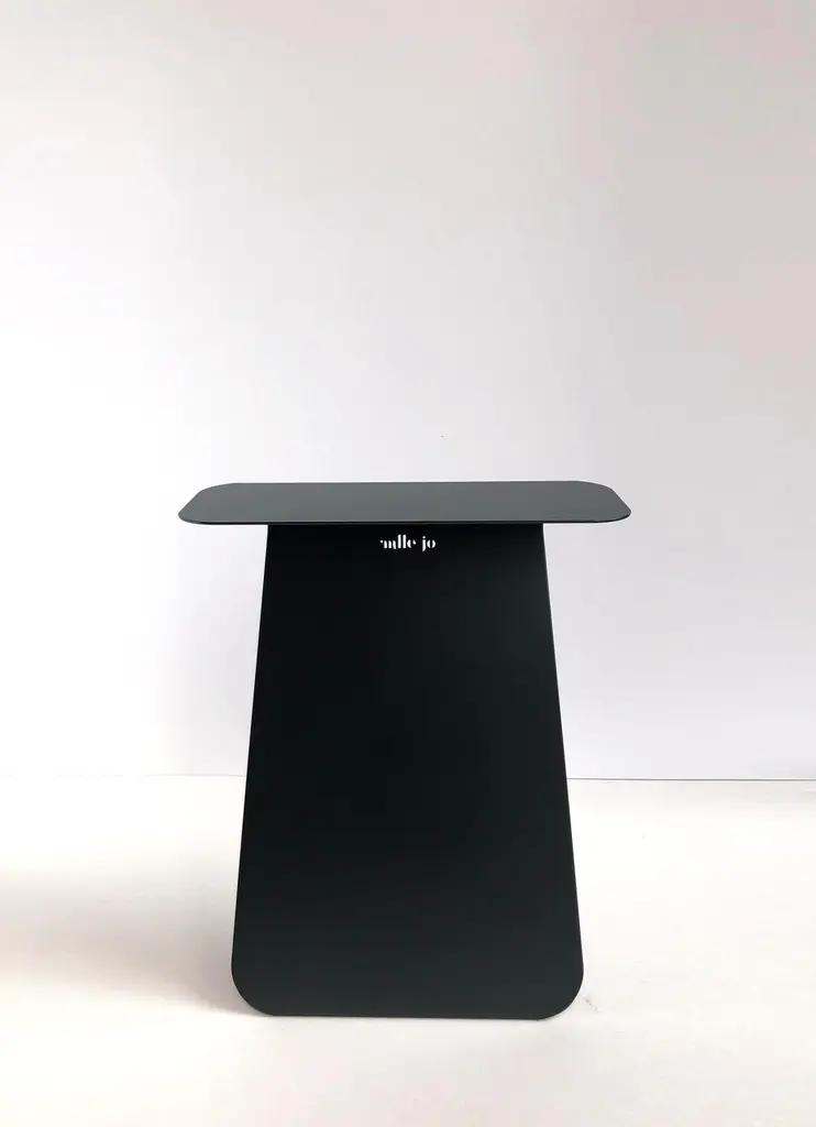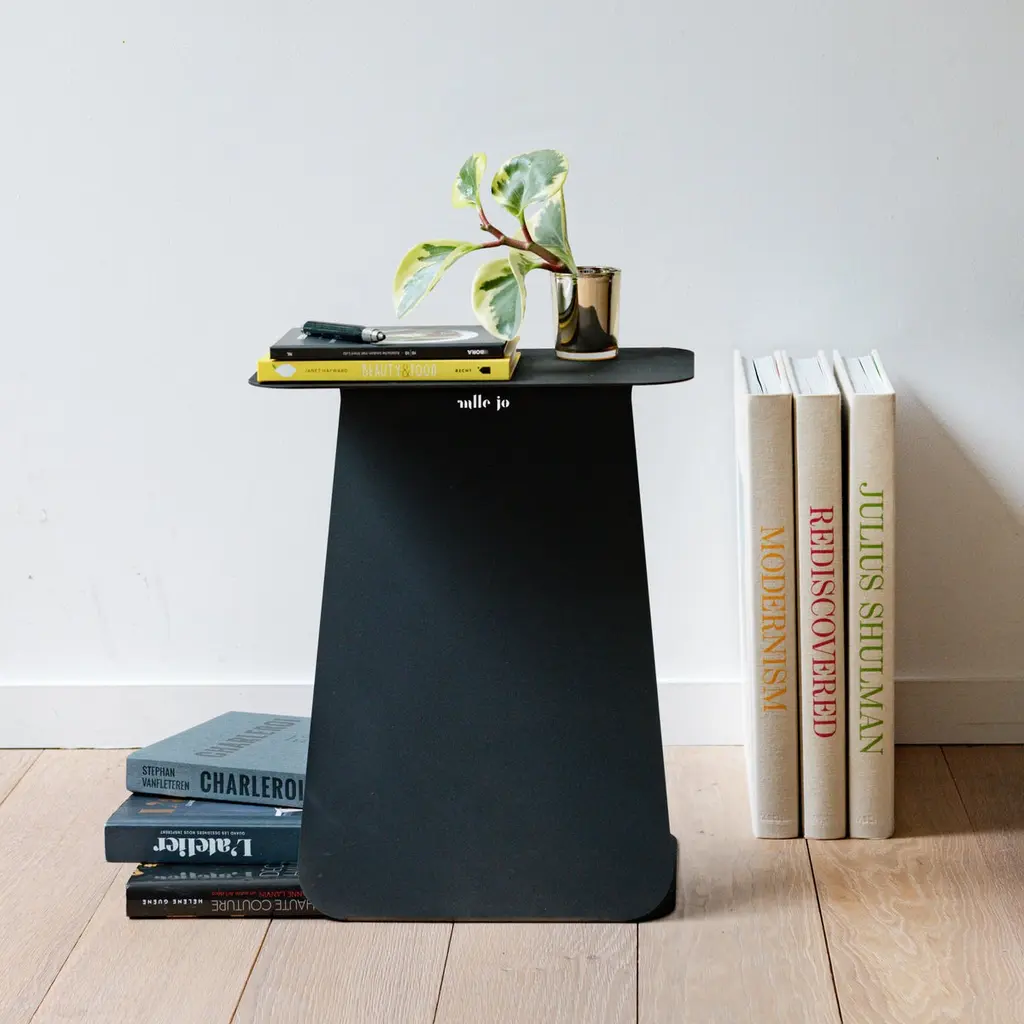 YOUMY Round Black Table by Mademoiselle JoDimensions: Ø 36 x H 43 cm.Materials: Matte black steel.Also available in different colors and finishes. Round symmetrical or rectangular asymmetrical version. Available in two versions and several colors. Please contact us.Design round side table, in cut and folded steel. Composed of two symmetrical parts, which can be separated or fitted together. The element with the logo is placed above the other element.Designed like an origami folding, YOUMY can be assembled and separated as you wish. The YOUMY side table was born from the observation that a coffee table was not practical to share cozy moments with friends, because some people were too far from the table to enjoy the drinks and appetizers.The designer created an innovative system, a side table that can be divided in two so that all guests can keep their glasses close to them.You & Me, YOUMY.Cut, folded and lacquered steel side table, composed of two parts.With the foot placed under the edge of the sofa, it integrates usefully in your living room. Trained as a stylist at La Cambre, I have worked for 25 years to create trends, colours and fabrics for the world of lingerie. Architecture has always been my passion and as such, object design has become an obvious path for me.My approach is based on intuition, with a fascination for the material and the intention to offer something beautiful and different. My vision delicately intertwines heritage and technology, aiming to offer creations at the right price, designed to last and be transmitted, while trying to produce as local as possible and to highlight our know-how.A responsible commitment for a sustainable product.We offer products produced with great care in Belgium and Europe. Useful creations that make you smile, creations you pass on, objects that will have multiple usages in their different lives following the imagination of their owner.