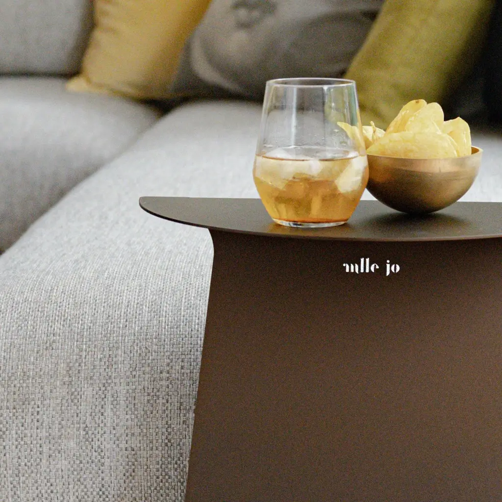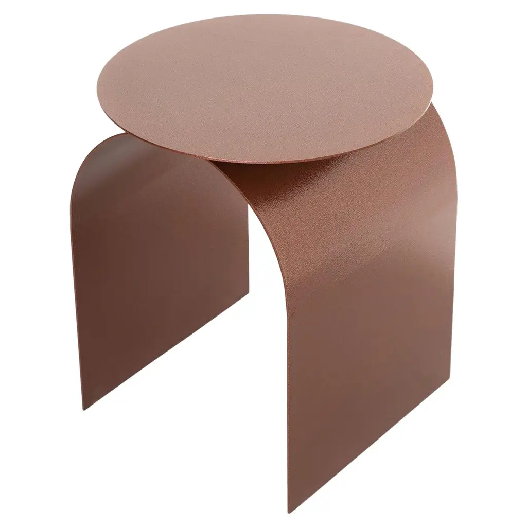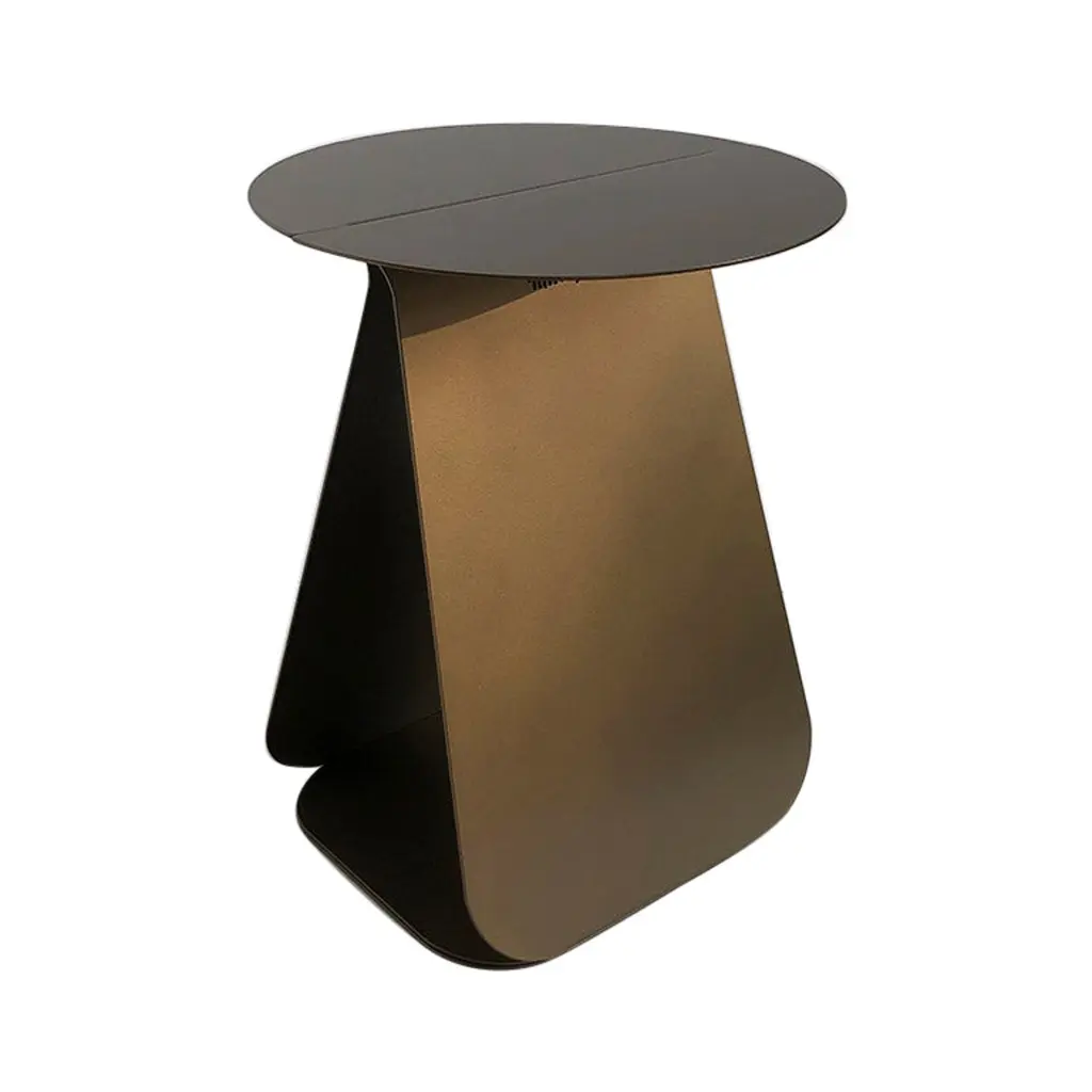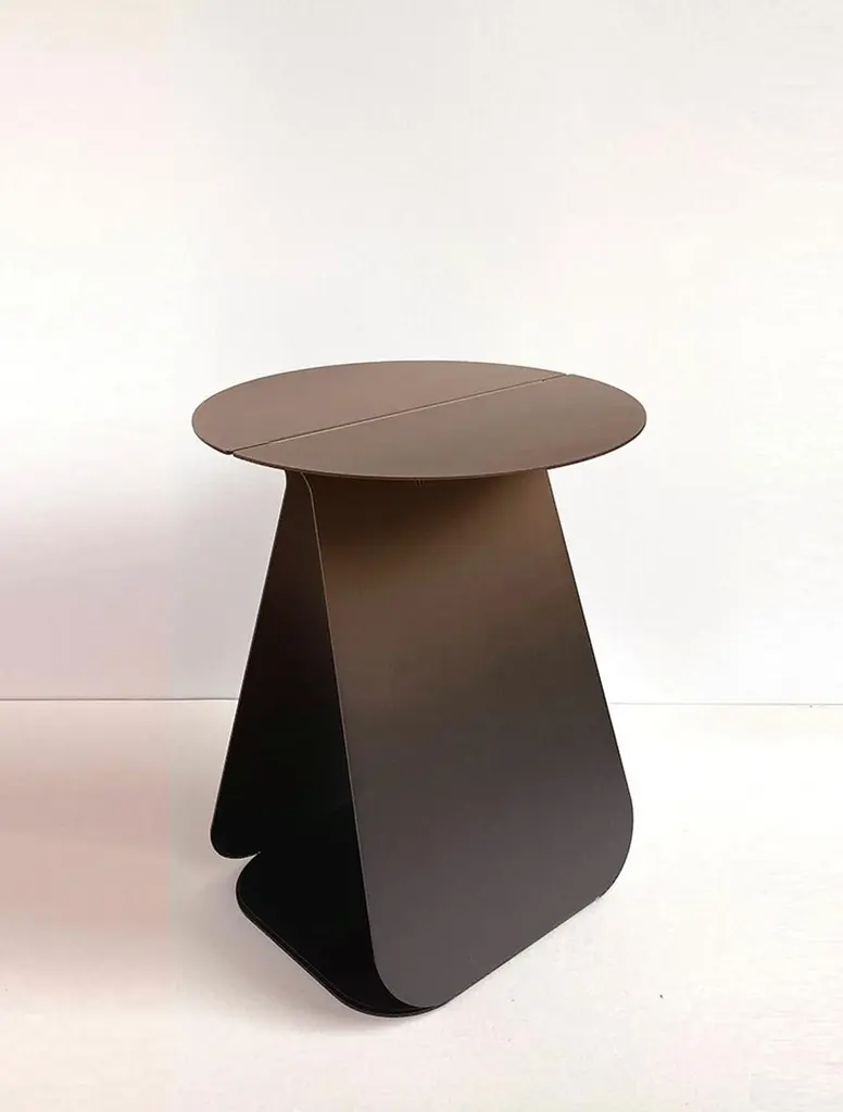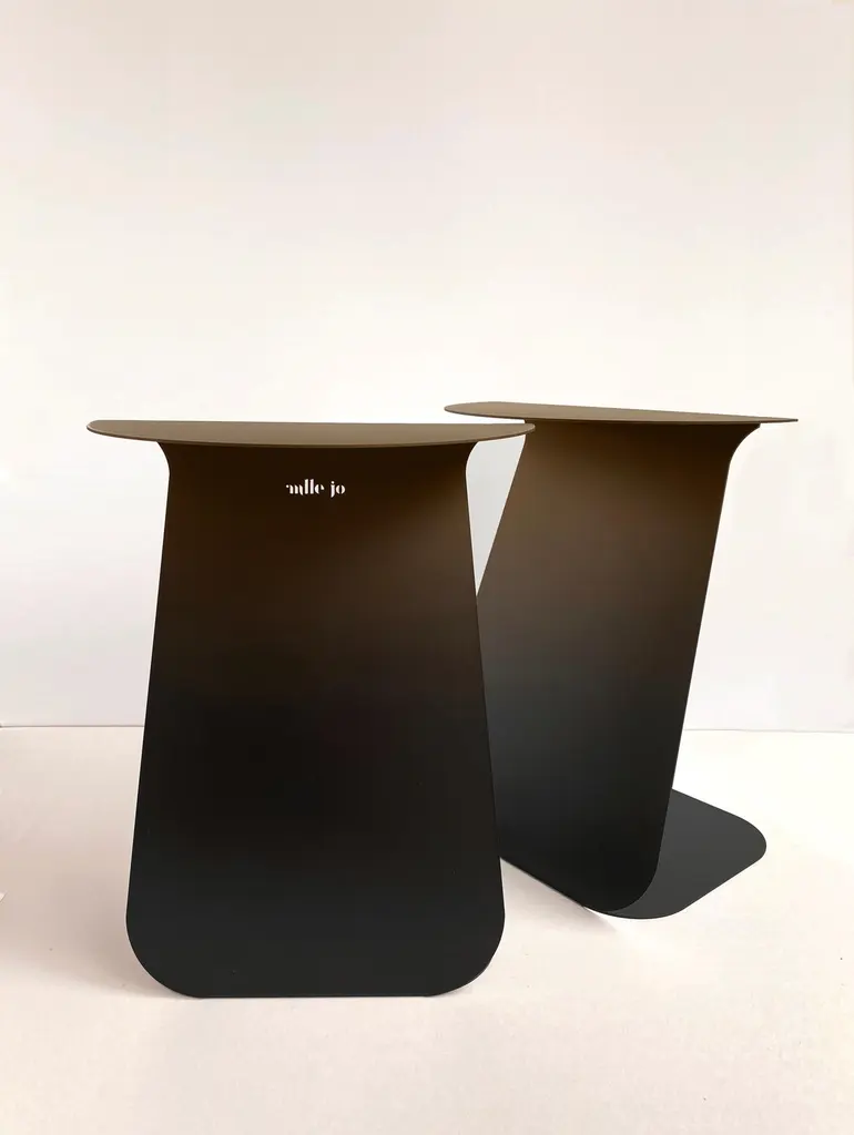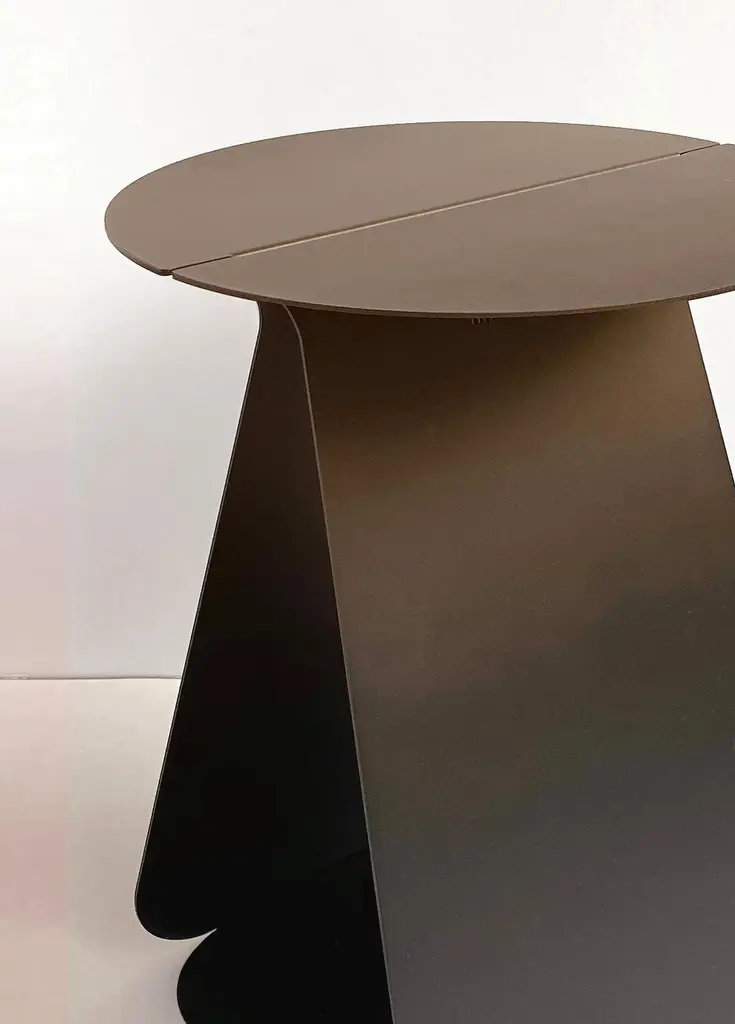 YOUMY Round Shaded Side Table by Mademoiselle JoDimensions: Ø 36 x H 43 cm.Materials: Shaded steel.Also available in different colors and finishes. Round symmetrical or rectangular asymmetrical version. Available in two versions and several colors. Please contact us.Design round side table, in cut and folded steel. Composed of two symmetrical parts, which can be separated or fitted together. The element with the logo is placed above the other element.Designed like an origami folding, YOUMY can be assembled and separated as you wish. The YOUMY side table was born from the observation that a coffee table was not practical to share cozy moments with friends, because some people were too far from the table to enjoy the drinks and appetizers.The designer created an innovative system, a side table that can be divided in two so that all guests can keep their glasses close to them.You & Me, YOUMY.Cut, folded and lacquered steel side table, composed of two parts.With the foot placed under the edge of the sofa, it integrates usefully in your living room. Trained as a stylist at La Cambre, I have worked for 25 years to create trends, colours and fabrics for the world of lingerie. Architecture has always been my passion and as such, object design has become an obvious path for me.My approach is based on intuition, with a fascination for the material and the intention to offer something beautiful and different. My vision delicately intertwines heritage and technology, aiming to offer creations at the right price, designed to last and be transmitted, while trying to produce as local as possible and to highlight our know-how.A responsible commitment for a sustainable product.We offer products produced with great care in Belgium and Europe. Useful creations that make you smile, creations you pass on, objects that will have multiple usages in their different lives following the imagination of their owner.