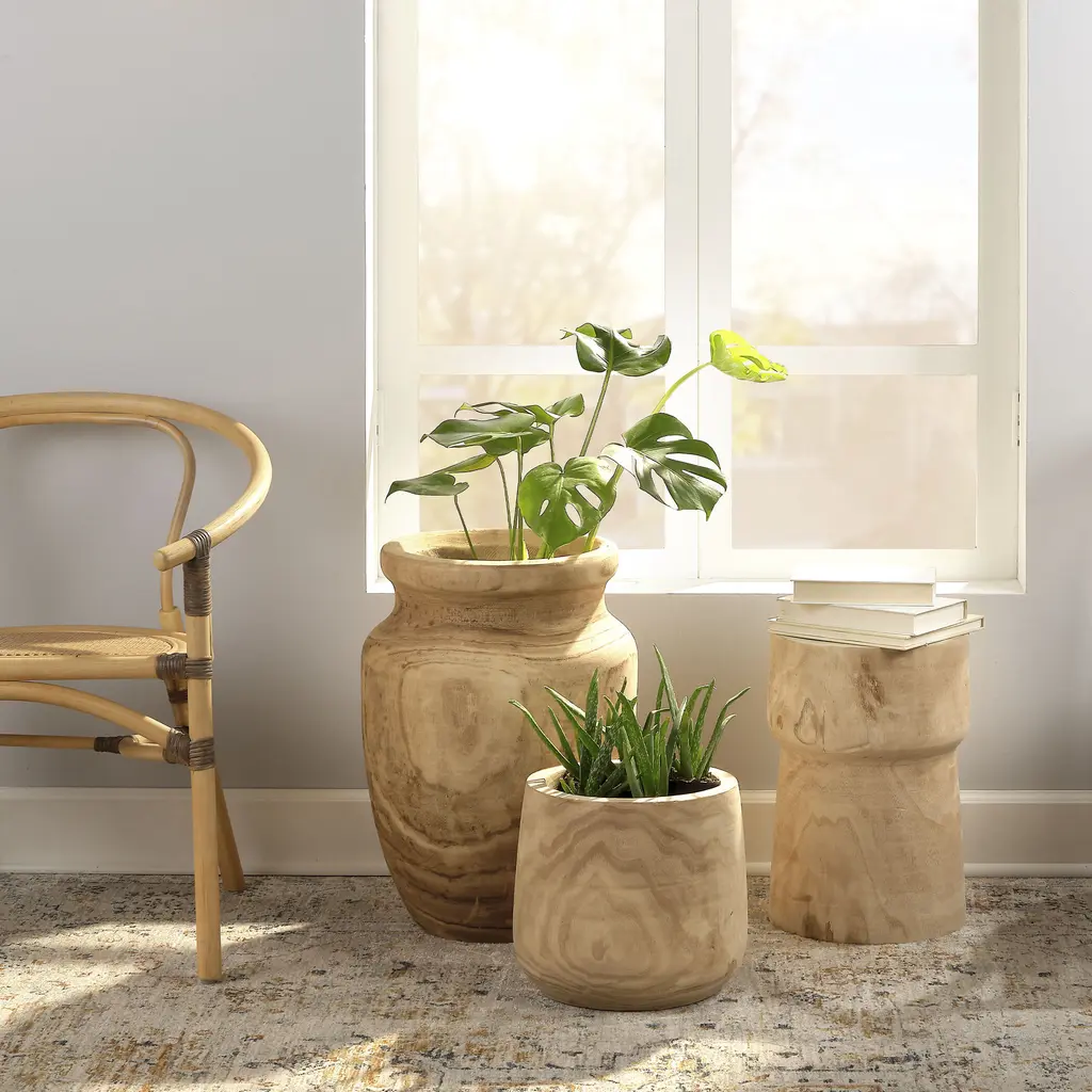 The Yucca Side Table was carved from solid wood and left unfinished to create a sleek outdoor-inspired statement. The natural wood grain in this piece takes center stage while its light wash gives it a versatile appearance.