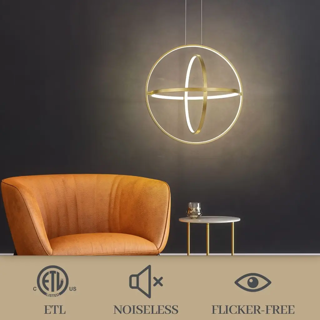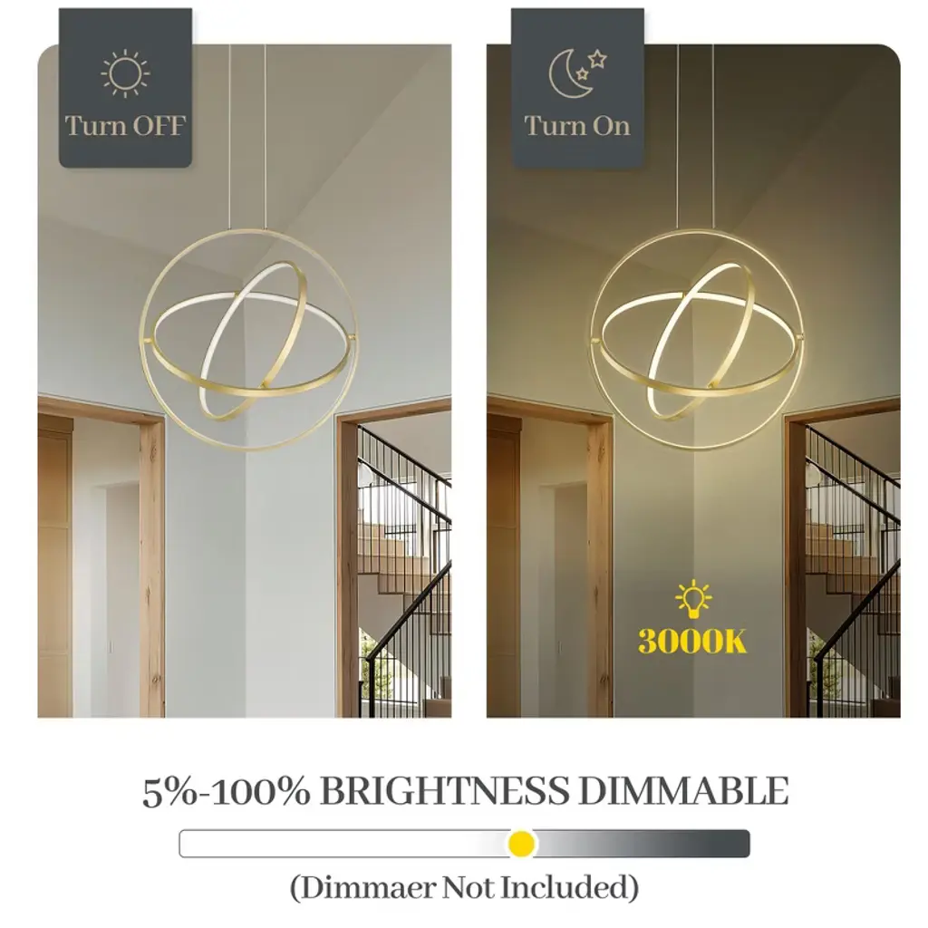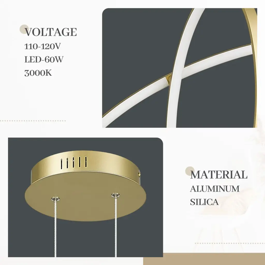 Bring modern elegance to your space with this stunning 60-watt gold LED pendant light. Featuring a unique 3-ring silhouette, warm 3000K lighting, and dimmable brightness, this fixture is perfect for dining rooms, living spaces, or offices. Built-in LEDs and adjustable height offer effortless style and function.