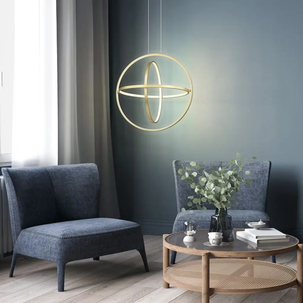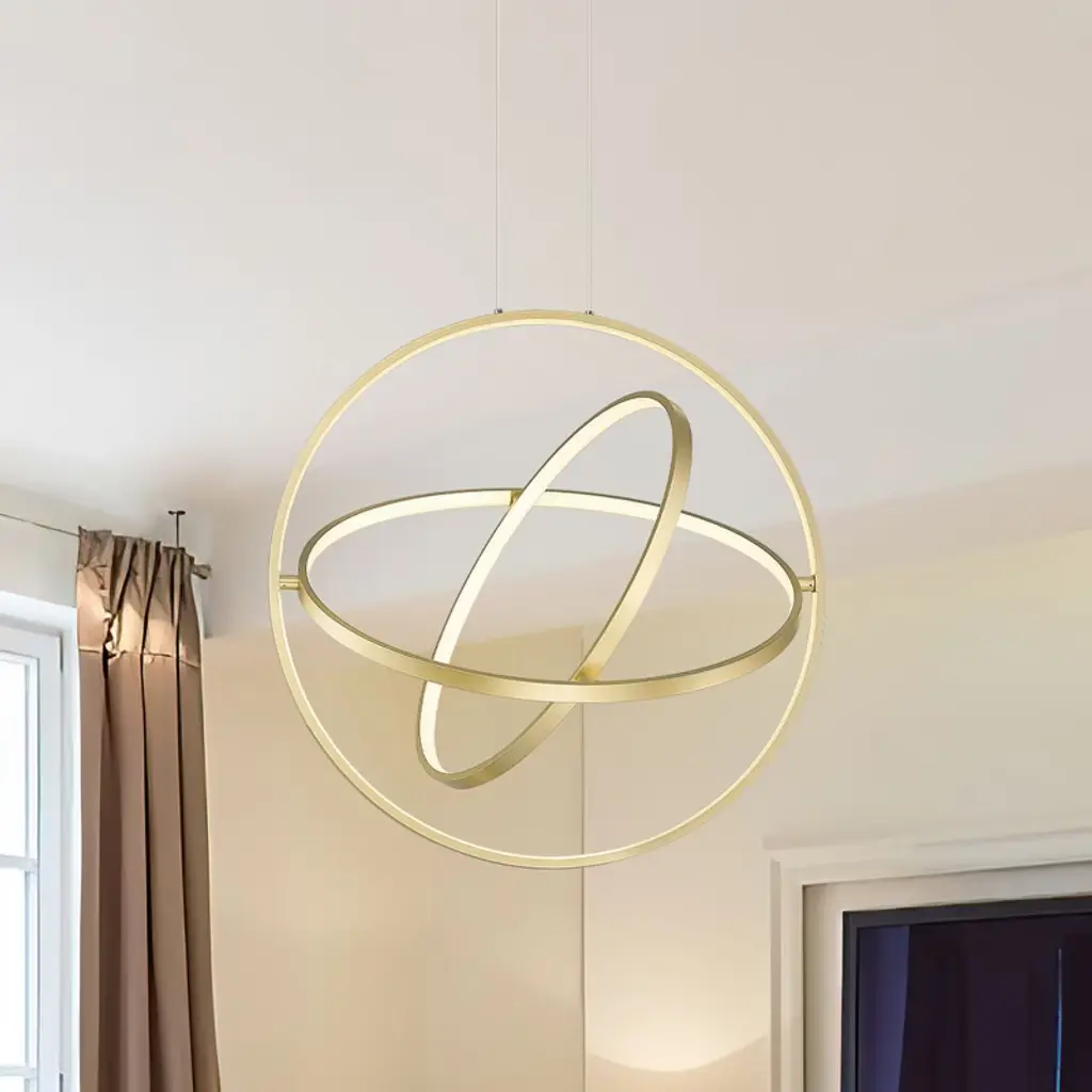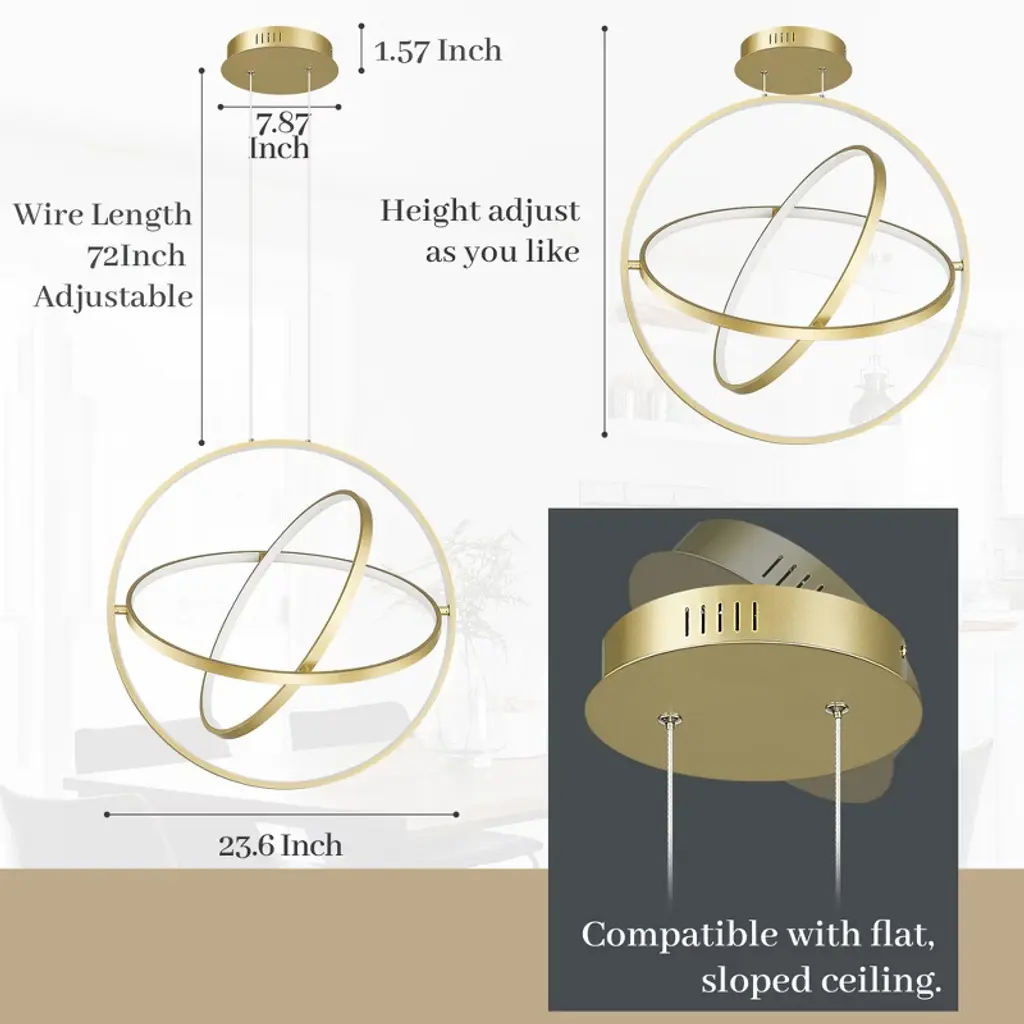 Bring modern elegance to your space with this stunning 60-watt gold LED pendant light. Featuring a unique 3-ring silhouette, warm 3000K lighting, and dimmable brightness, this fixture is perfect for dining rooms, living spaces, or offices. Built-in LEDs and adjustable height offer effortless style and function.