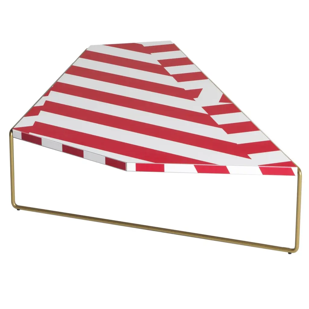 A collection of coffee tables in various sizes created as a set of two which can stand by themselves in the centre of the living room or be used as side tables, as desired. Their shapes are irregular and dynamic, available in two different heights and sizes. Just like the ziqqurat cabinet, each top comes in three different patterns made of digital printed bilaminate with contemporary, very distinctive, designs: vintage collages, optical decors, textures that interpret the weaves suggested by the creativity of current trends. The frame is in gold-coloured tubular steel. This nostalgic yet trendy choice adds elegance and charm to these pieces. Measures: 113x74x27.