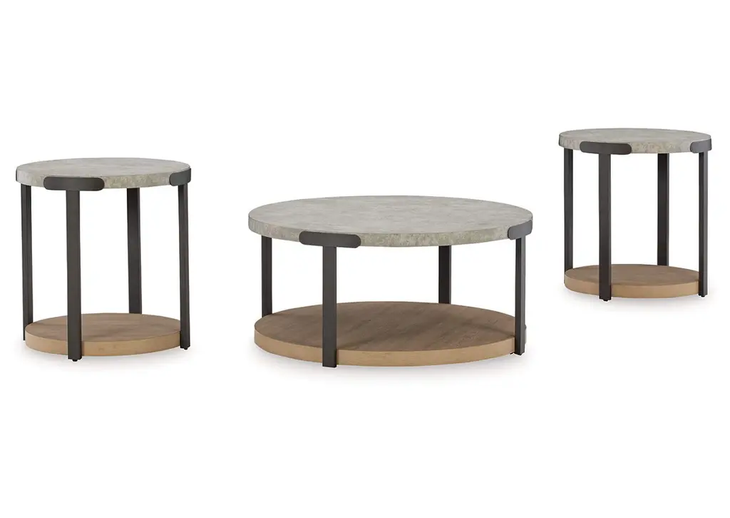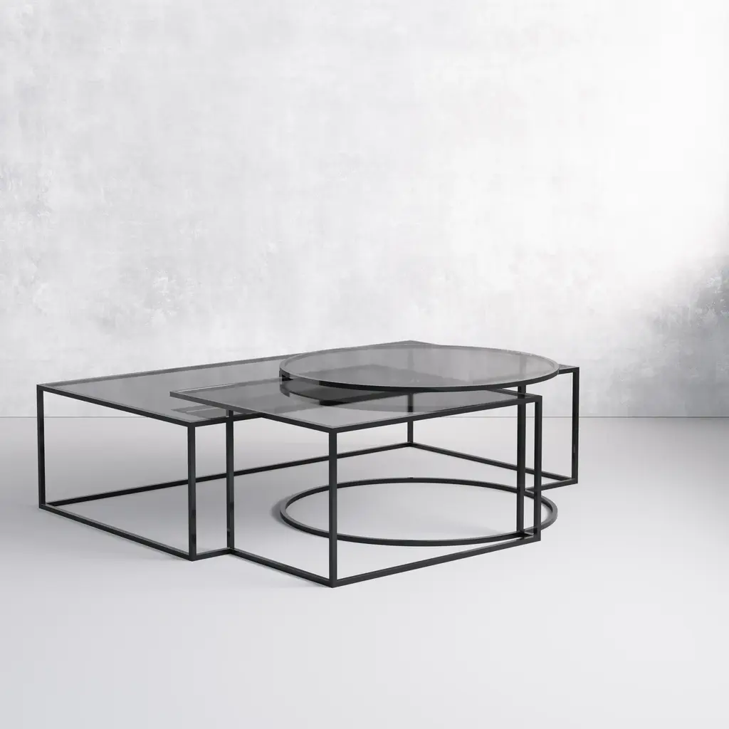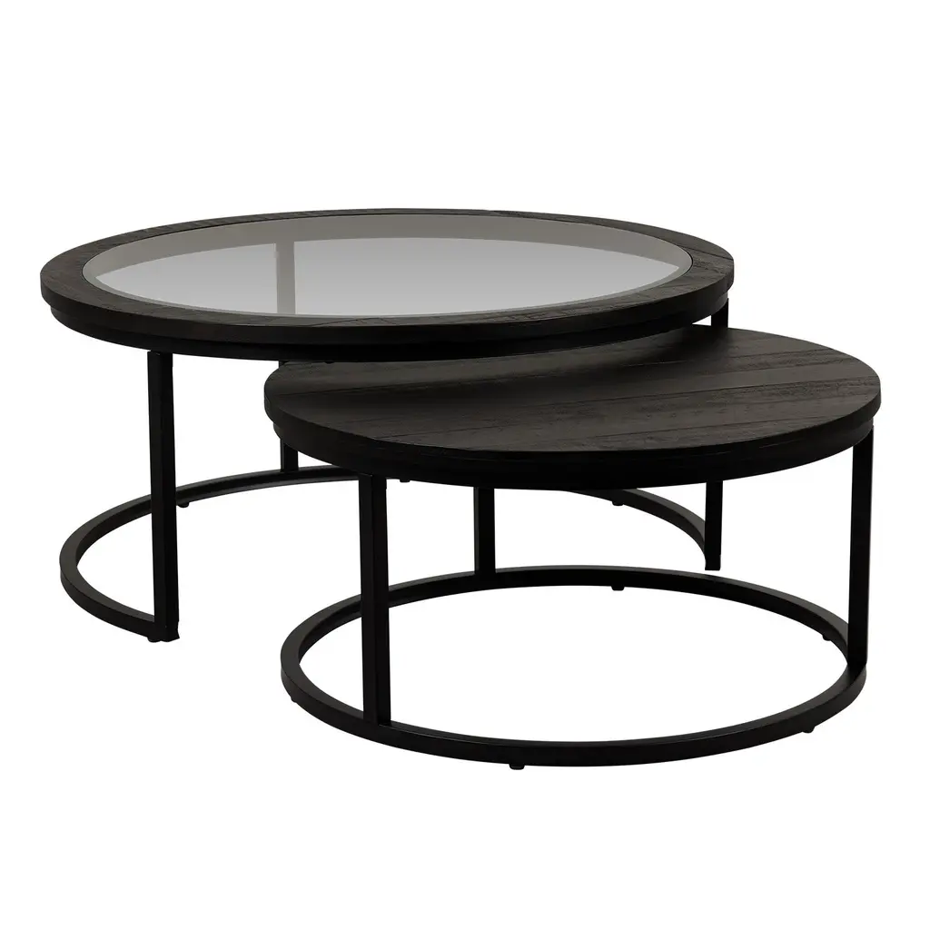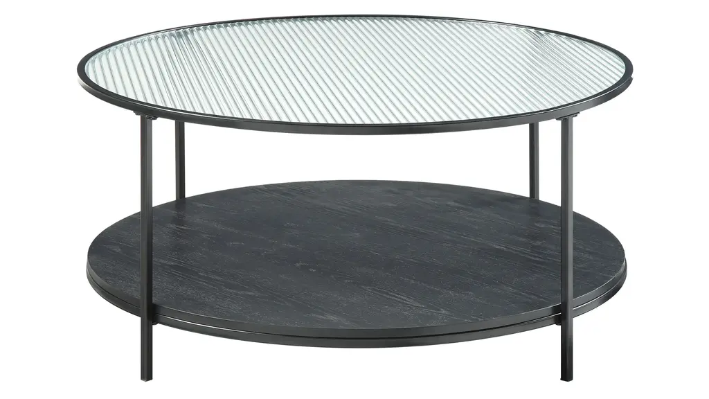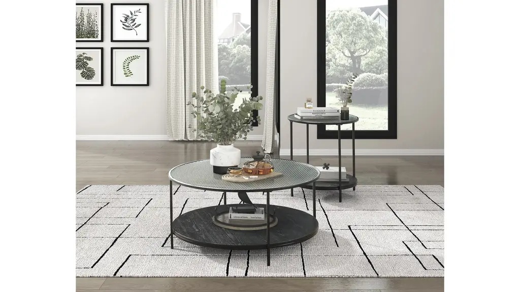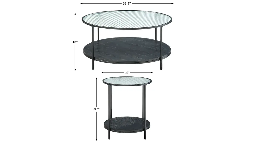 Zamir 3-pc. Occasional Tables creating distinct contrast to the round profile of the cocktail table and end table. Black-finished metal comprises the construction of the tables, serving to support the glass top and black-finished wood display shelf.
