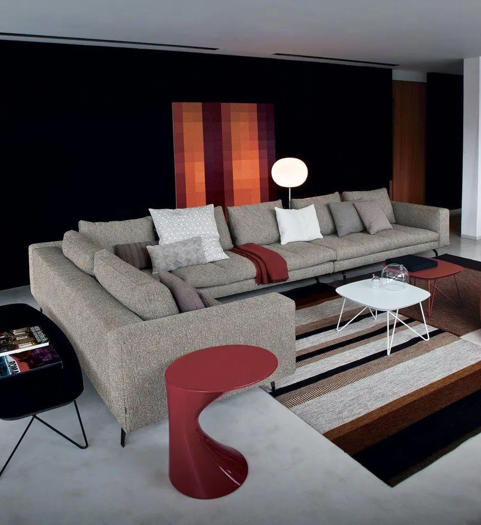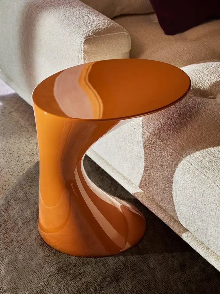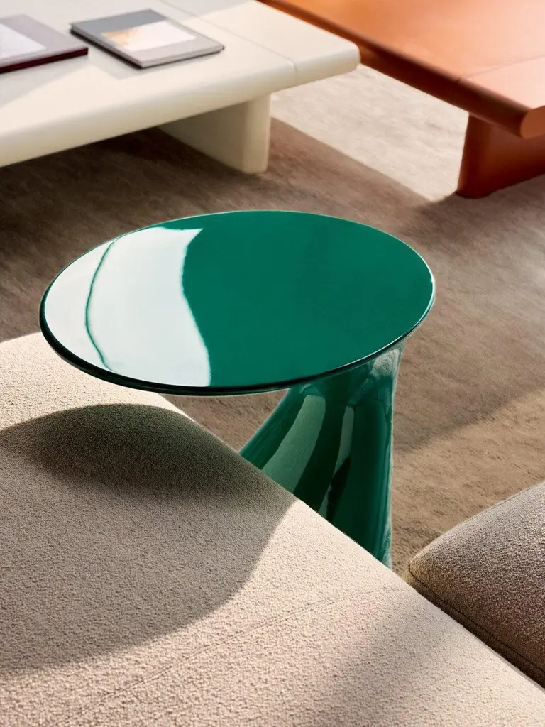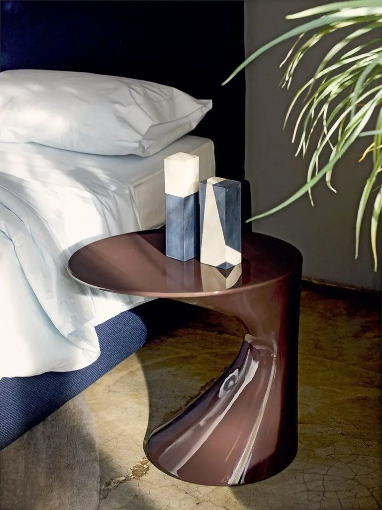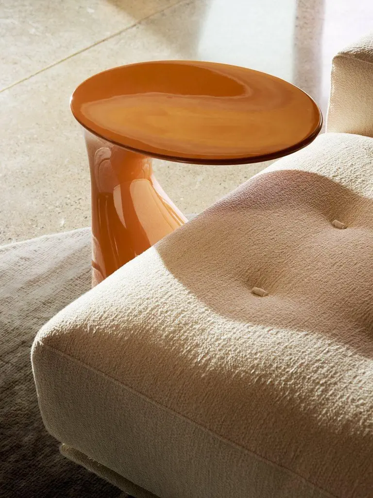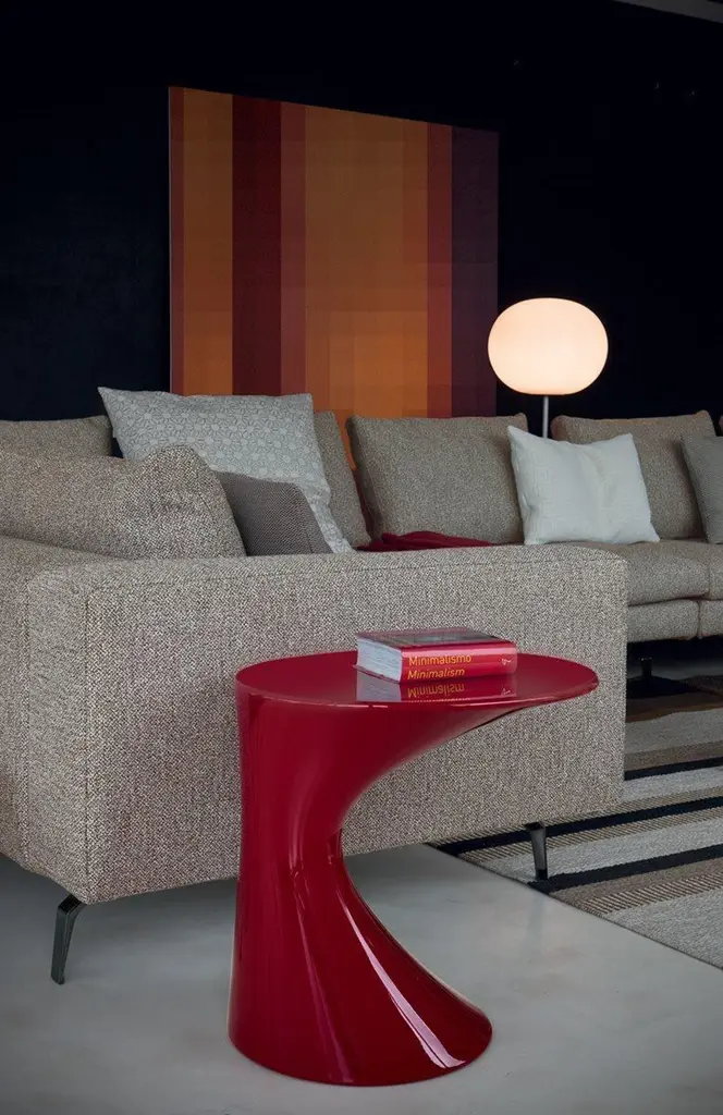 Small table. Polypropylene frame and glossy lacquer finish in the colours talc, wax, hemp, caramel, orange, amaranth, grass green, espresso or black.Organic qualityTod is entirely made of glossy lacquered polypropylene, with rotational molding process. There is a functional role of the shape stretching up to serve and be useful without taking visual or physical space. The table’s organic quality acts also a visual connection between floor and the top surface. This organic quality contrasts the usual rectangular forms of the furnishing elements it sits beside. The table is designed understanding it may never exist alone, but instead always next to something else.