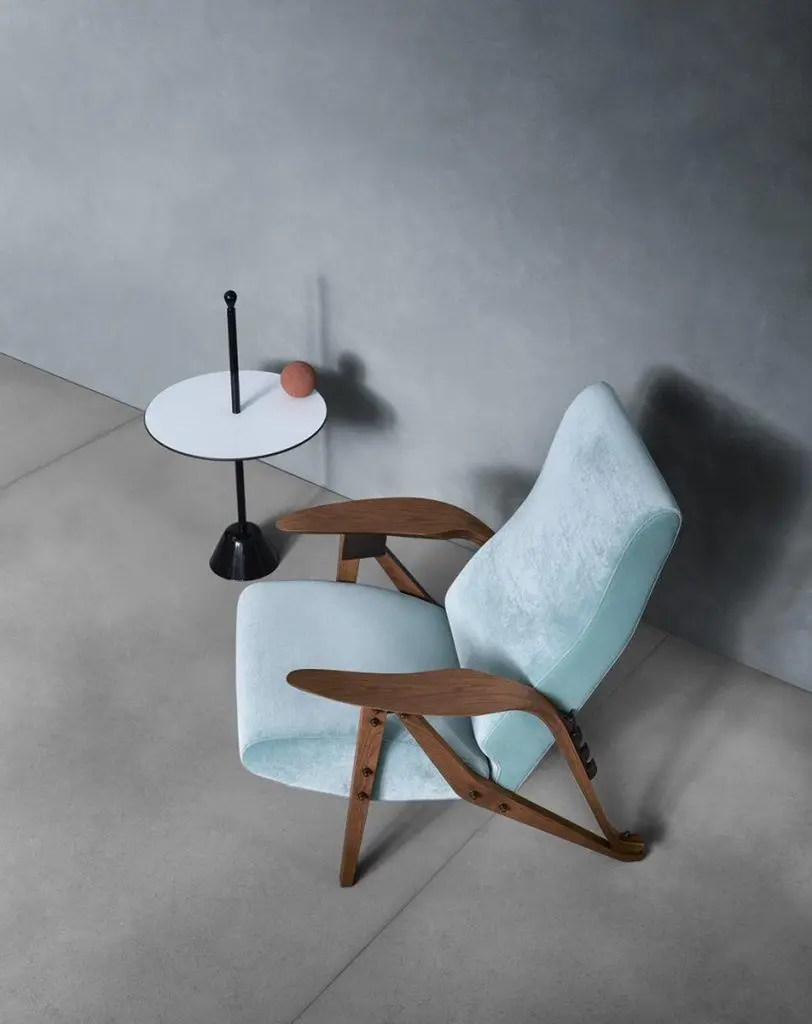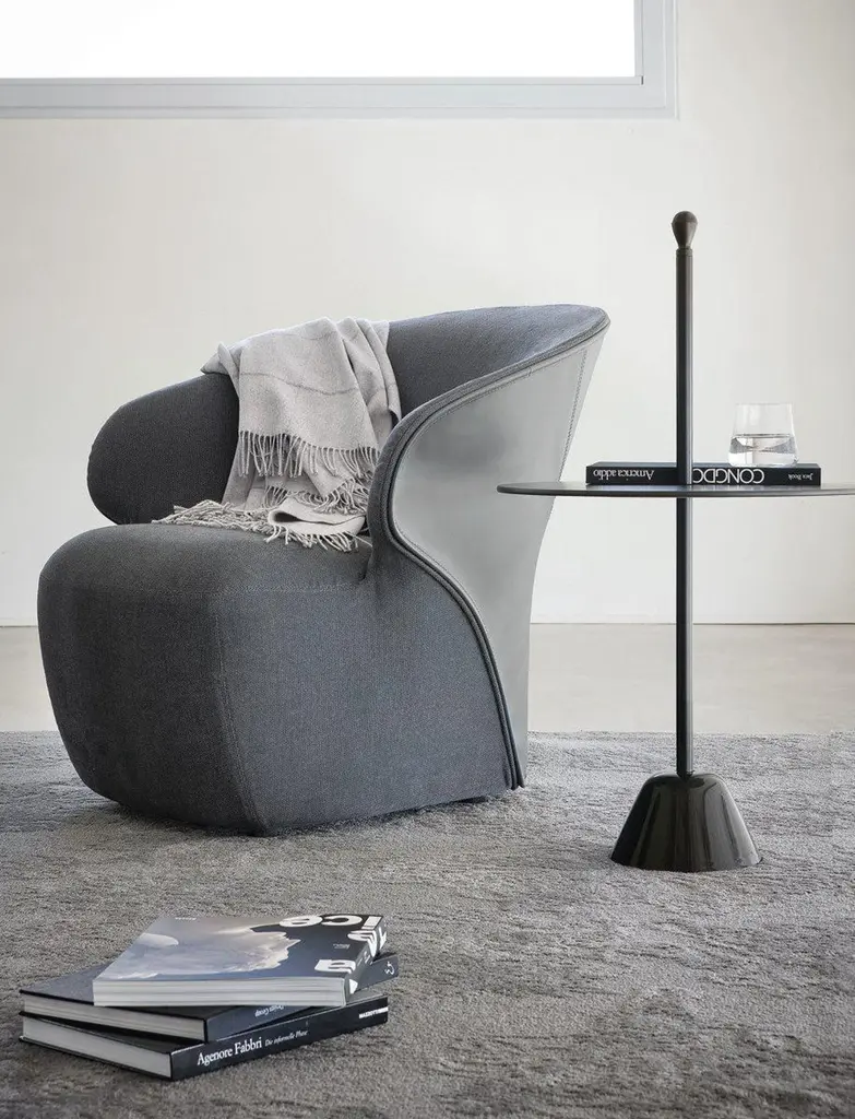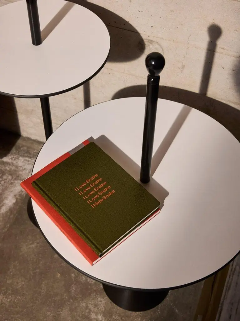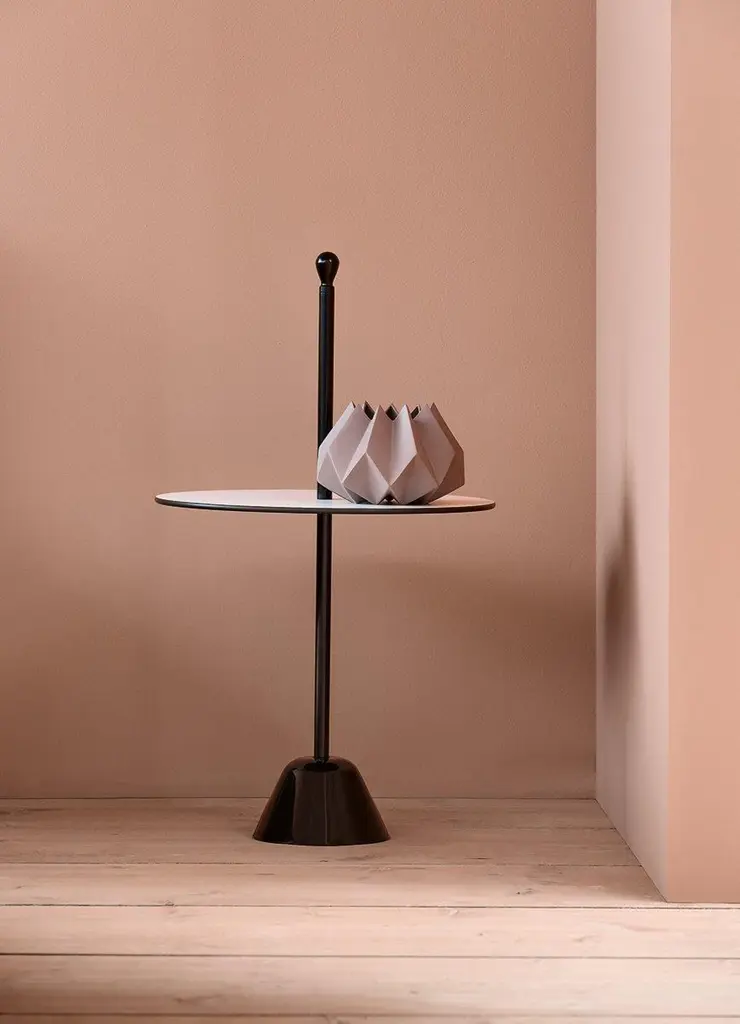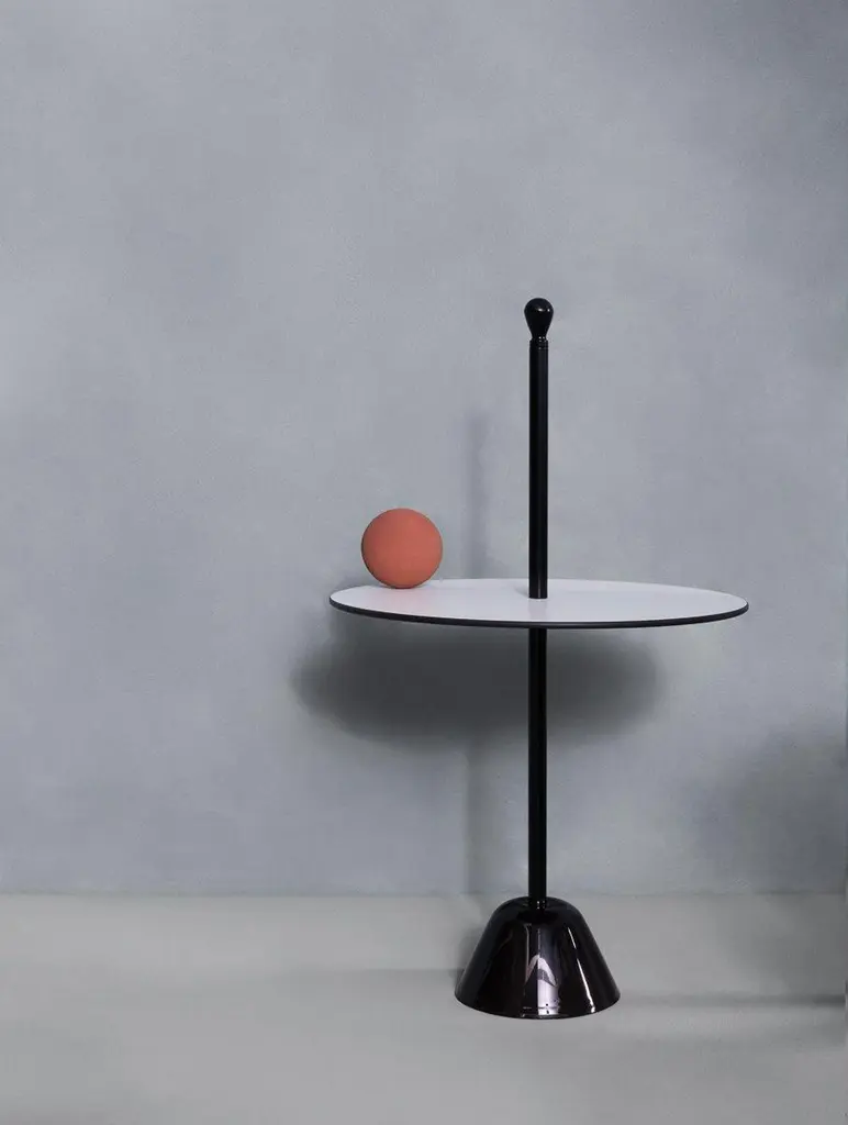 Second dimension: 50x86cmof the range Servi by Achille & Pier Giacomo Castiglioni, 1974Small table. Base in polypropylene and steel rod painted, colour talc or black. Top in reversible black/white plastic laminate.Once more, an everlasting object whose shape perfectly matches its function. It has a stable base with a very limited hindrance; a thin vertical pole with a knob at the top to hold it and a round little table at an ideal height, where to place objects. In other words Servomuto, light and easy to move, is the worthy heir of the essential stylish and balanced Cicognino by Franco Albini. It belongs to a great group of items, which all originated from the ashtray and umbrella stands explicitly designed by the Castiglioni brothers as furniture pieces for the Splügen Bräu pub/restaurant in Milan in 1961.Servomuto marked an important moment in the history of Zanotta’s production and also in Italian Design - it became the archetype of an original category of furnishing accessory.