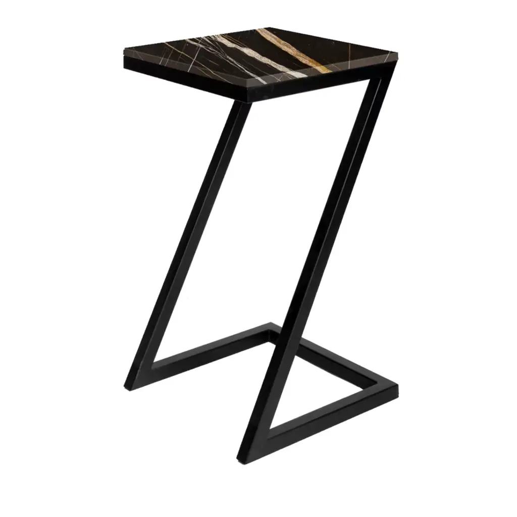 Boasting a dynamic cantilever design that reproduces the shape of the letter "Z", this refined side table will be the focal point in any contemporary context. The prized, thick top in Sahara Noir marble was deftly finished by hand, its unique, warm veining interrupting the darkness of the backdrop that perfectly harmonizes with the solid black lacquer of the hand-soldered iron base. Also available in gray or gold finish as well as in other marble types, please ask the Concierge details.