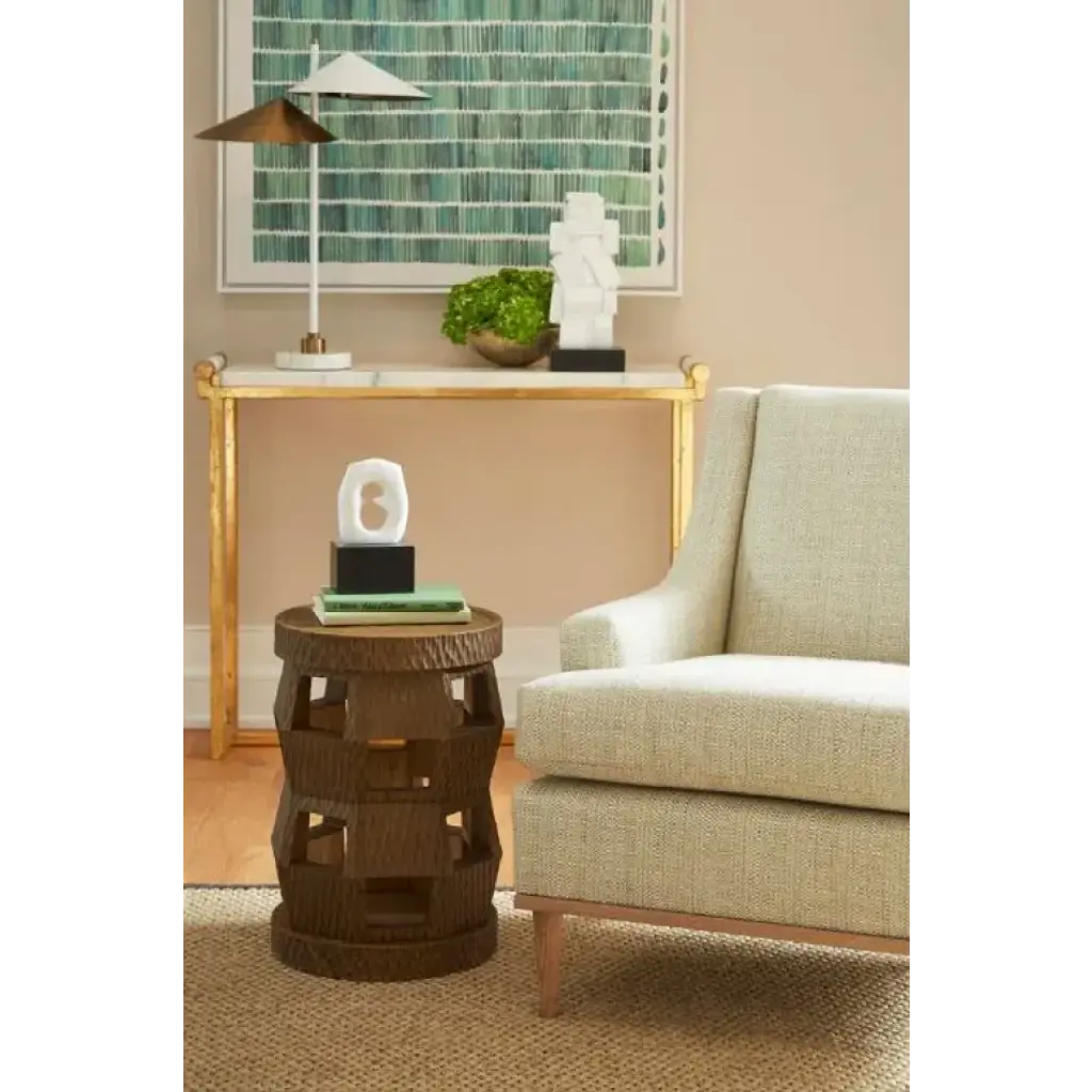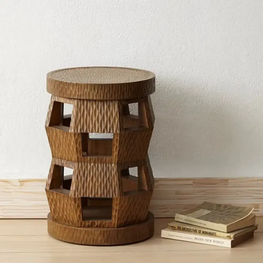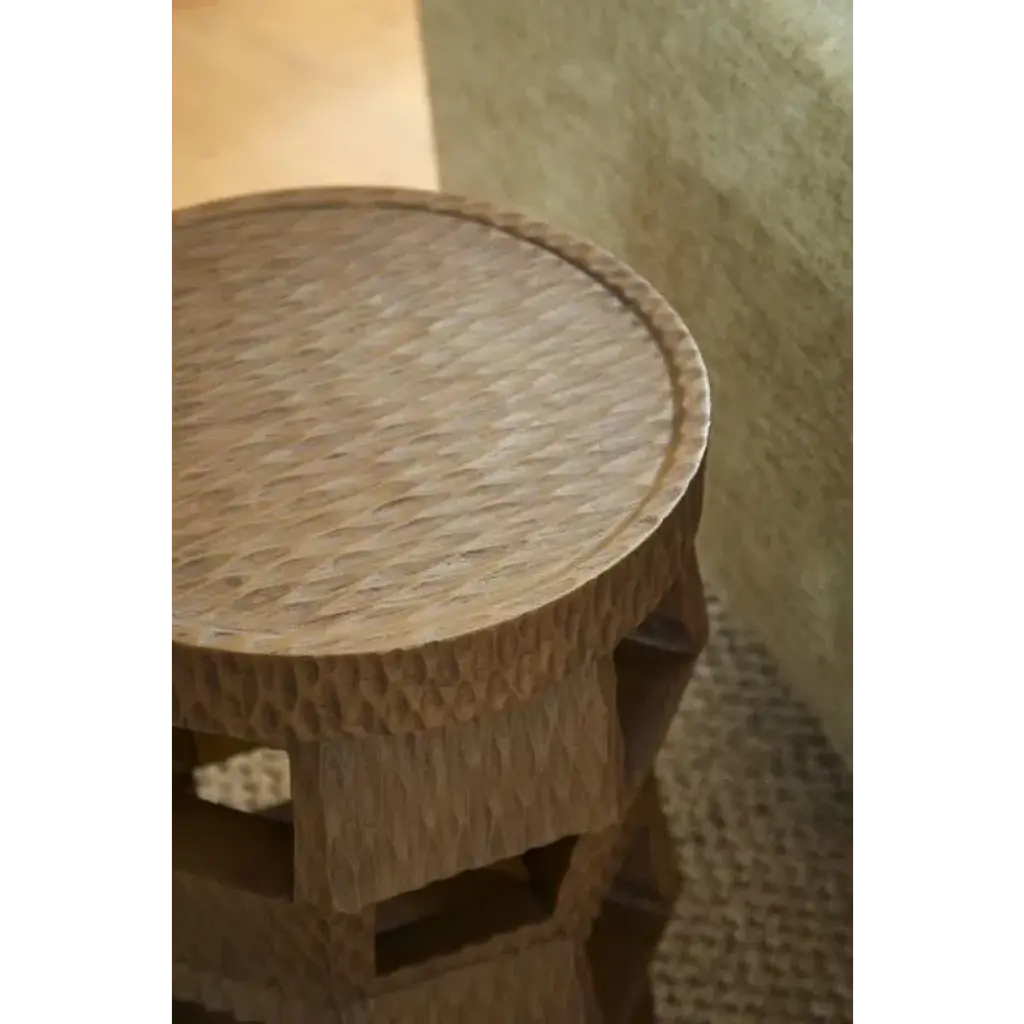 With the Zanzibar, our artisans have incorporated a bold blend of global influences to create an intricate showpiece with handcrafted, earthy appeal. The versatile furnishing, which can be used as a side table or garden stool, features a dynamic design of angled planes and artfully placed pockets of negative space. The result is a geometric silhouette that appears like a folk pattern rendered in three dimensions. An all-over, hand-chiseled motif gives the solid mahogany an extra layer of organic texture while a smooth lacquered finish adds modern polish. The Zanzibar’s architectural yet airy profile is grounded by the solid, circular forms of its top and base. The piece seamlessly blends into eclectic, globally-sourced collections but can also supply a funky dose of personality in more buttoned-up decor schemes.