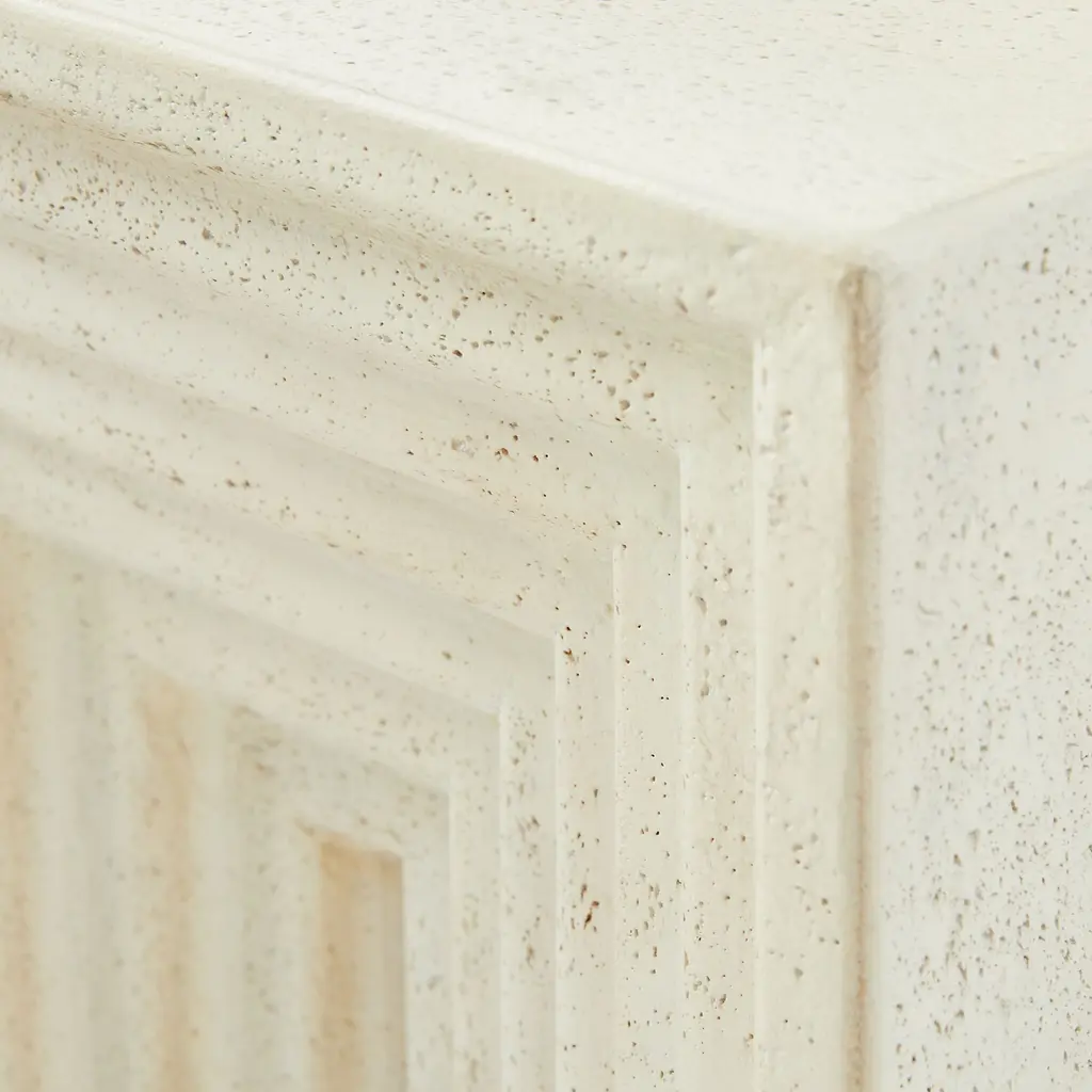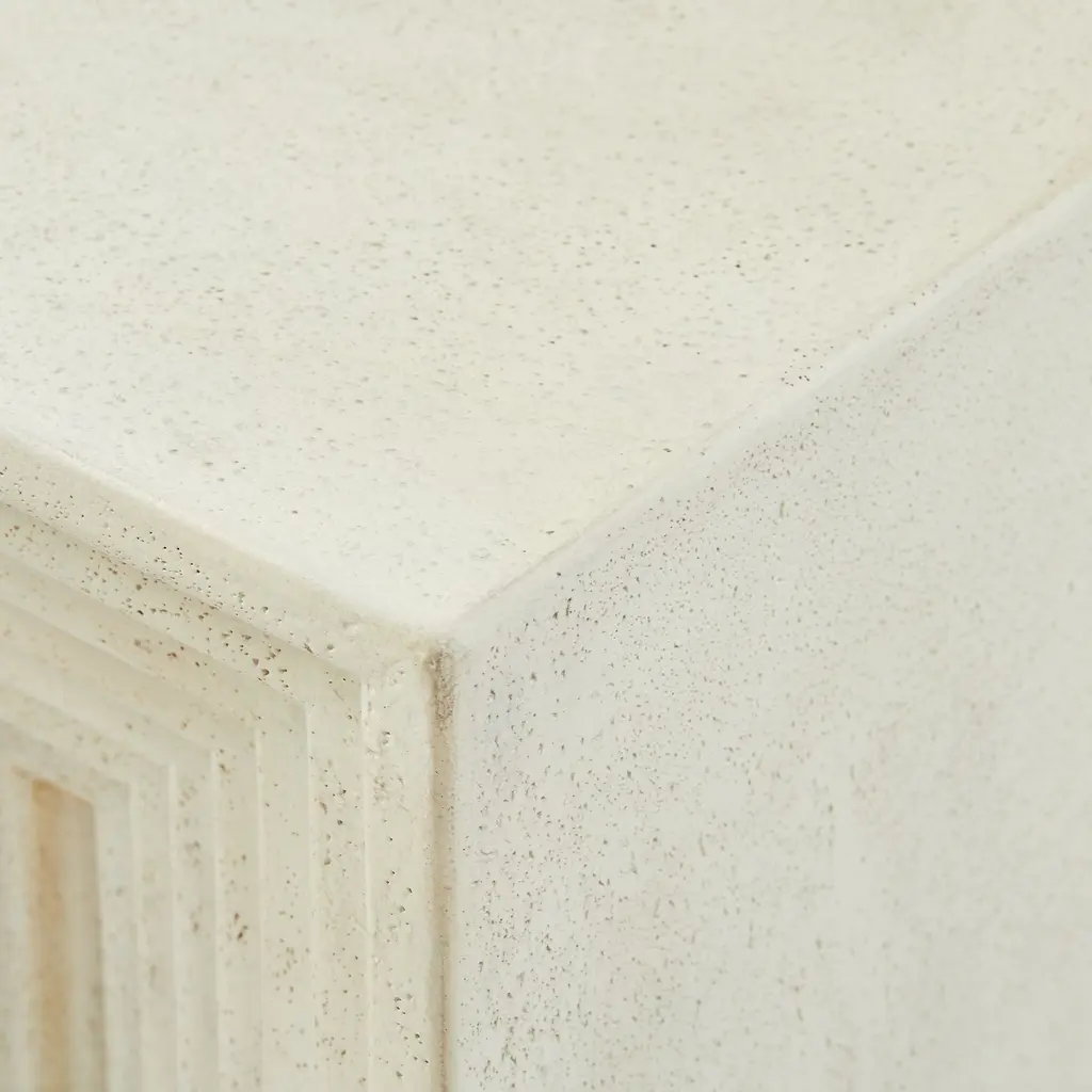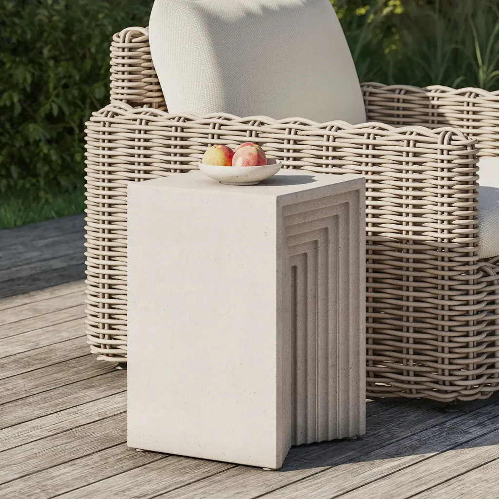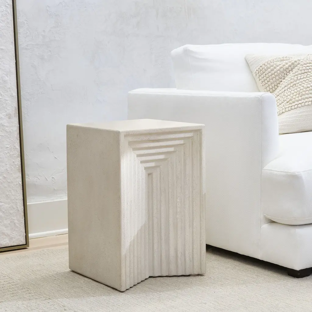 Brings a striking natural element to your space. A geometric carved pattern draws the eye. Durable enough to work both indoors and out. Each is hand cast and finished in the Philippines.