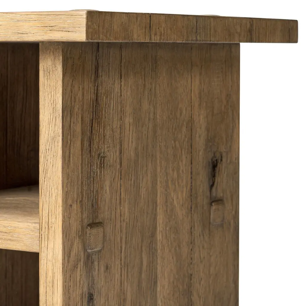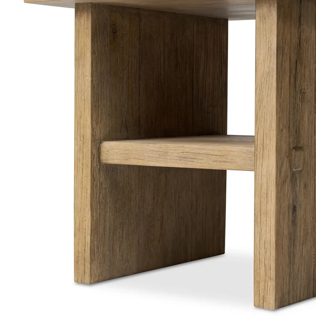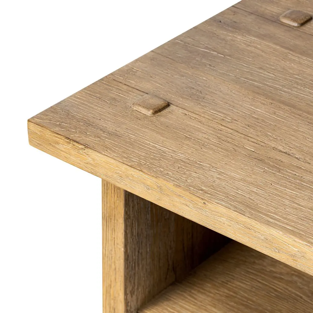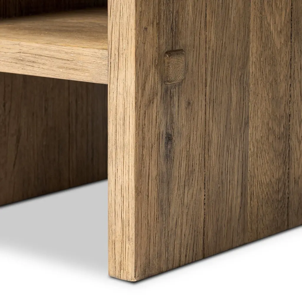 A design collaboration by Amber Lewis and Four Hands. Simply shaped, material driven. Made from distressed, light-finished oak, with natural knots and graining, a paneled end table features pull-through joinery. Perfectly sized to keep your favorite book or drink within reach, with lower shelving for bonus storage in any room.