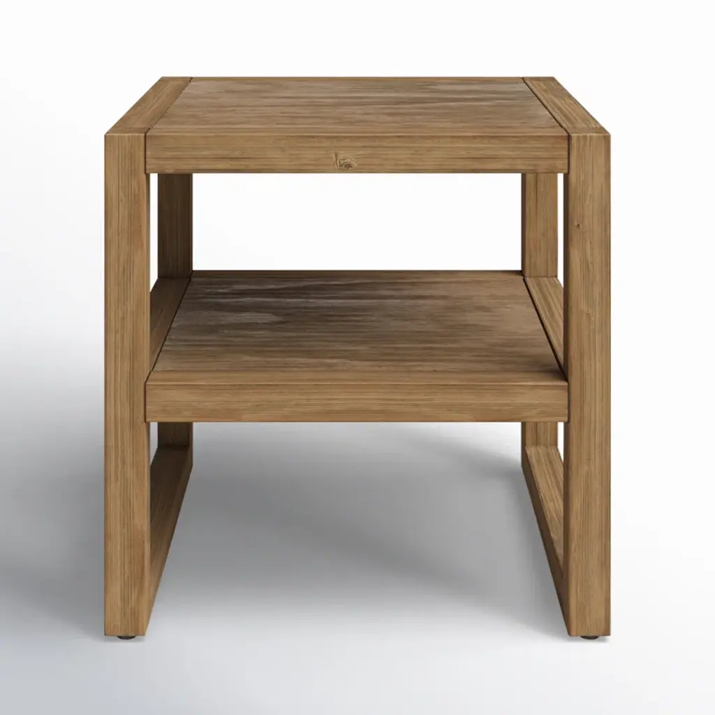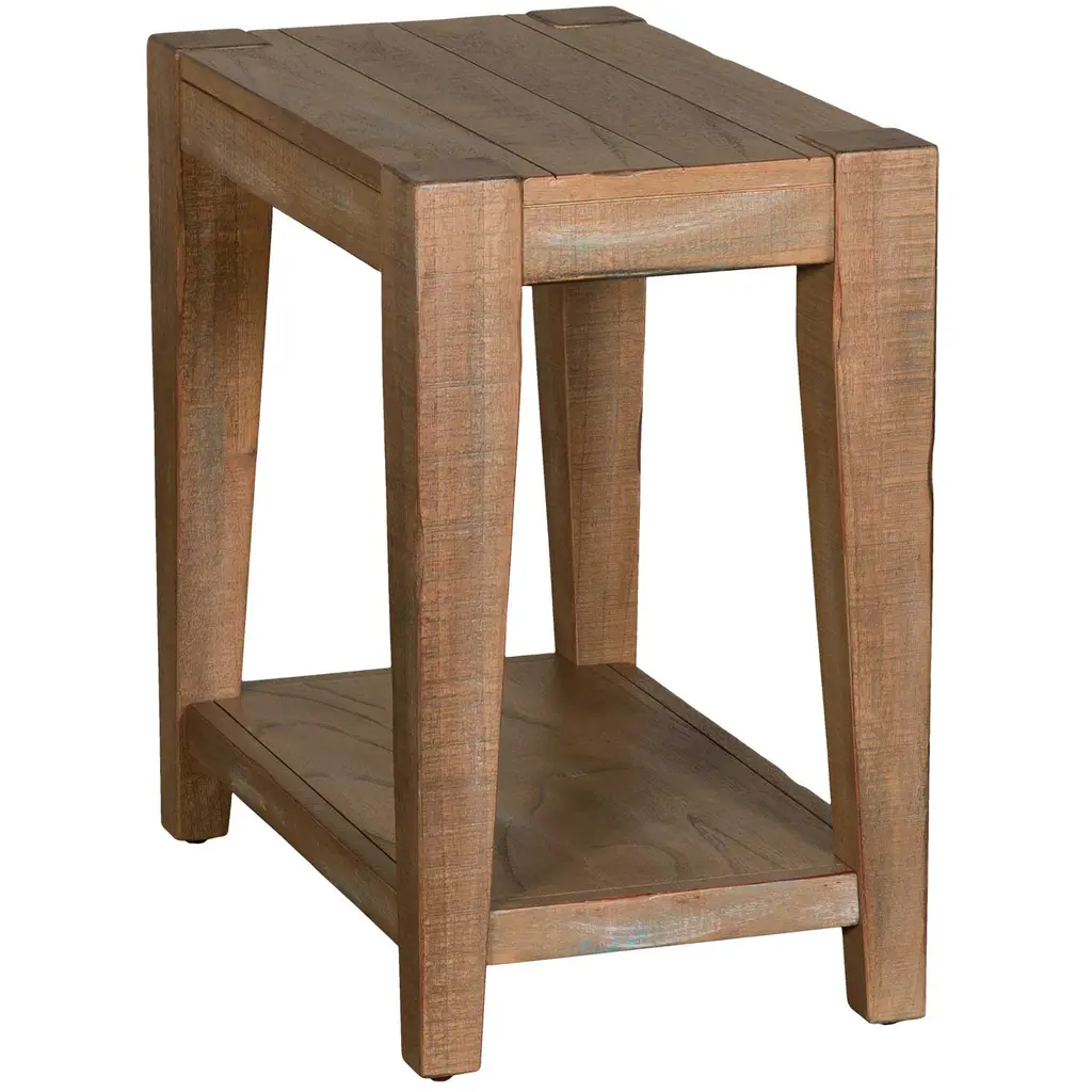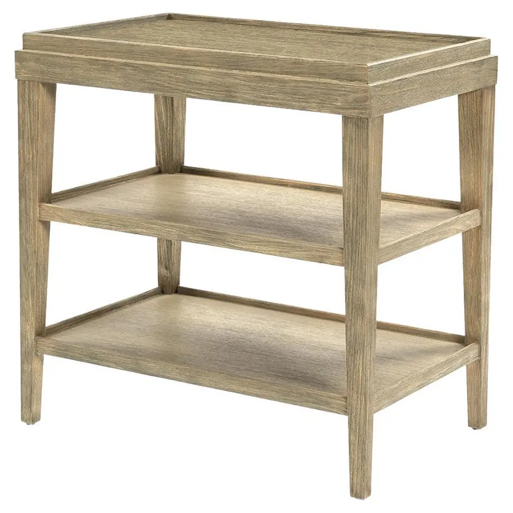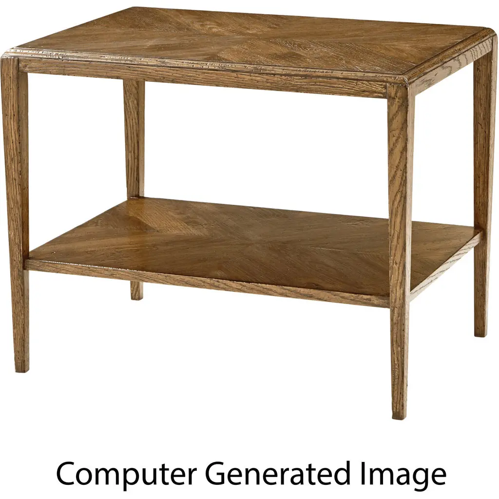 A design collaboration by Amber Lewis and Four Hands. Simply shaped, material driven. Made from distressed, light-finished oak, with natural knots and graining, a paneled end table features pull-through joinery. Perfectly sized to keep your favorite book or drink within reach, with lower shelving for bonus storage in any room.