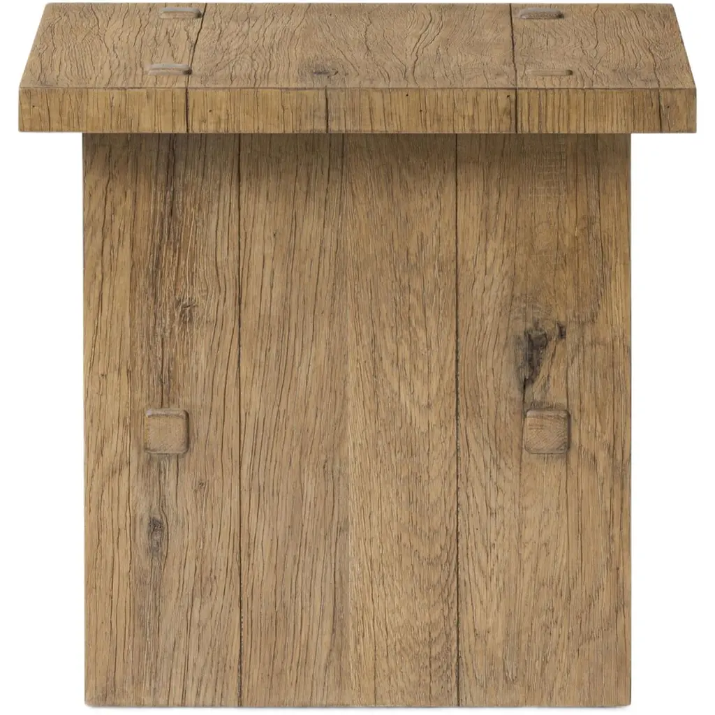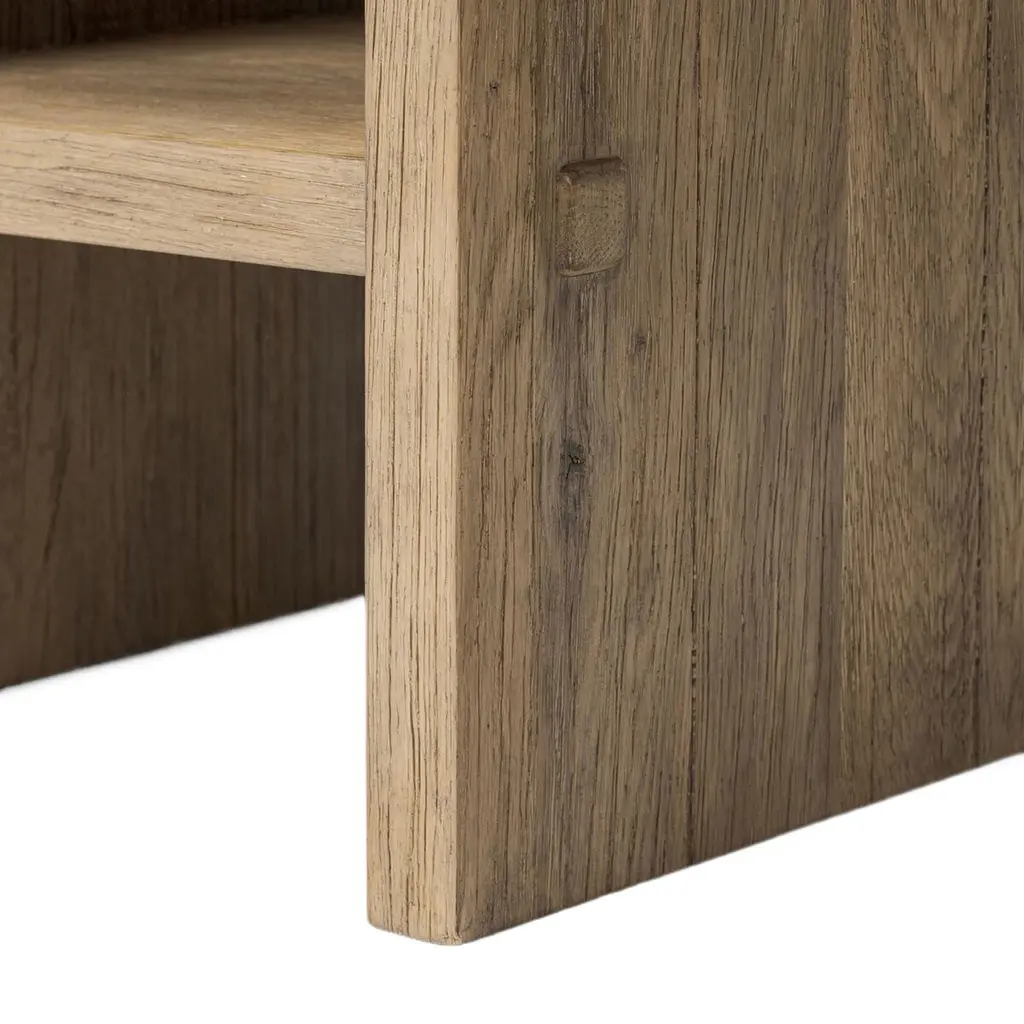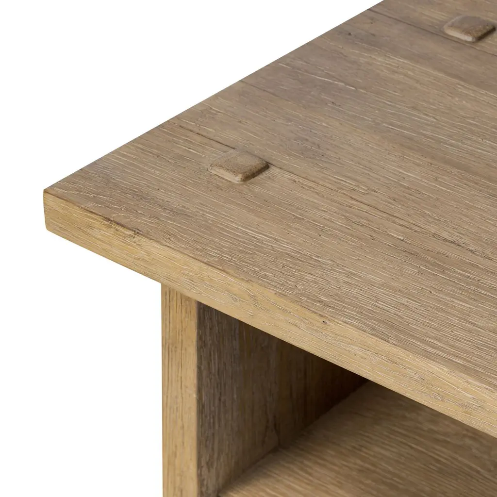 Simply shaped, material driven. A paneled end table features pull-through joinery, perfectly sized to keep your favorite book or drink within reach, with lower shelving for bonus storage in any room. A design collaboration by Amber Lewis and Four Hands.
