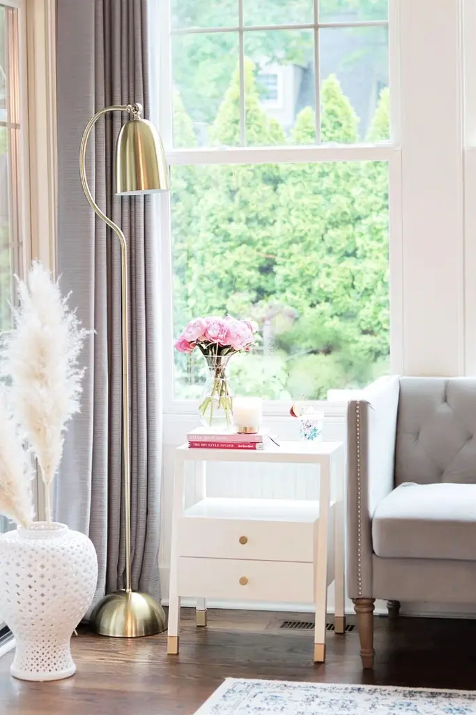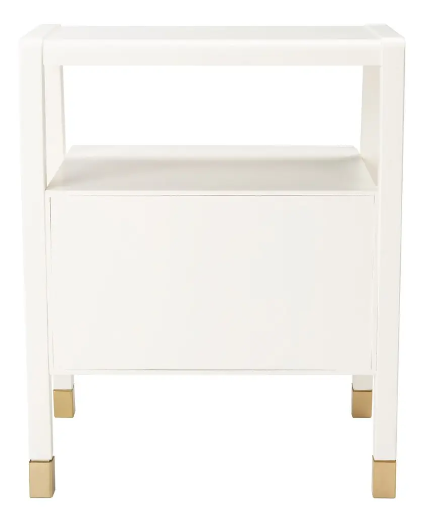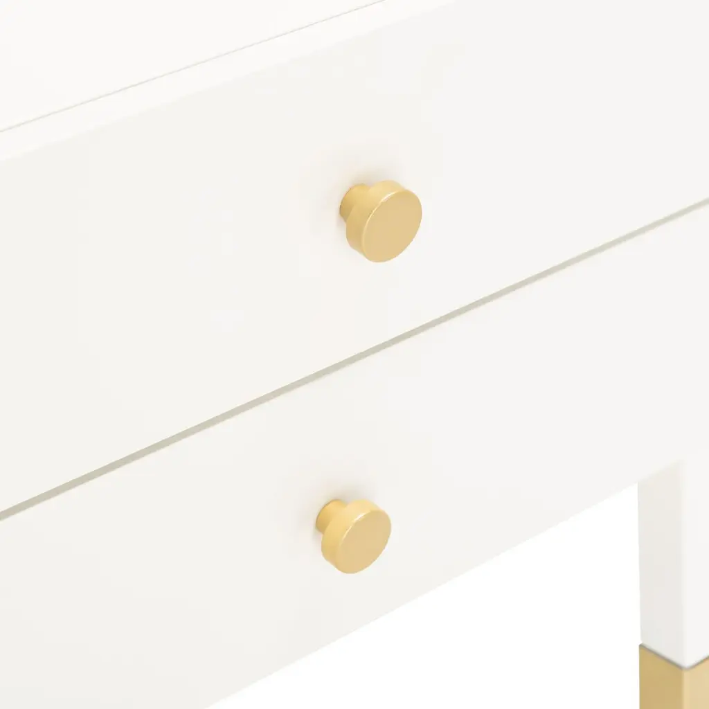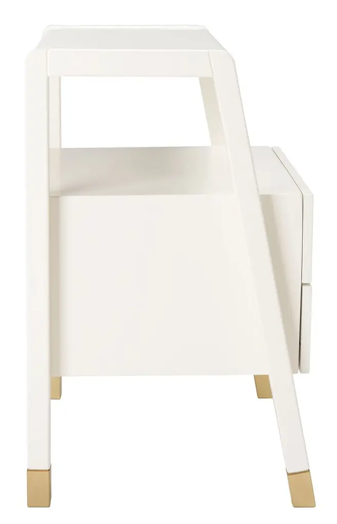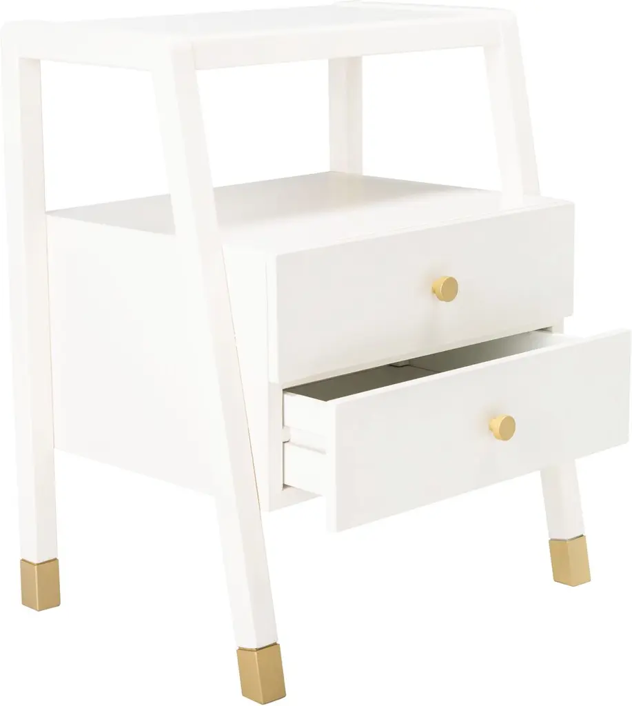 Angled front legs give this side table an element of surprise, while the golden ferrules and drawer pulls provide a dash of glamour. In addition to two drawers, the table has a shelf for added storage or display space.