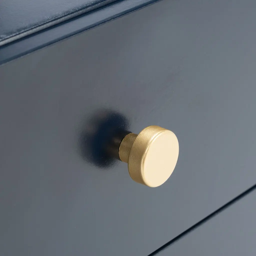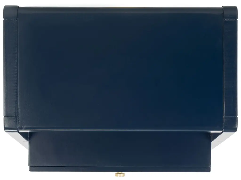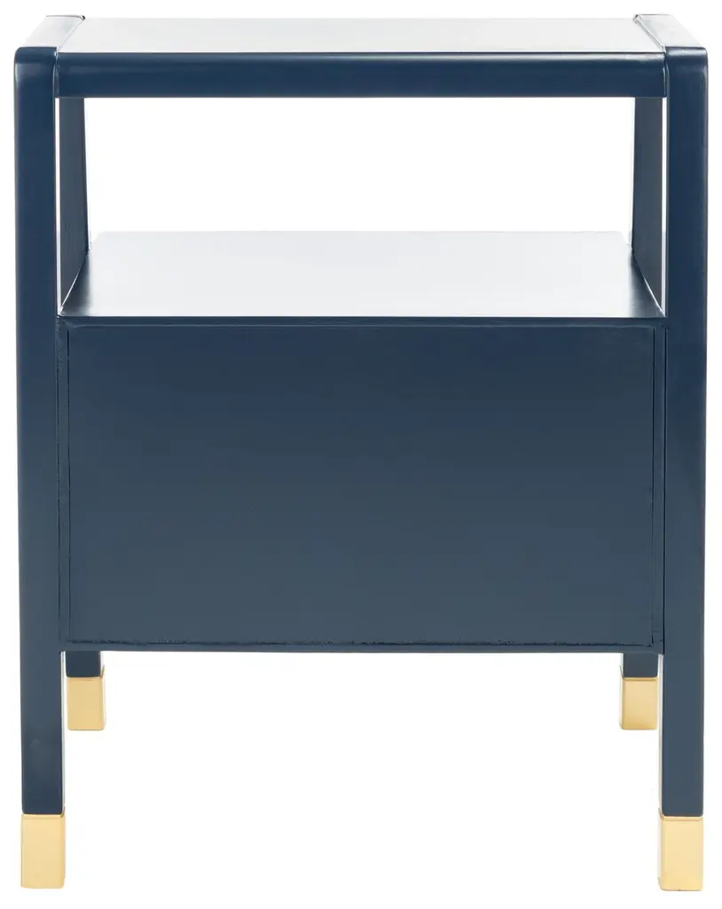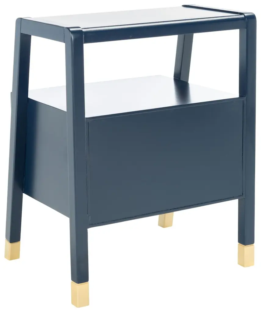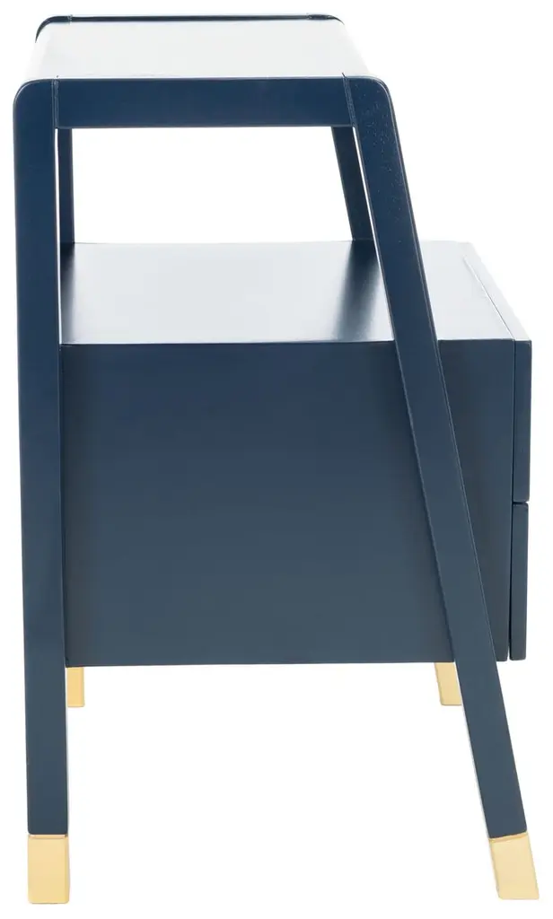 Angled front legs give this side table an element of surprise, while the golden ferrules and drawer pulls provide a dash of glamour. In addition to two drawers, the table has a shelf for added storage or display space.