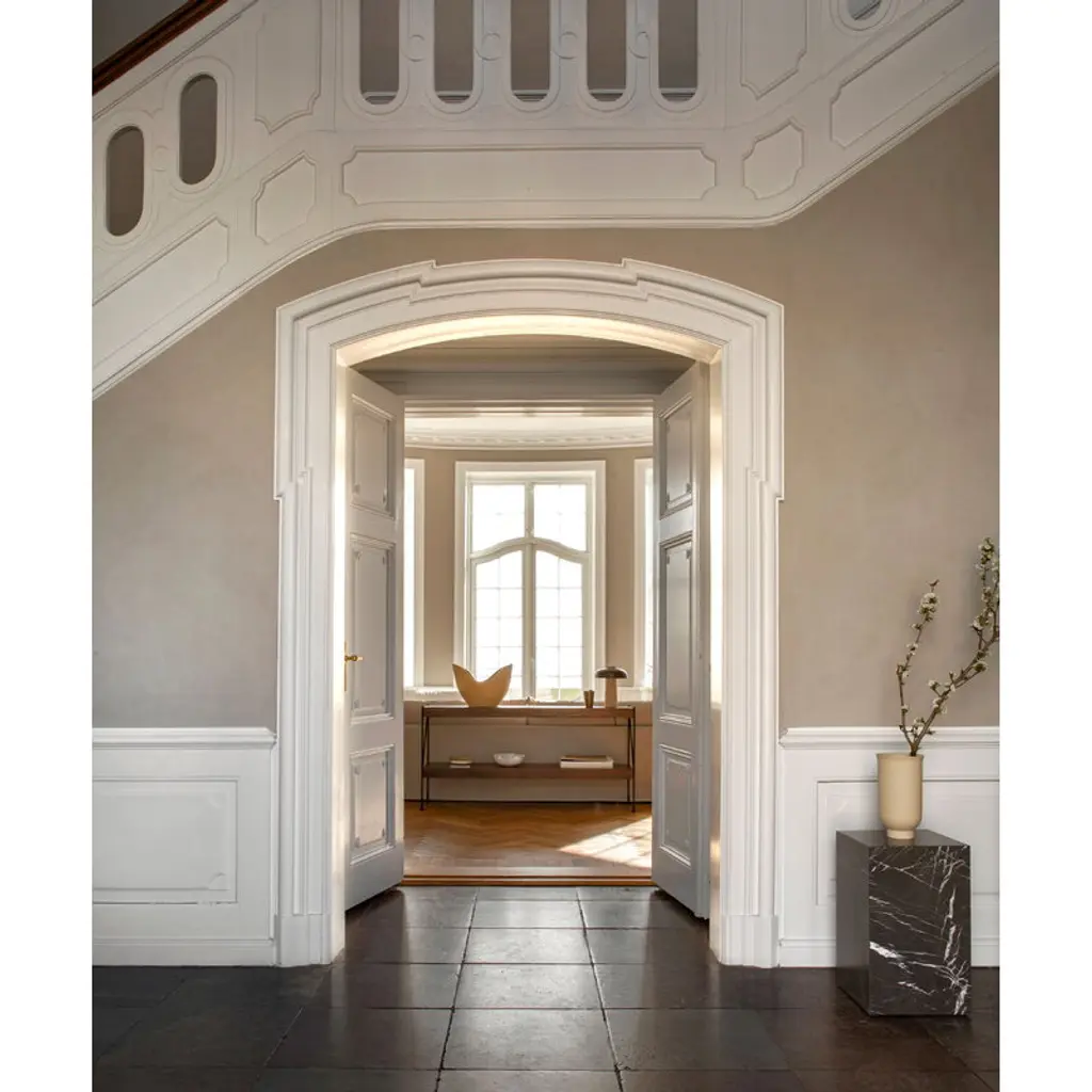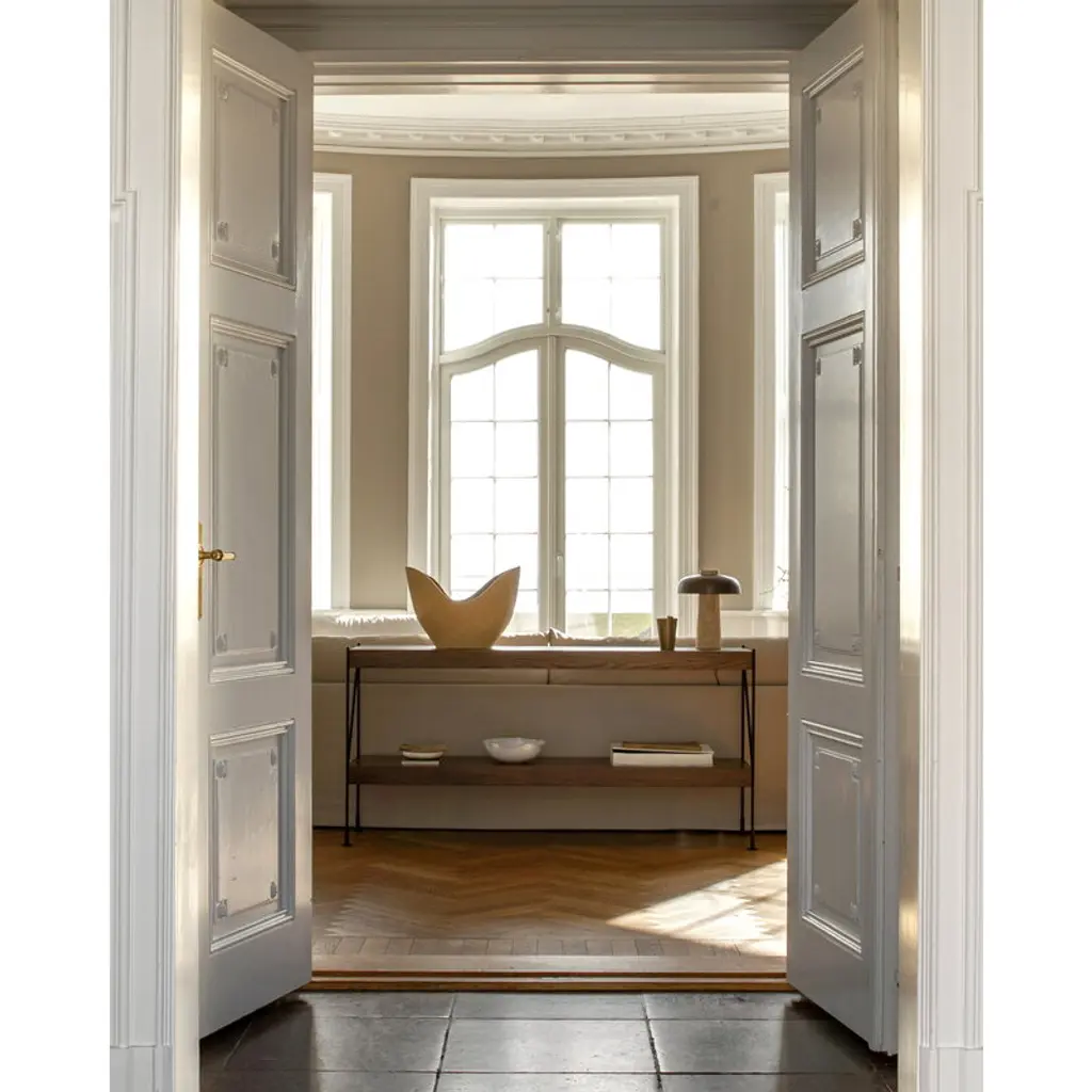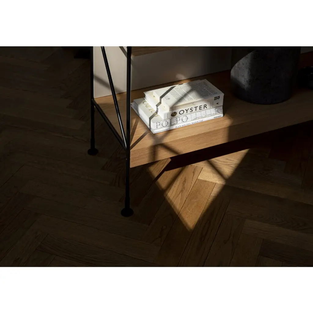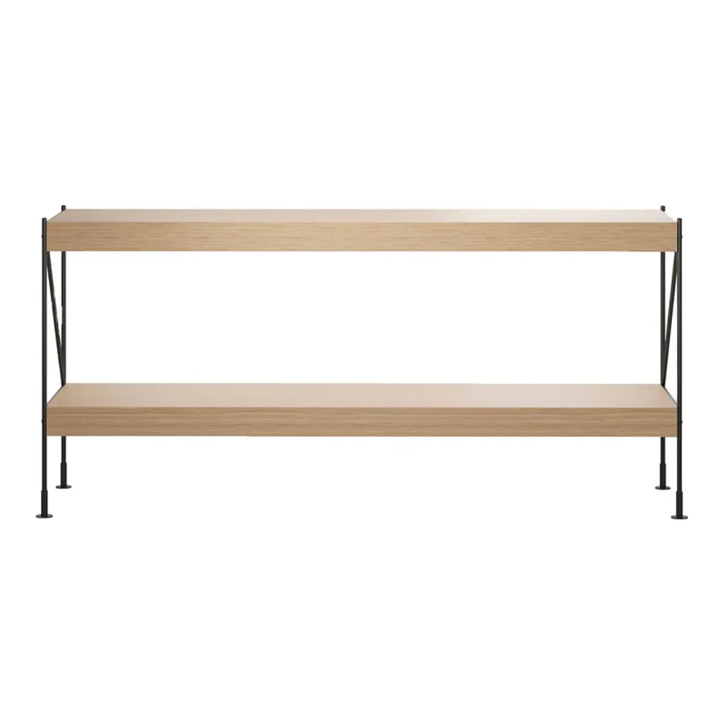The Zet Storage System by Audo Copenhagen is a minimalist shelving system characterized by high-quality materials and a timeless design expression. Created by German design studio Kaschkasch, the shelving system is based on two main elements: wooden shelves and a sleek frame in metal. The latter is finished with diagonal struts that form the letter Z, giving the system its name, Zet Storage System. The system’s shelves are designed so that they are easy to assemble, disassemble and move, ensuring a long service life and the freedom to place them in a different room, should you wish to change your décor. Airy and minimalistic, the Zet Storage System effortlessly adapts to a variety of environments and interior decoration styles. The shelf H70 is a low, two-level shelf that makes a great side or end table in the living room or hallway. The name H70 refers to the shelf’s height, 27.56 x 0 in (70 x cm. cm). The shelf can be complemented with back panels or magazine racks.