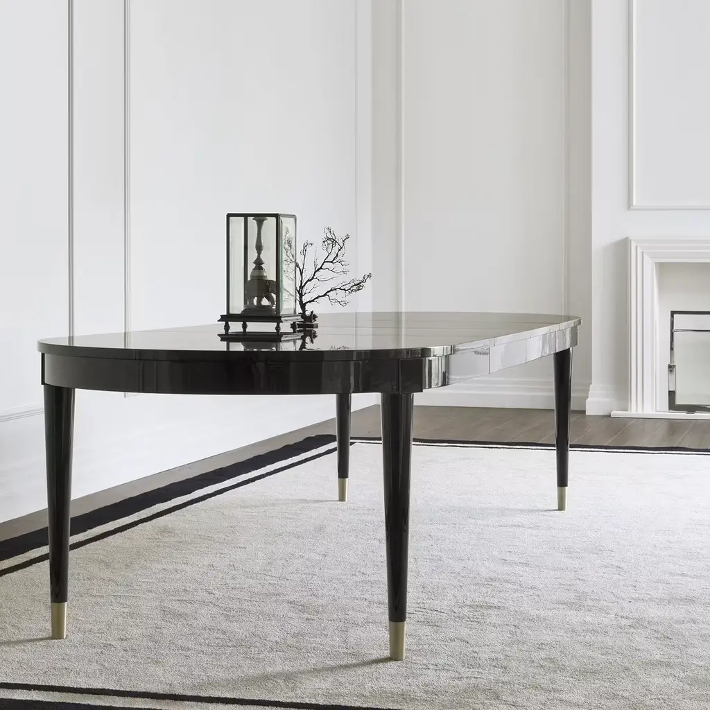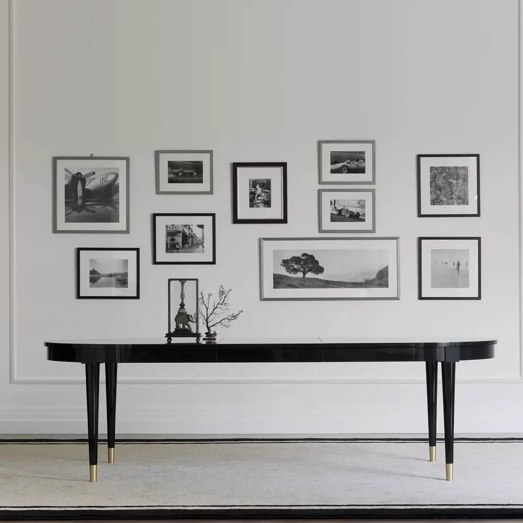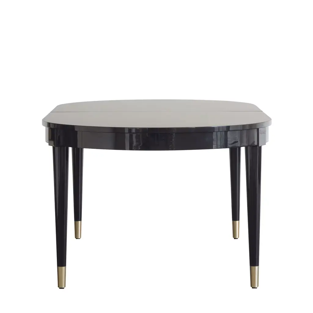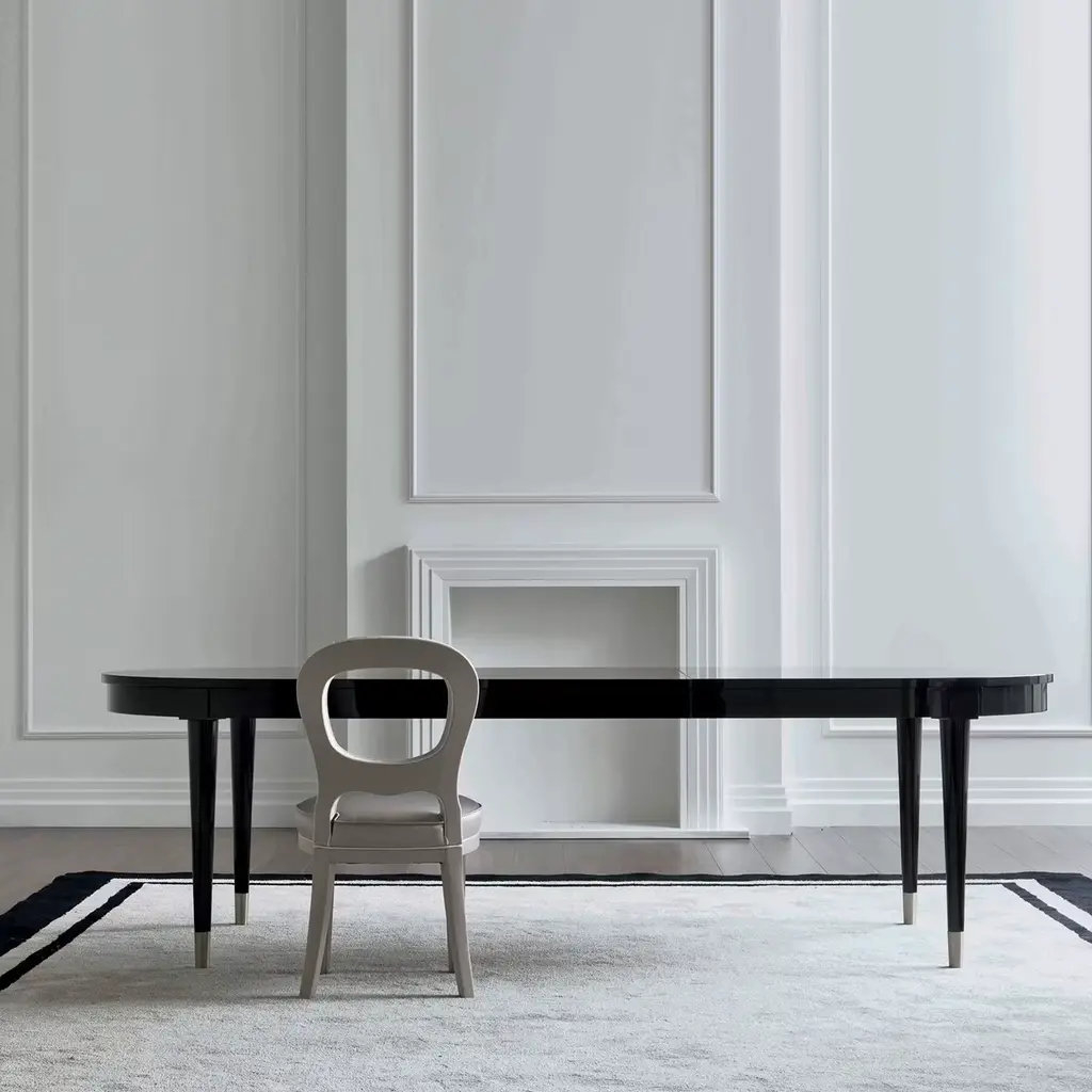 This elegant wooden table boasts a lacquered top that opens in half for two 60 cm extensions (externally stored) that create a large table. A particularly precious addition to a small dining room, this piece boasts elegant, satin-finished brass feet that add a sophisticated touch. Particularly suitable in a classic interior, this table can be combined with the Gilda chairs for a complete look. The metal details can also have a bronze finish, please ask the Concierge for details.