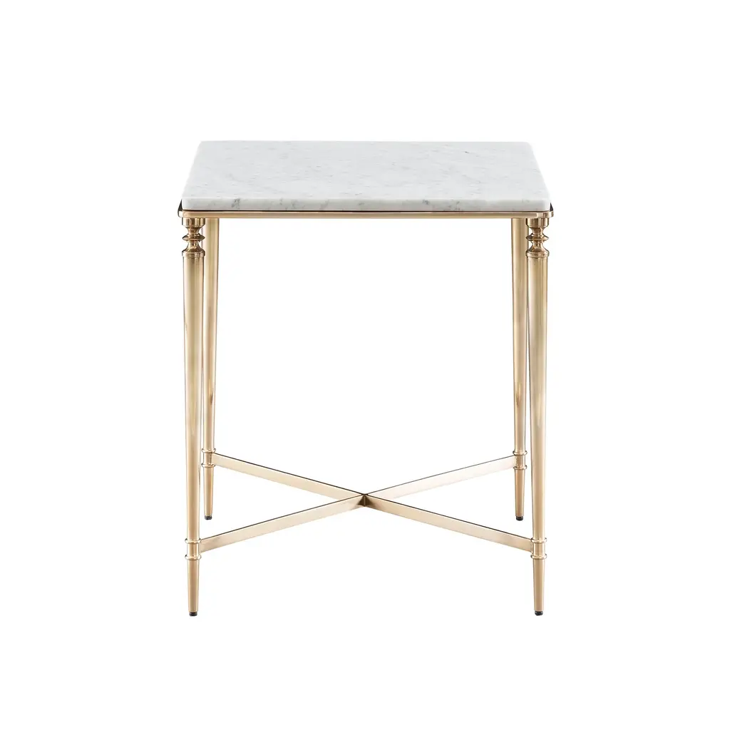 The Zoe End Table is the perfect companion to your favorite chair or sofa, adding a touch of elegance to any living space. Featuring a sculpted tapered leg and satin brass accents, this end table exudes a refined aesthetic. The Carrera Marble top enhances its sleek design, making it a standout piece. Ideal as an end table for the living room, the Zoe End Table combines style and functionality, seamlessly fitting into any style. Ships In 4-5 Weeks White Carrera Marble top Satin Brass metal frame This image is for illustrative purposes only. The colors shown are accurate within the constraints of lighting, photography, and the color accuracy of your screen.