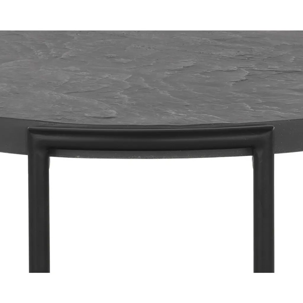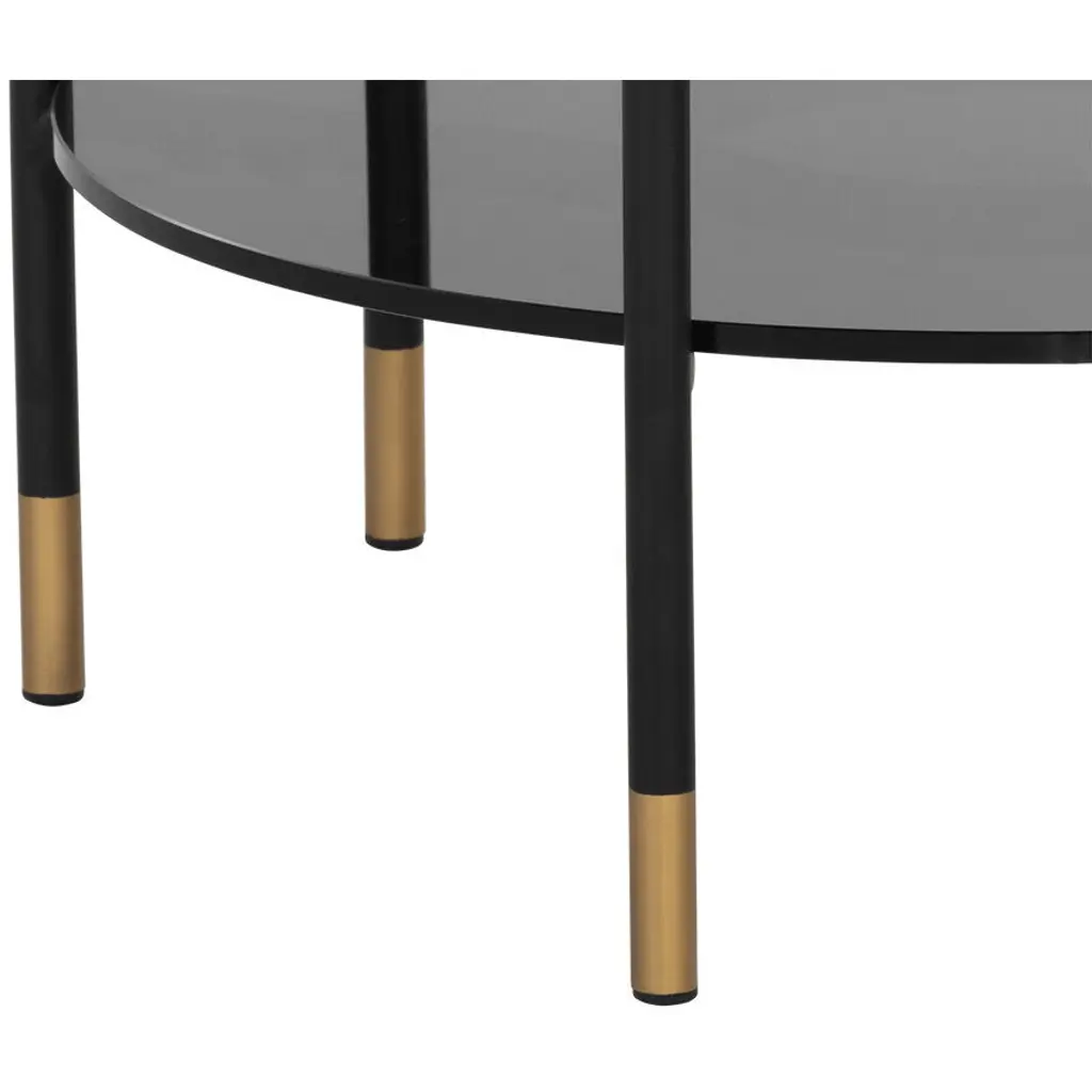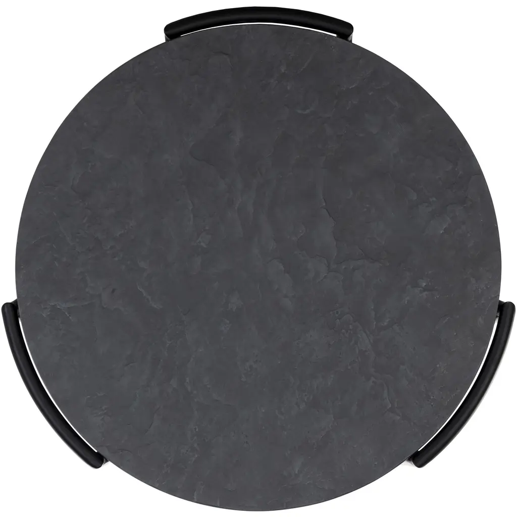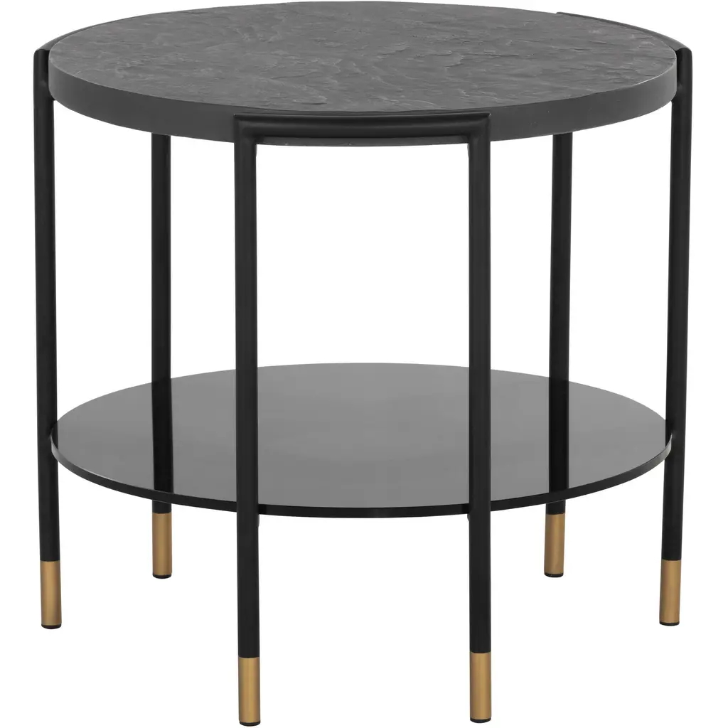An alluring end table. Features a concrete top with a black/charcoal soft slate effect and a black tempered glass shelf. Finished with sleek black steel legs with brushed gold foot caps.