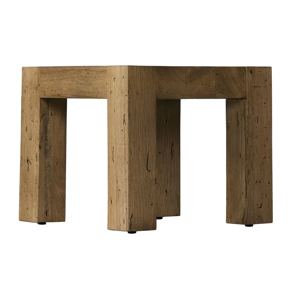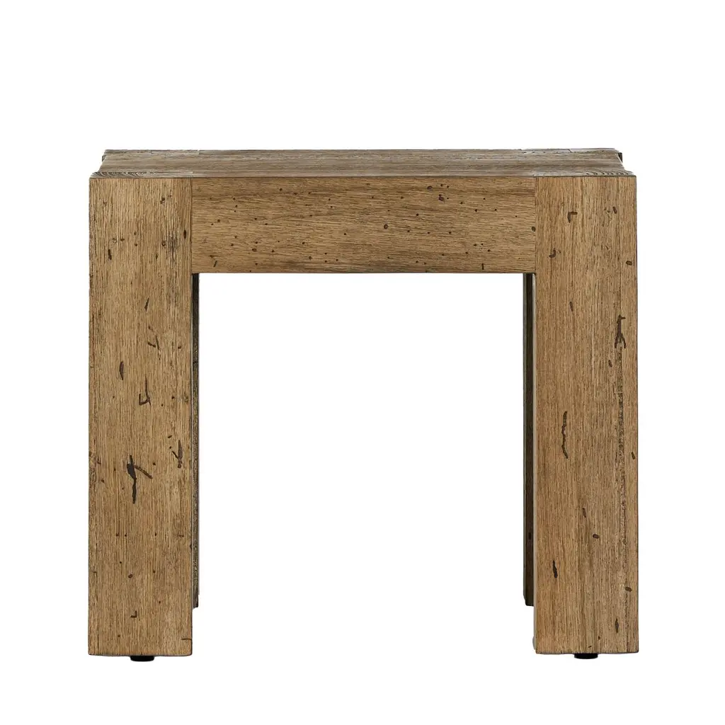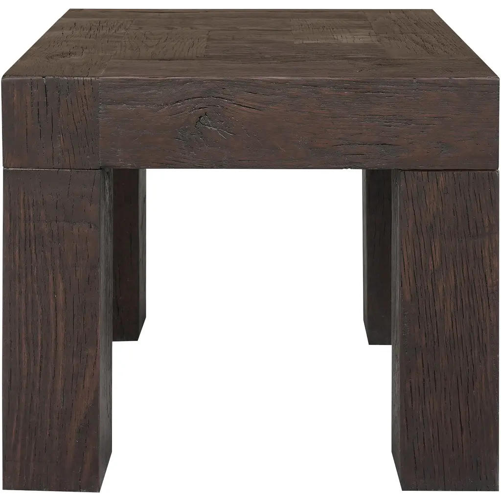 The Zuri End Table is a stunning piece crafted from thick-cut oak veneer, featuring a faux rustic finish that beautifully emulates wormwood. Its design is characterized by chunky squared legs and intricate dovetail joinery detailing, making it a perfect blend of rustic charm and modern craftsmanship.