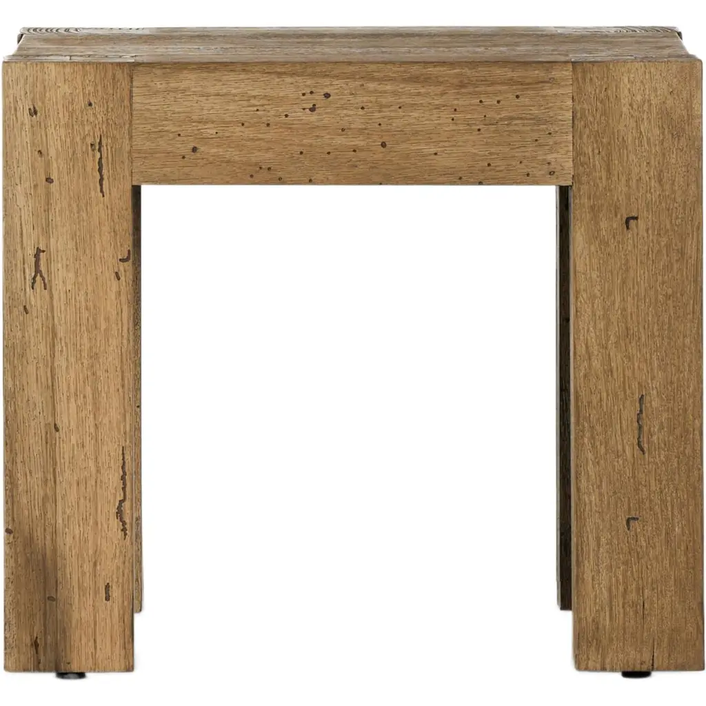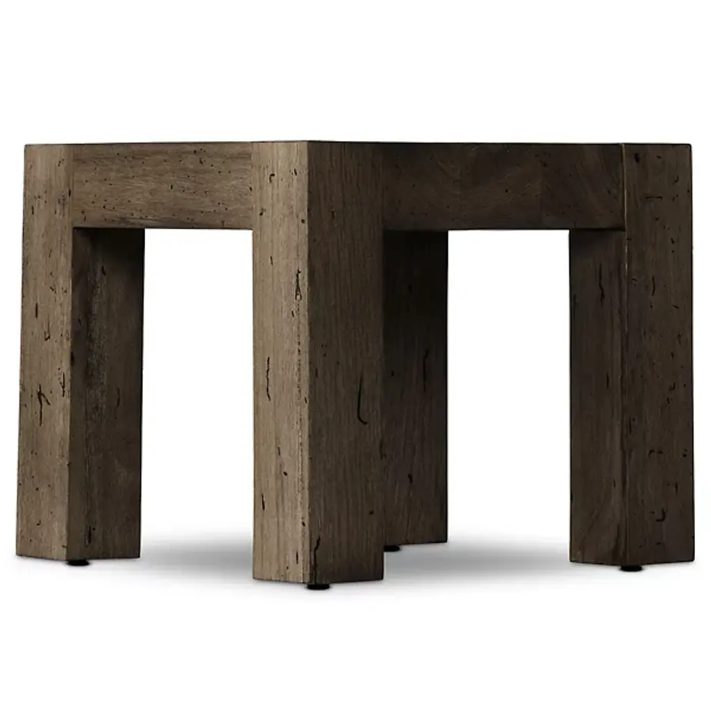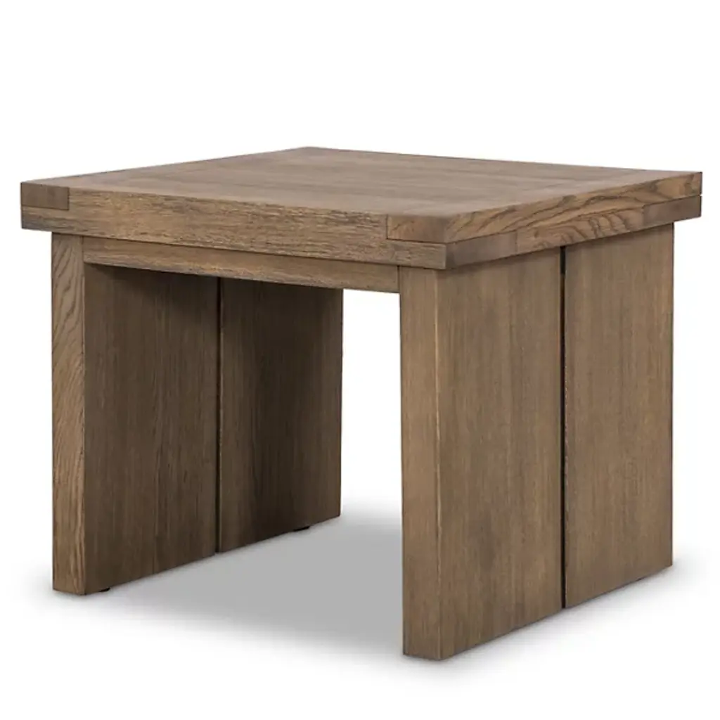 The Zuri End Table is a stunning piece crafted from thick-cut oak veneer, featuring a faux rustic finish that beautifully emulates wormwood. Its design is characterized by chunky squared legs and intricate dovetail joinery detailing, making it a perfect blend of rustic charm and modern craftsmanship.