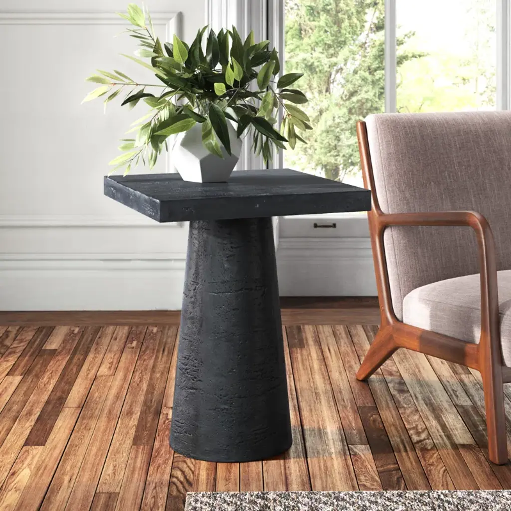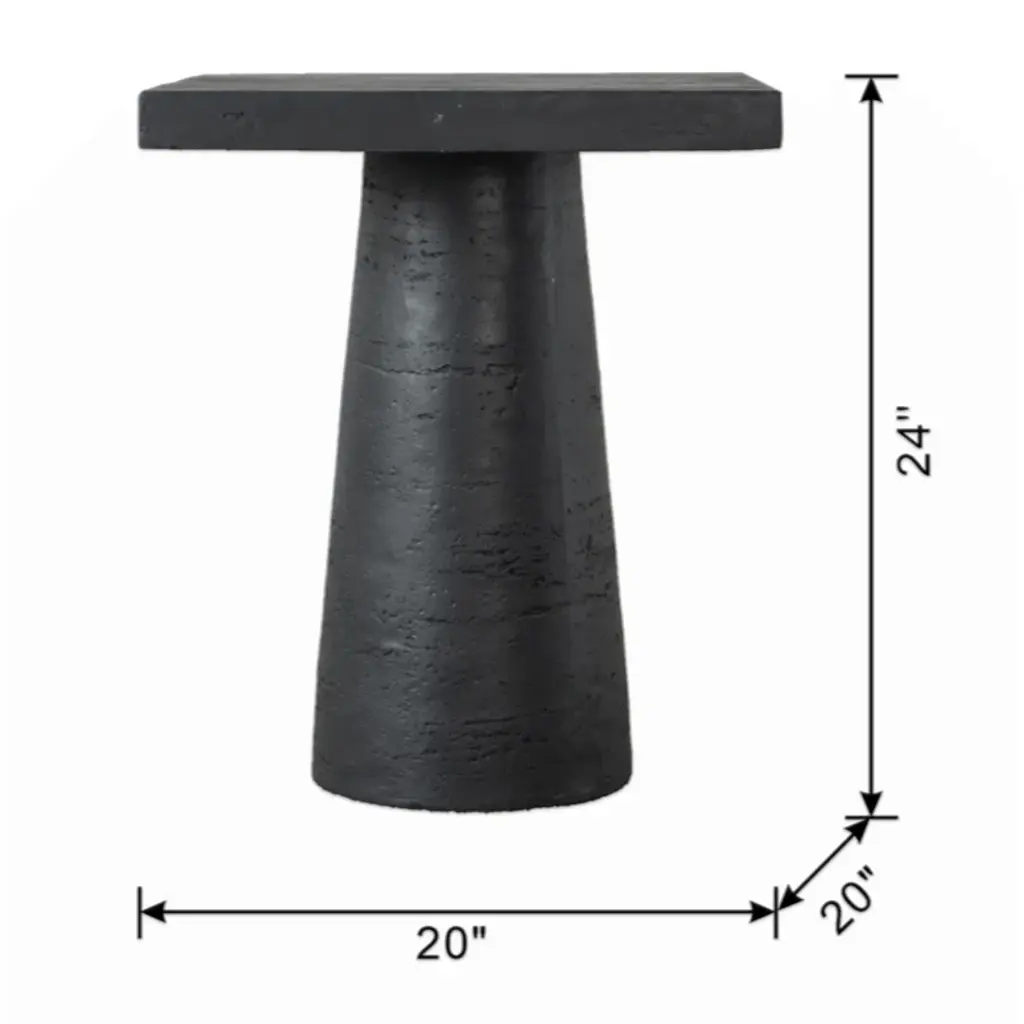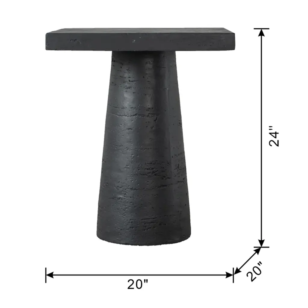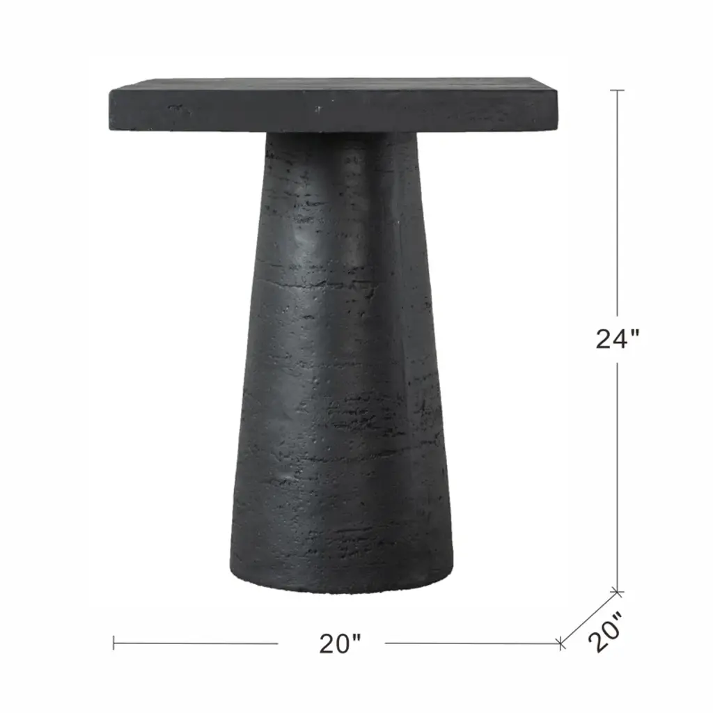 Expertly crafted from 100% durable cement, this bold side table boasts a clean-lined square top, a rounded pedestal base, and a dynamic finish. Standing 24 tall and 20 wide, this table offers great versatility, thriving in your space as a nightstand, entryway accent table, plant stand, or a chairside piece in your living room.