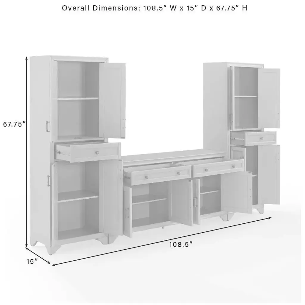 Whether you love a traditional look or a modern farmhouse vibe, the Tara 3pc Sideboard and Pantry Set brings stylish organization to your dining room. The sideboard features two wide full-extension drawers and two large cabinets with adjustable shelves, perfect for storing dishes and flatware. Each pantry has a full-extension drawer, plus two large cabinets with adjustable shelving, making the Tara 3pc Sideboard and Pantry Set a great option for home storage. OVERALL PRODUCT DIMENSIONS: 108.5”W X 15”D X 67.75”H