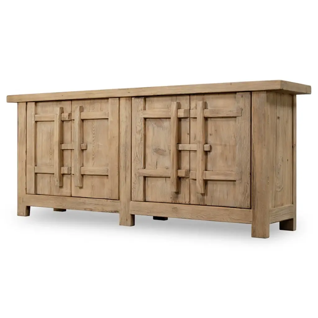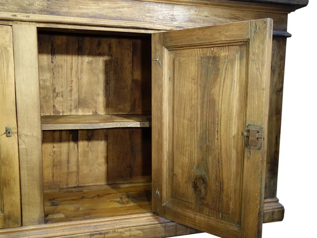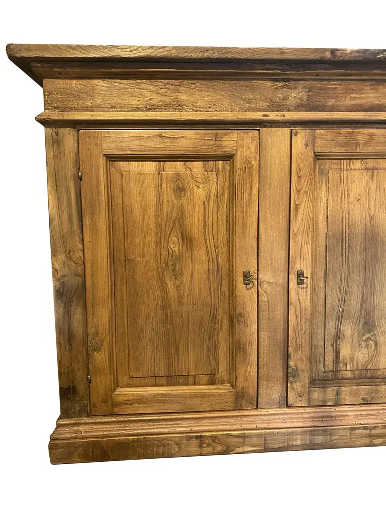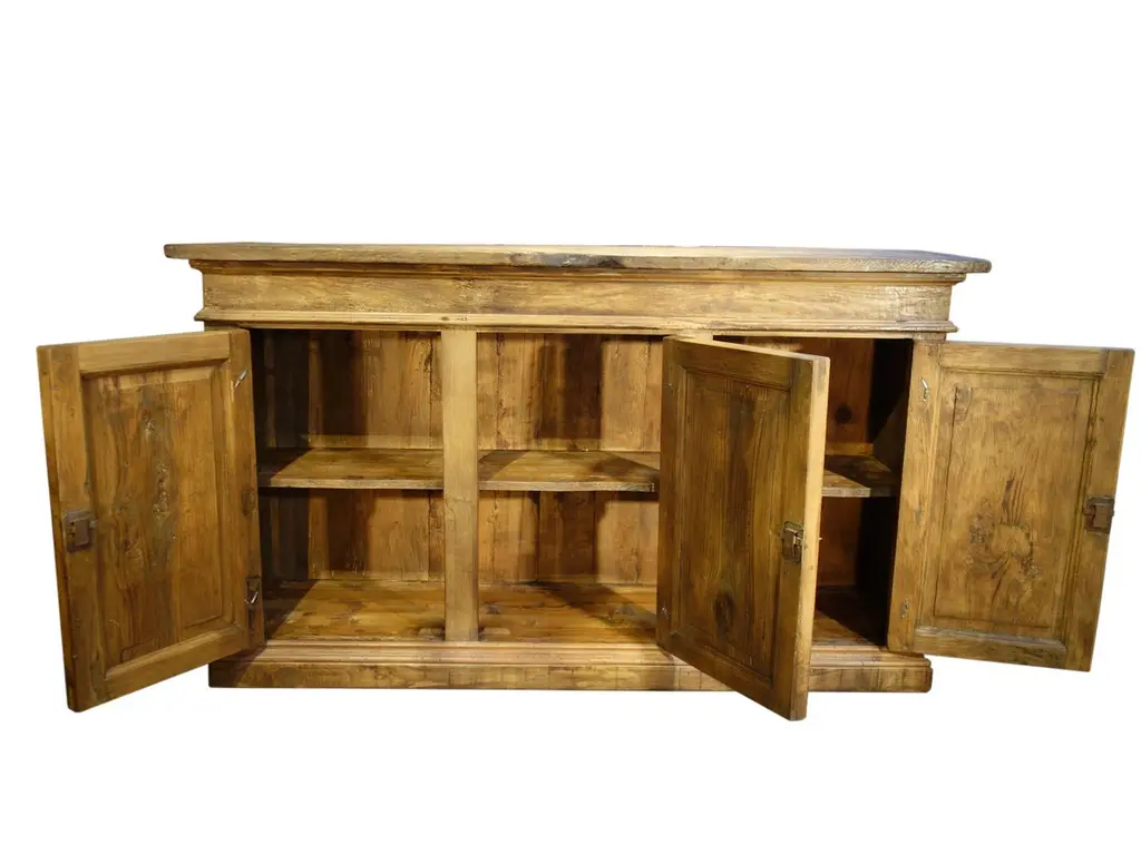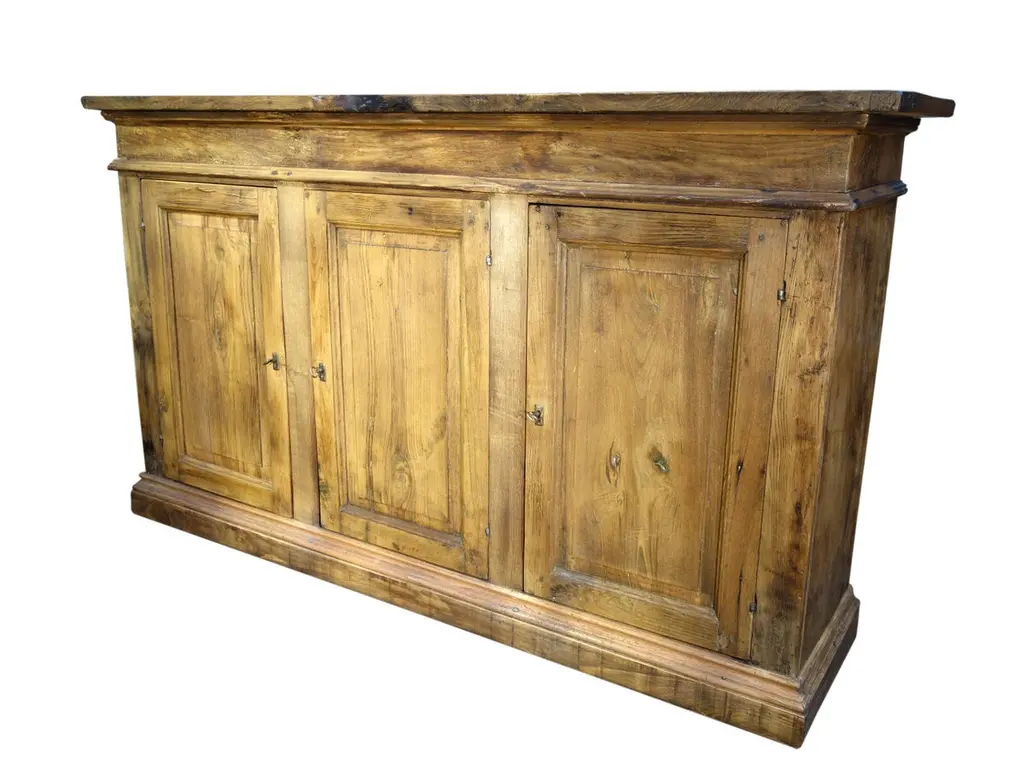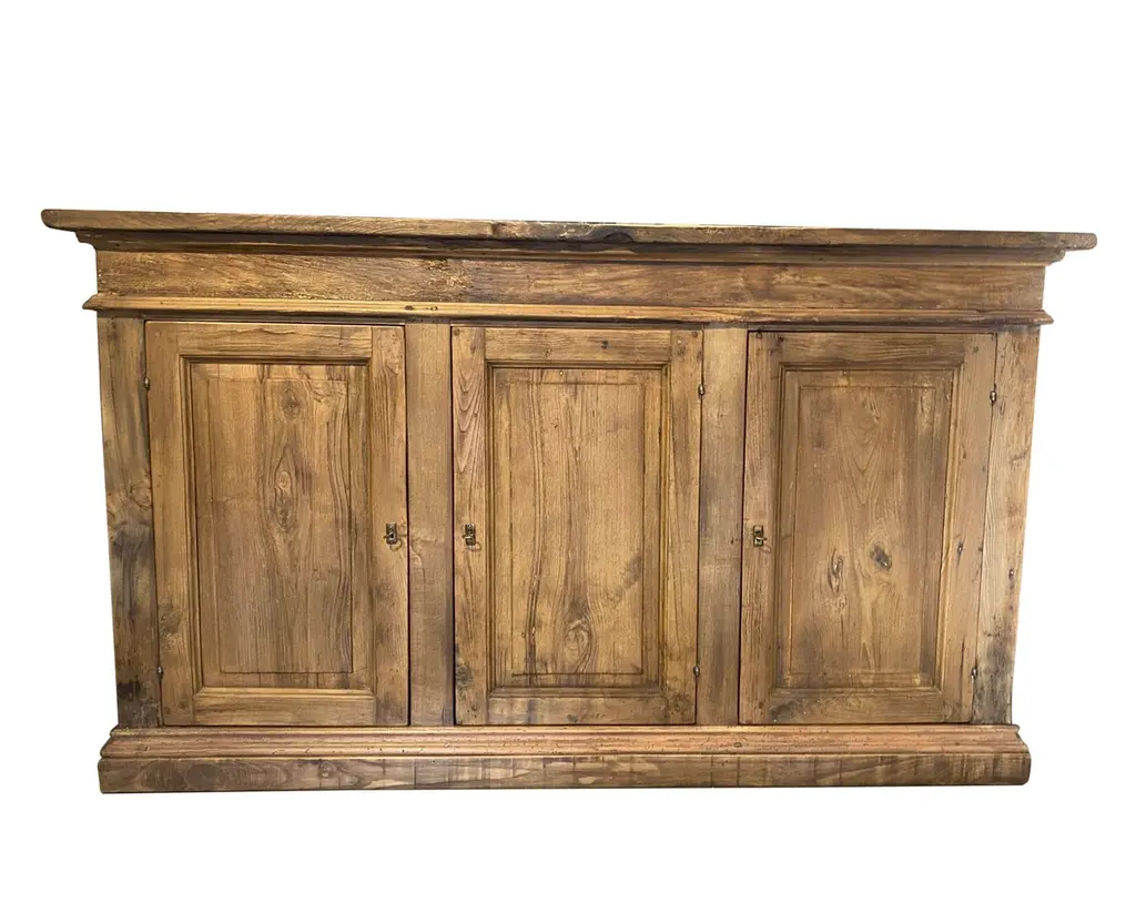 “Benevento” 3-door Mediterranean Old Chestnut Credenza, with 3 interior shelves:Our stately & rustic style handcrafted credenza features Old Chestnut hardwoods, finely aged with distressed unstained patina and forged hardware. This “Benevento”" credenza may be CUSTOM built by quote to your preference in size, configuration, color & patina. Floor model measures: 80.5” W x 46.5” H x 20.25” DAvailable to custom order:- Optional finishes include:- Natural blonde shellac- Classic shellac- Espresso Dark stain shellacMoro blackened shellacGloss, satin & waxed finishes also available to orderAlso available in Old Chestnut, Poplar, or Walnut with smooth or brushed grain finish.Bellini’s Old World Collection styles are adapted from Renaissance designs from the 15th to 19th centuries. For over 40 years, our craftsmen have been recovering & finishing old Italian hardwoods. Their lives have been immersed in the craft of antique furniture in traditional Mediterranean styles. Each piece is artfully handcrafted with aged Italian solid hardwoods and fine-tooled hardware, built to your custom needs by quote in size, configuration, color & patina.
