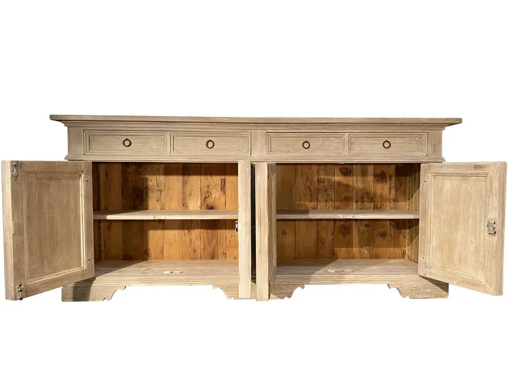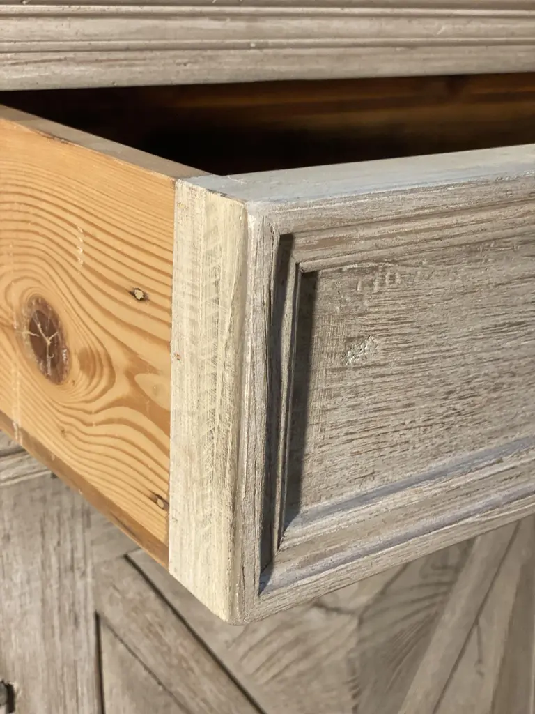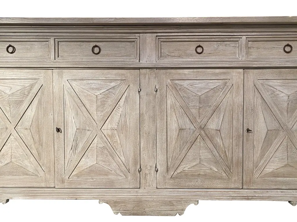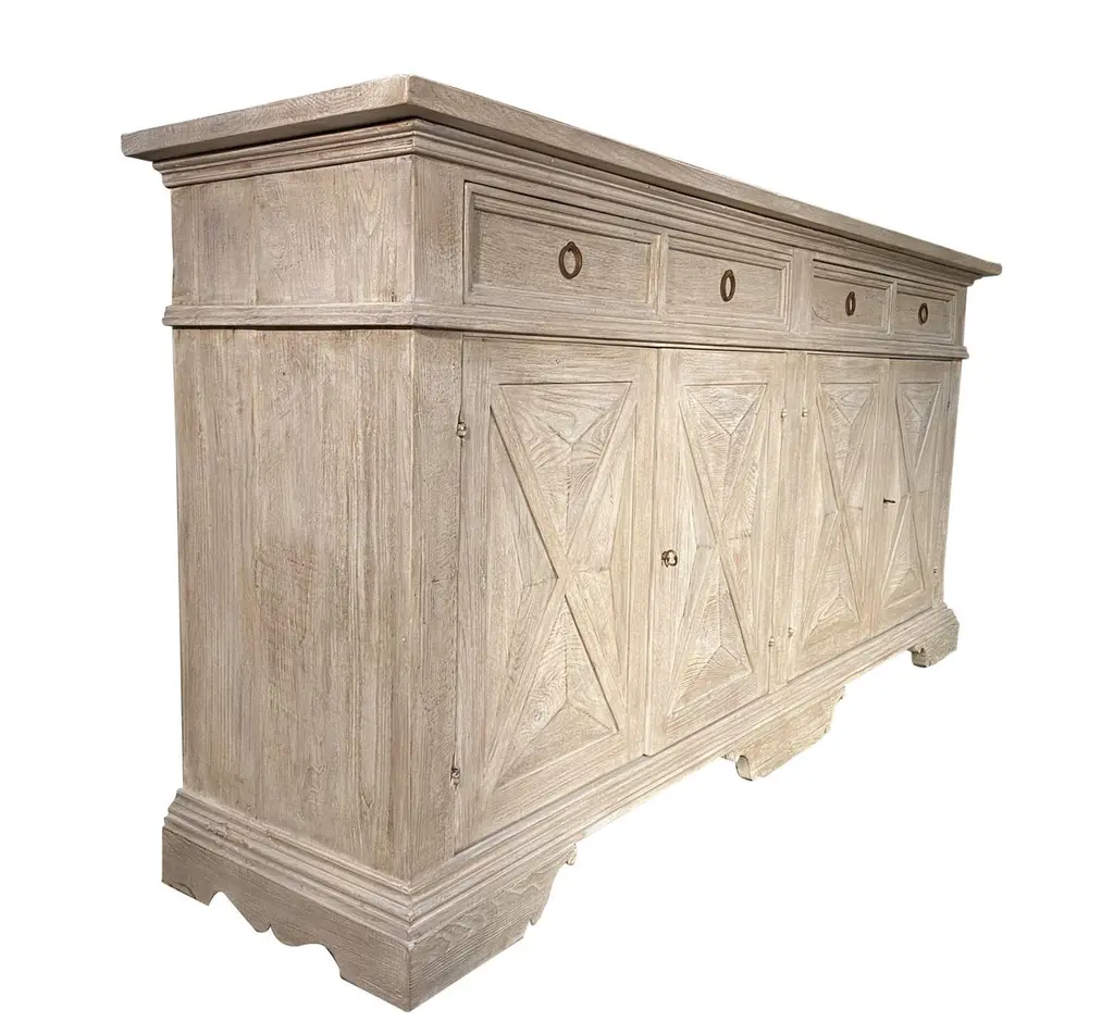 TUSCAN ALPI 4-Door + 2-Drawer Credenza in solid Old Chestnut with Dolomiti finish, includes 2 adjustable, finished interior shelves, locks & keys, with hardware options. Our exclusive custom handcrafted Mediterranean style credenza line featuring our solid Italian Old Chestnut with a brushed finish we’ve named Dolomiti, after the famous limestone ridges high in the Italian Alps.Measures: 93” Width x 20” Depth x 42” HeightAlso available to custom order:Optional finishes include:- Natural blonde shellac- Classic shellac- Espresso Dark stain shellac- Moro blackened shellacGloss, satin & distressed painted finishes also available to orderAlso available in Old Chestnut, Poplar, or Walnut with smooth or brushed grain finish.Available in 2-Door + 1-Large Drawer Credenza in solid Old Chestnut with Dolomiti finish, includes 1 adjustable, finished interior shelf, locks & keys, with hardware options.Expedited shipping service available by quote.Our Alpi style cabinet line is available by quote in custom size, configuration of doors & drawers, and interiors (including interior drawers). Optional stone and marble tops. Available in any of our solid aged wood finish & color options. Our exclusive Dolomiti finish is also available on all other cabinet styles as an optional aged chestnut finish treatment. Please inquire.Bellini’s Old World Collection styles are adapted from Renaissance designs from the 15th to 19th centuries. For over 40 years, our craftsmen have been recovering & finishing old Italian hardwoods. Their lives have been immersed in the craft of antique furniture in traditional Mediterranean styles. Each piece is artfully handcrafted with aged Italian solid hardwoods and fine-tooled hardware, built to your custom needs by quote in size, configuration, color & patina.