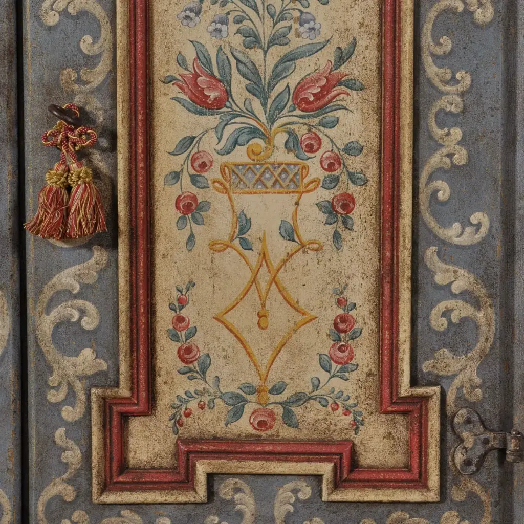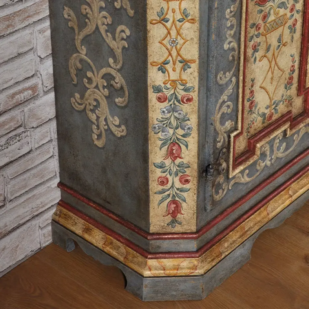 An ode to 17th-century Baroque Tyrolean style, this sideboard at once distills romanticism and opulence. Richly decorated by hand with a triumph of Baroque patterns and floral motifs, it confirms its stylistic belonging through the base's sinuous profile, a trait distinguishing furniture produced in Val di Fassa by the end of the 17th century. Please contact the Concierge for customizations.
