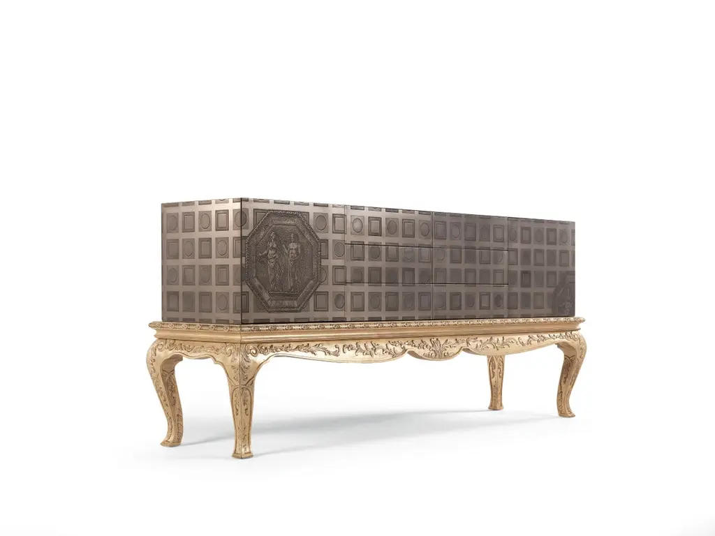 Fragonard line expresses Jumbo Collection’s design approach, where artisanal heritage, decorative and experimentation in the use of materials, techniques and processes meet. In the Fragonard sideboard, the base is highlighted by the very antiqued gold leaf finish while the structure is enriched with Renaissance decorative elements recreated through an innovative engraving technique: the use of liquid metal gives an original embossed effect to the patterns.Fragonard sideboard with structure in multilayer wood, with Renaissance decorative elements in liquid metal JG295. Hand-carved base in solid beechwood finished in antique gold with patina J288O.