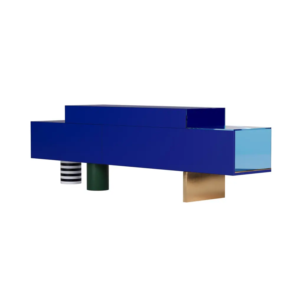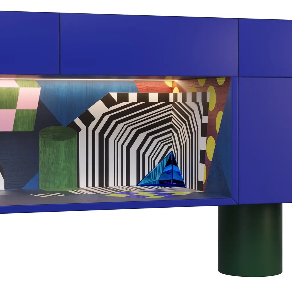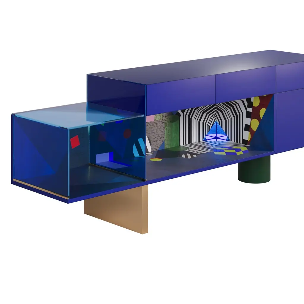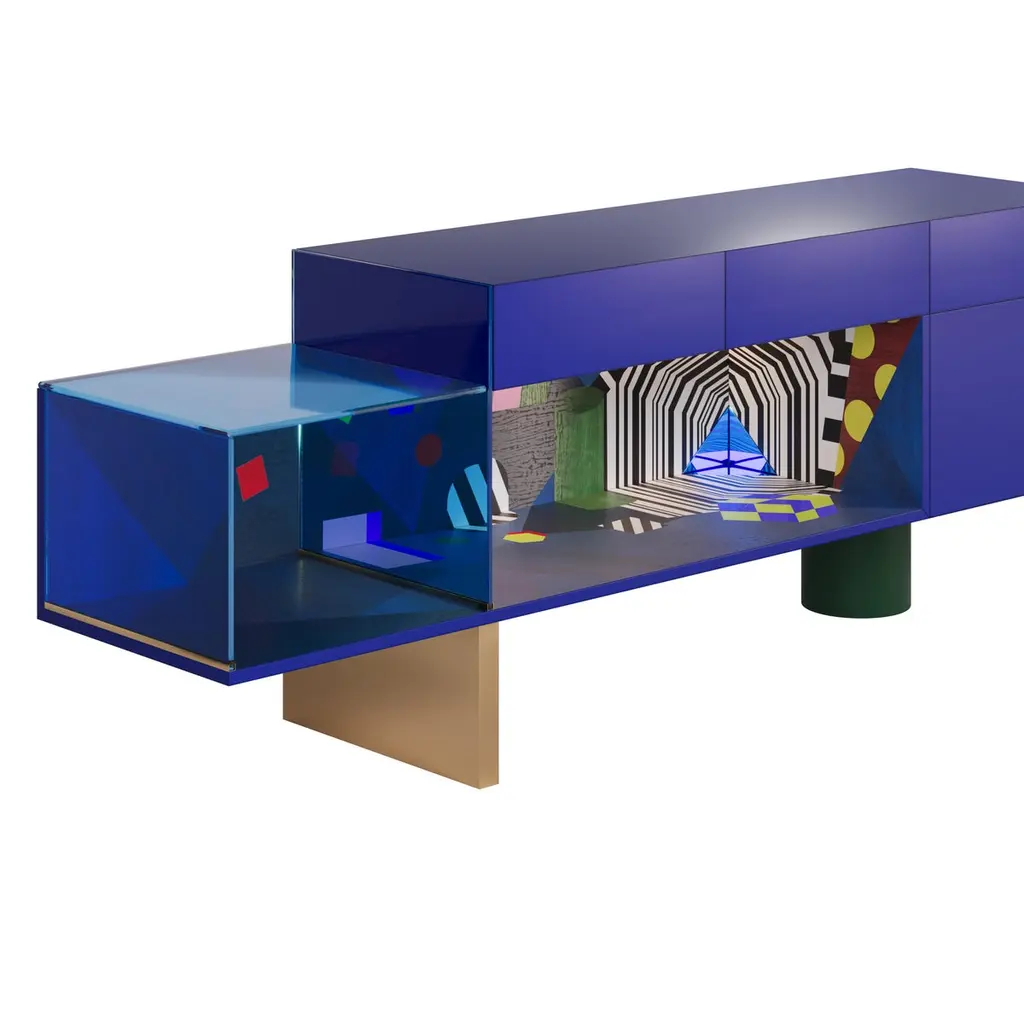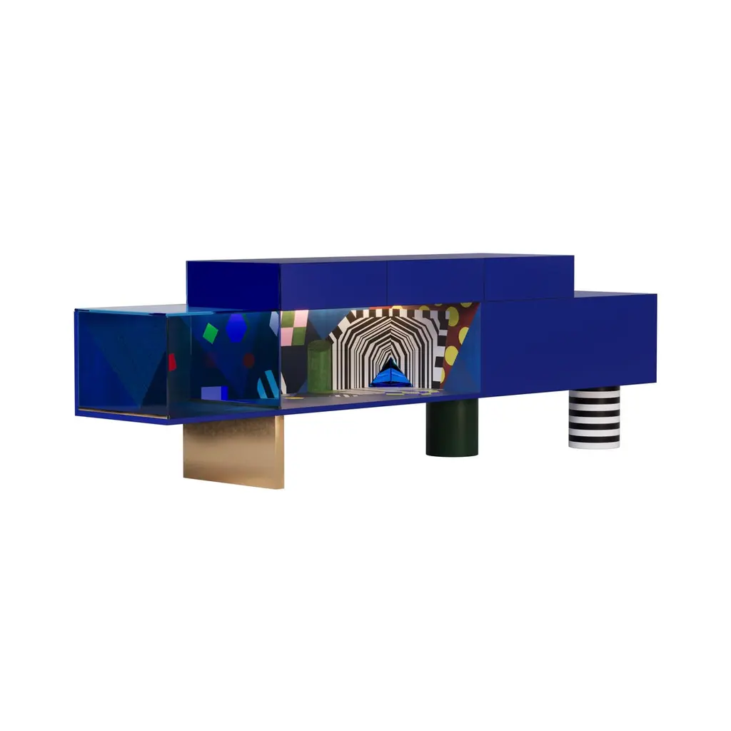 Color holds immense power in defining a space, transcending mere aesthetics to evoke emotions, influence moods, and shape the perception of an environment. From classic blue hues to three-dimensional marquetry geometric shapes and bold tones, the Illusion sideboard can profoundly impact the ambiance and purpose of space.The Illusion sideboard is a tribute to craftsmanship, embellished with a geometric-inspired drawing made with brash colors, marquetry, brushed brass, blue Glass, and blue Mirror.The Illusion sideboard is the ideal piece for a moody interior.