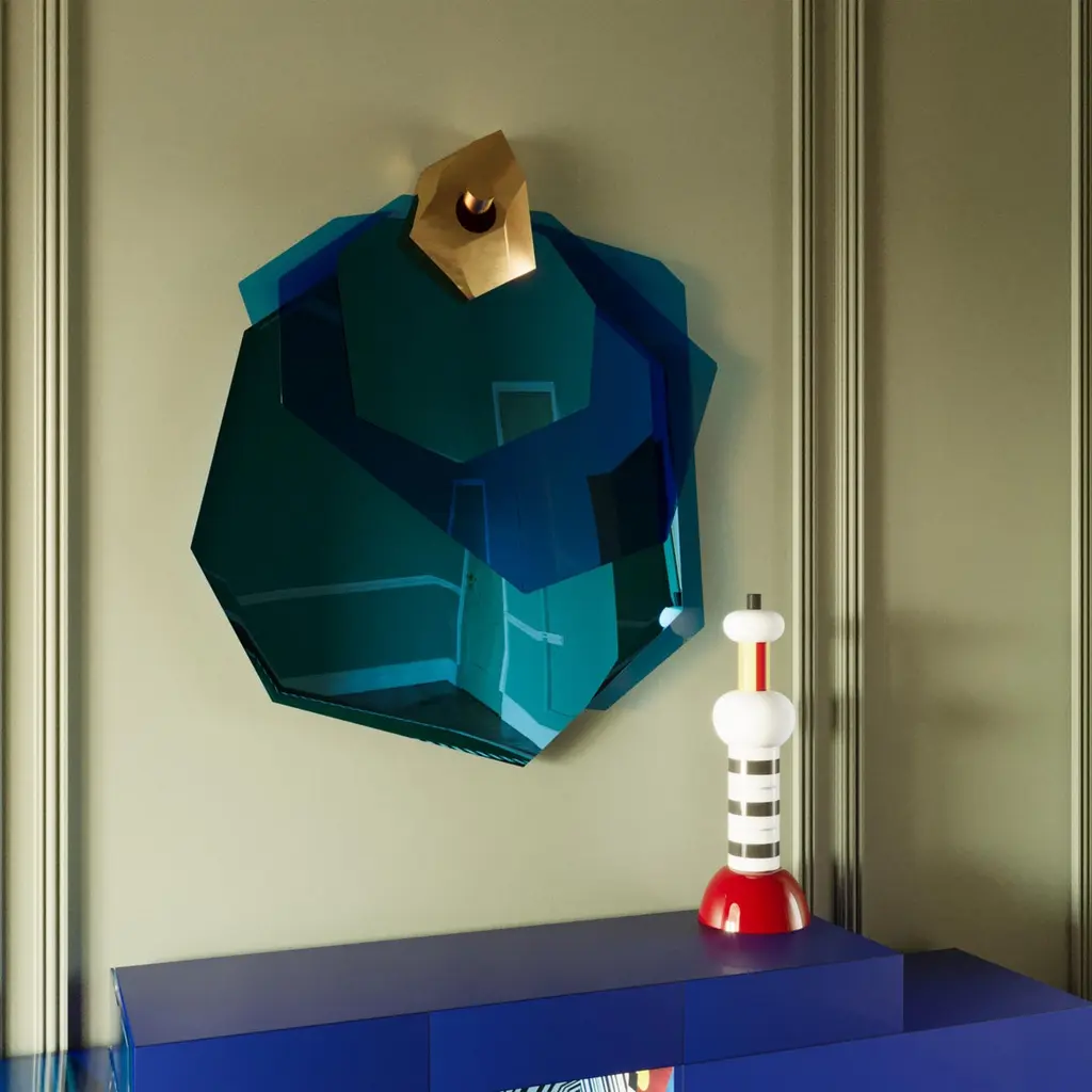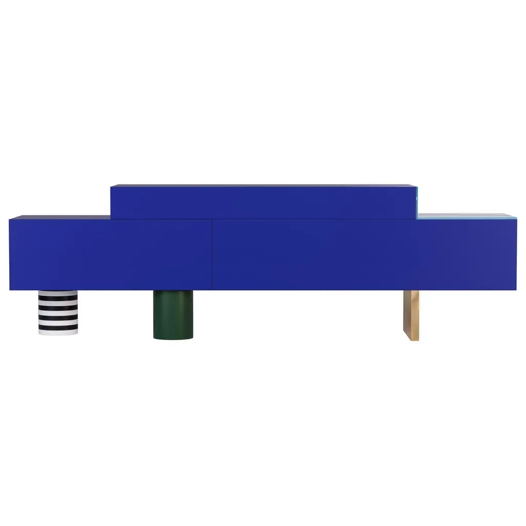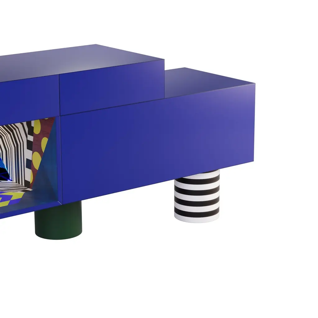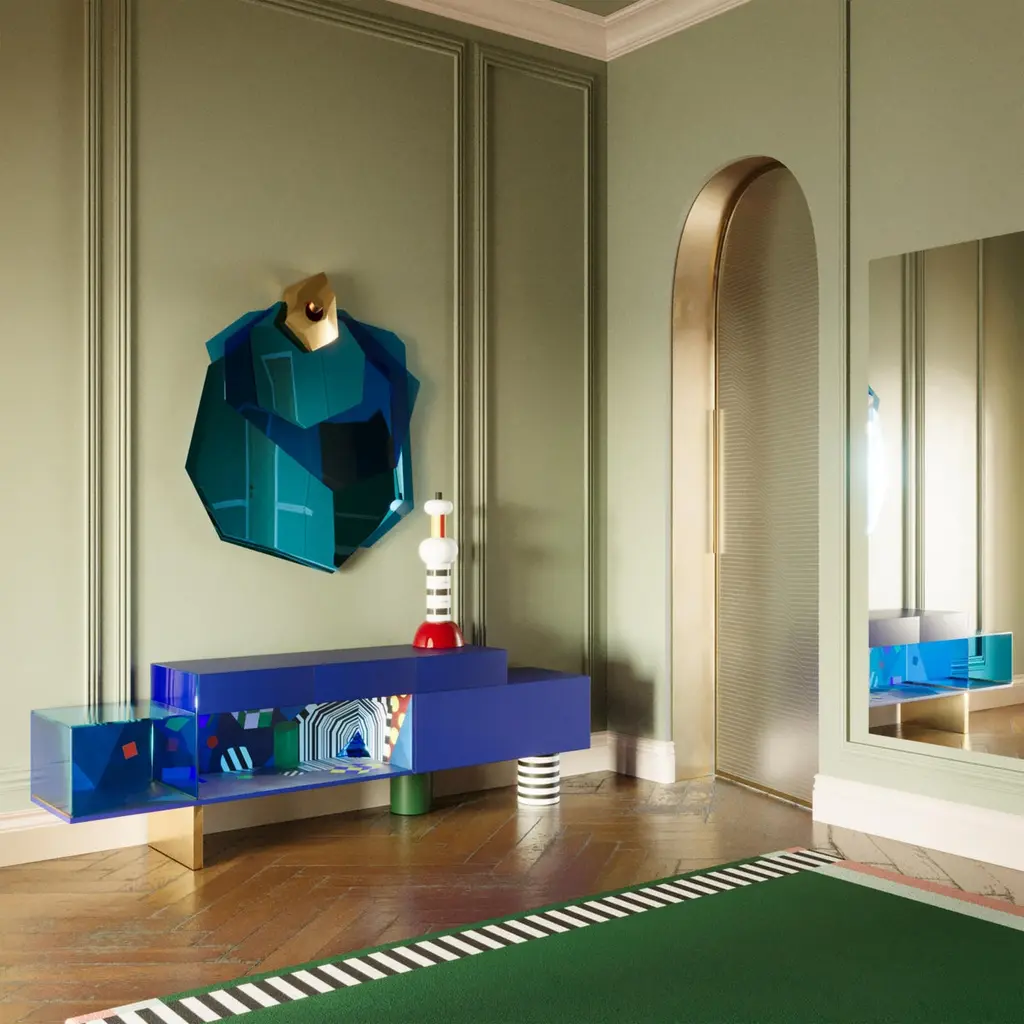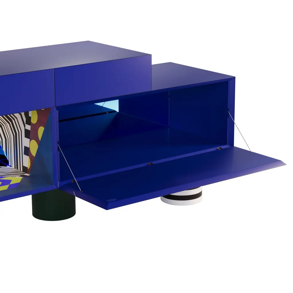 Color holds immense power in defining a space, transcending mere aesthetics to evoke emotions, influence moods, and shape the perception of an environment. From classic blue hues to three-dimensional marquetry geometric shapes and bold tones, the Illusion sideboard can profoundly impact the ambiance and purpose of space.The Illusion sideboard is a tribute to craftsmanship, embellished with a geometric-inspired drawing made with brash colors, marquetry, brushed brass, blue Glass, and blue Mirror.The Illusion sideboard is the ideal piece for a moody interior.