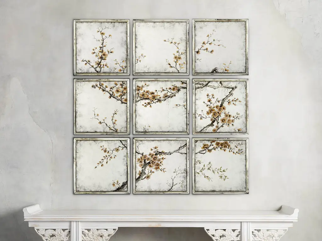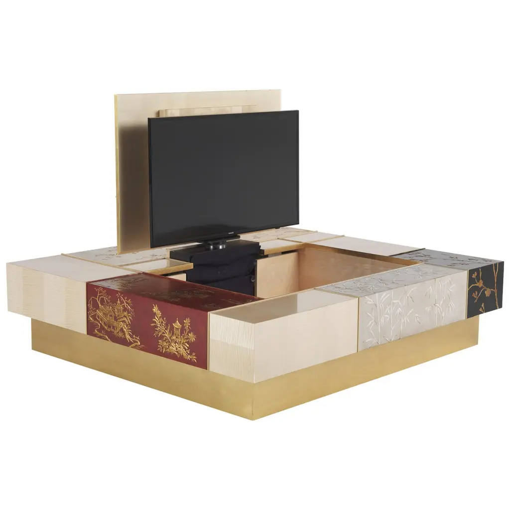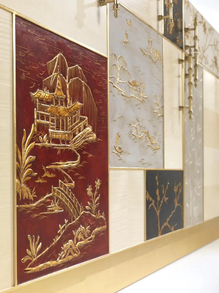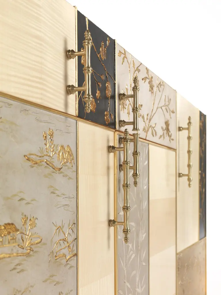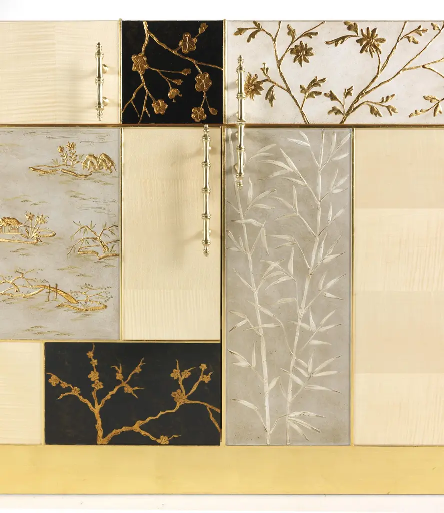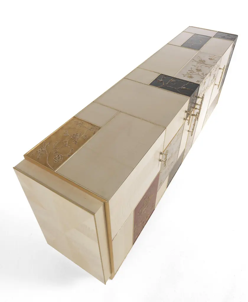 “Ukiyo” is an evocative name recalling the “images from the floating world” of the famous traditional Japanese prints. The furniture line includes sideboard, central and side table and is characterized by a peculiar composition that alternates elements veneered in frisé maple with tiles decorated using gypsum as a support, in relief or engraved, and subsequent chromatic decoration, as in the famous traditional Chinese lacquers, applied in this case to contemporary forms.Ukiyo sideboard with structure in multilayer maple. Panels decorated in relief plaster. Four doors and one drawer. Base finished in glossy gold JG297.