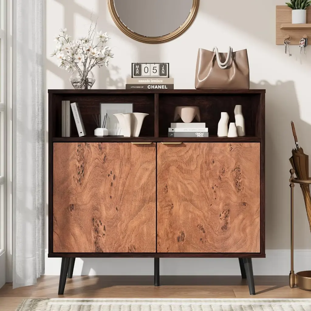 31.5" Sideboard Buffet Cabinet with Storage, Farmhouse Kitchen Wooden Cabinet with 2 Open Shelves, Gorgeous Burl Texture, Coffee Bar for Dining Room, Living Room, Walnut