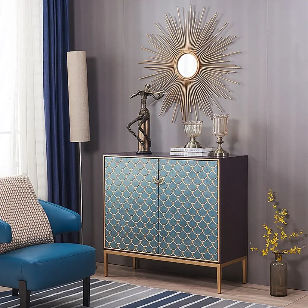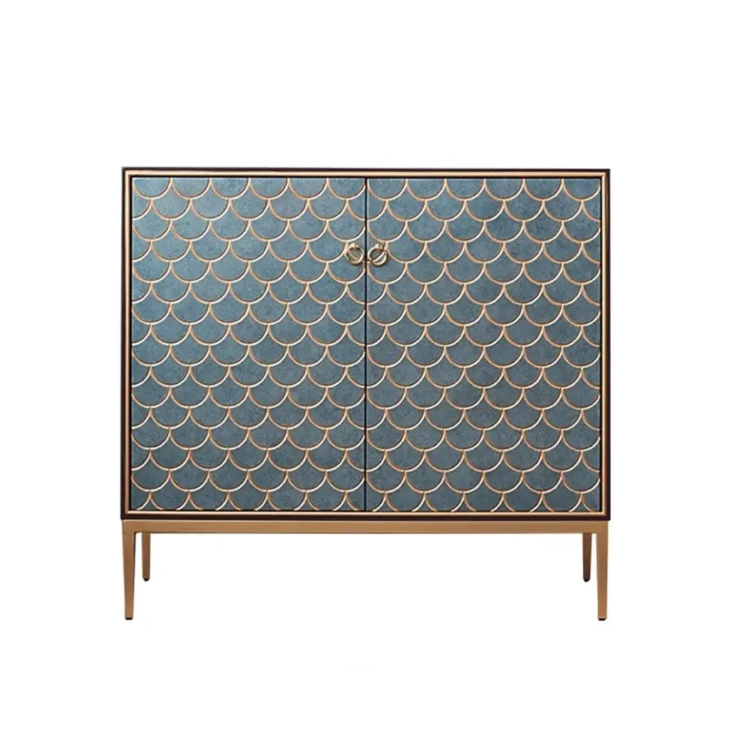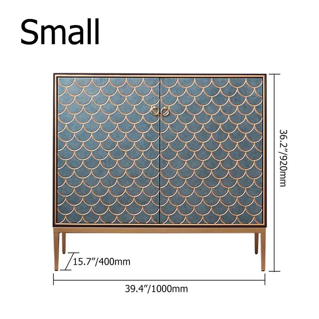 Make a bold style statement with this peacock green sideboard, featuring exquisite golden scale inlays for a luxurious touch. Its striking color is complemented by golden door rings and legs, creating an opulent centerpiece. The spacious interior with 3 shelves behind 2 doors offers both dramatic visual appeal and practical storage functionality.