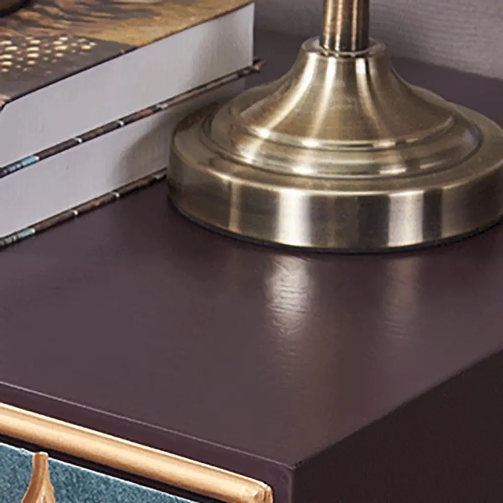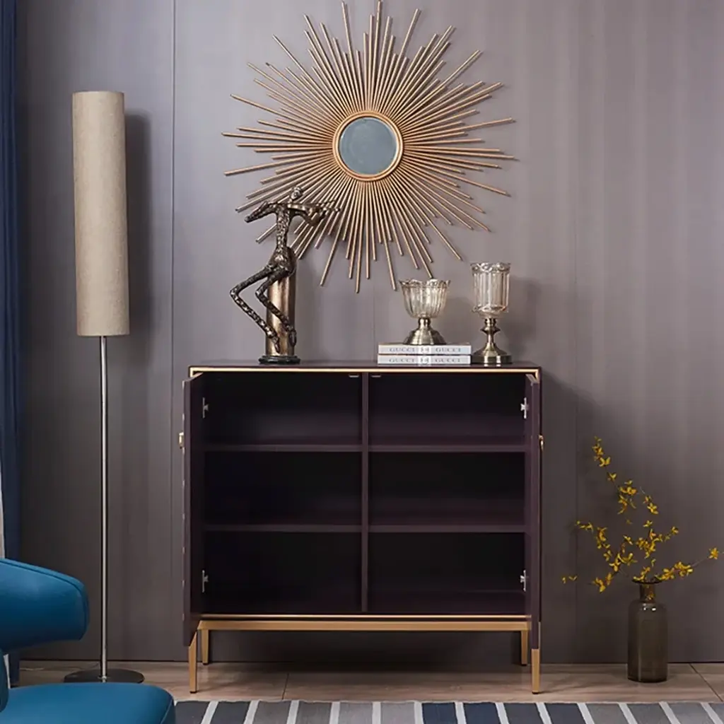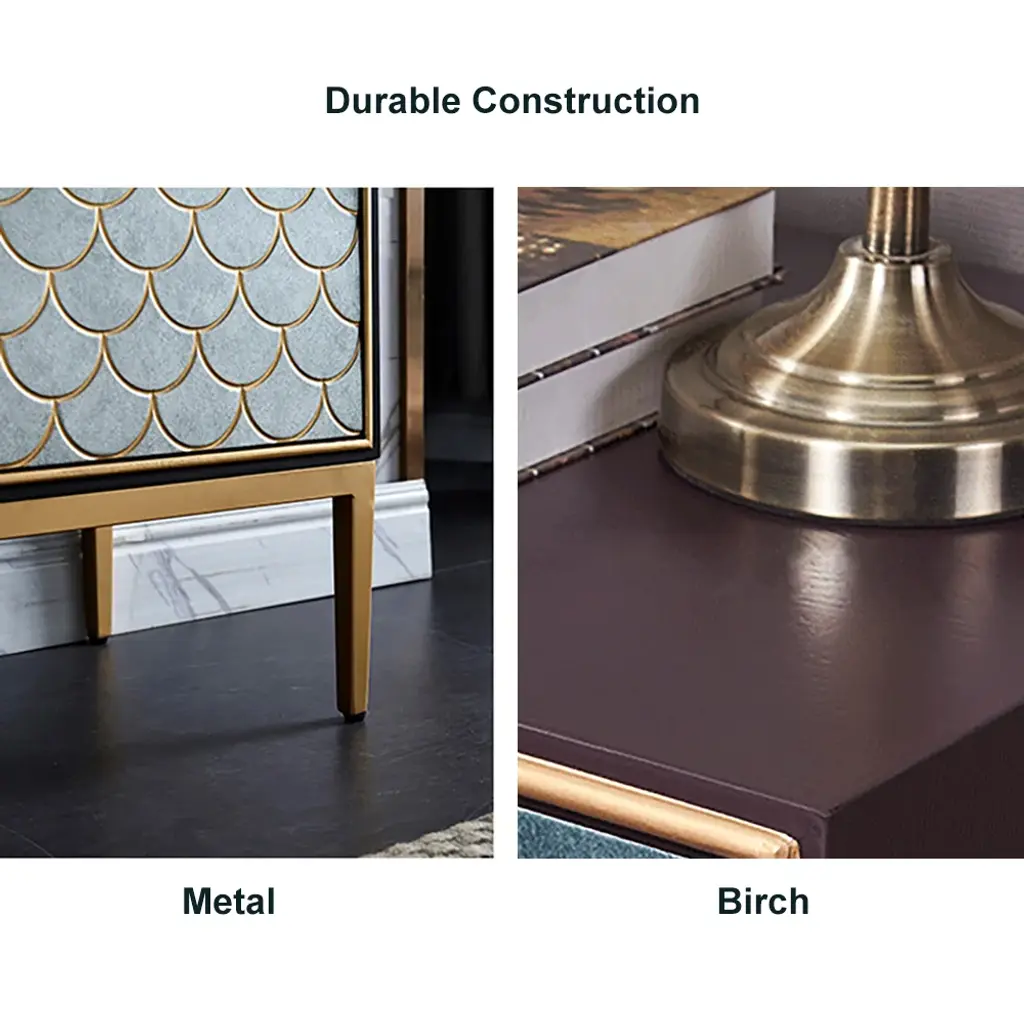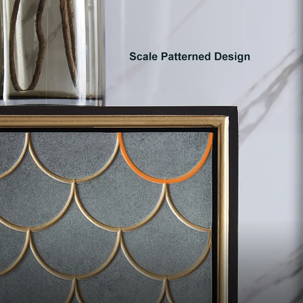 Make a bold style statement with this peacock green sideboard, featuring exquisite golden scale inlays for a luxurious touch. Its striking color is complemented by golden door rings and legs, creating an opulent centerpiece. The spacious interior with 3 shelves behind 2 doors offers both dramatic visual appeal and practical storage functionality.