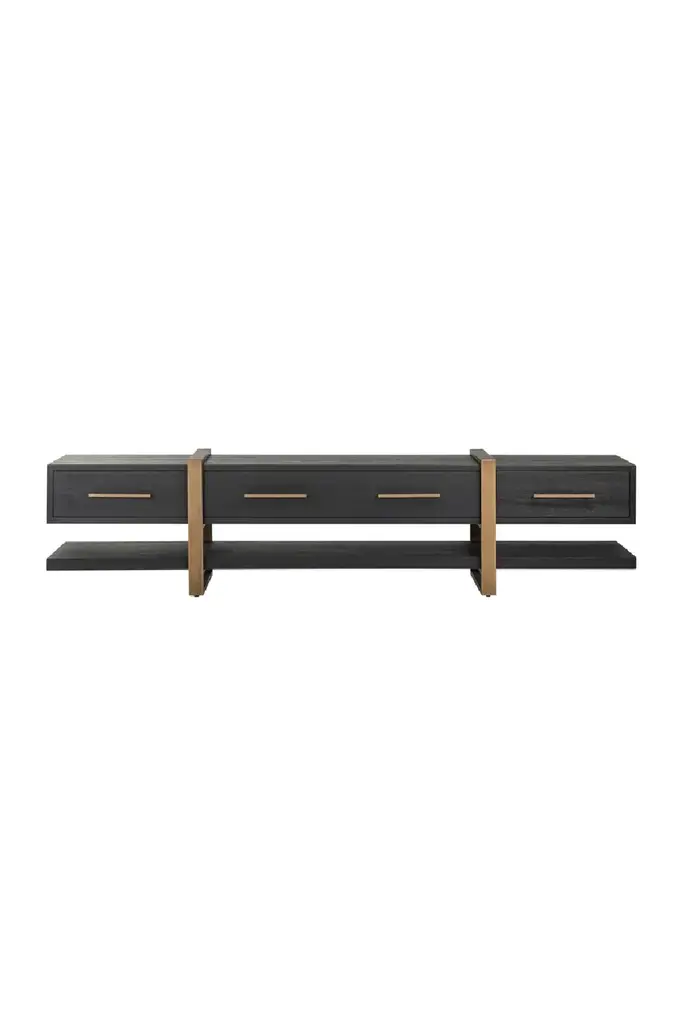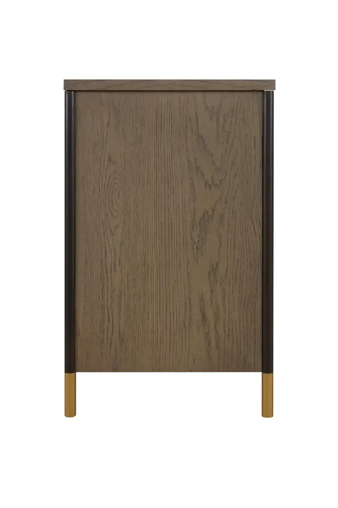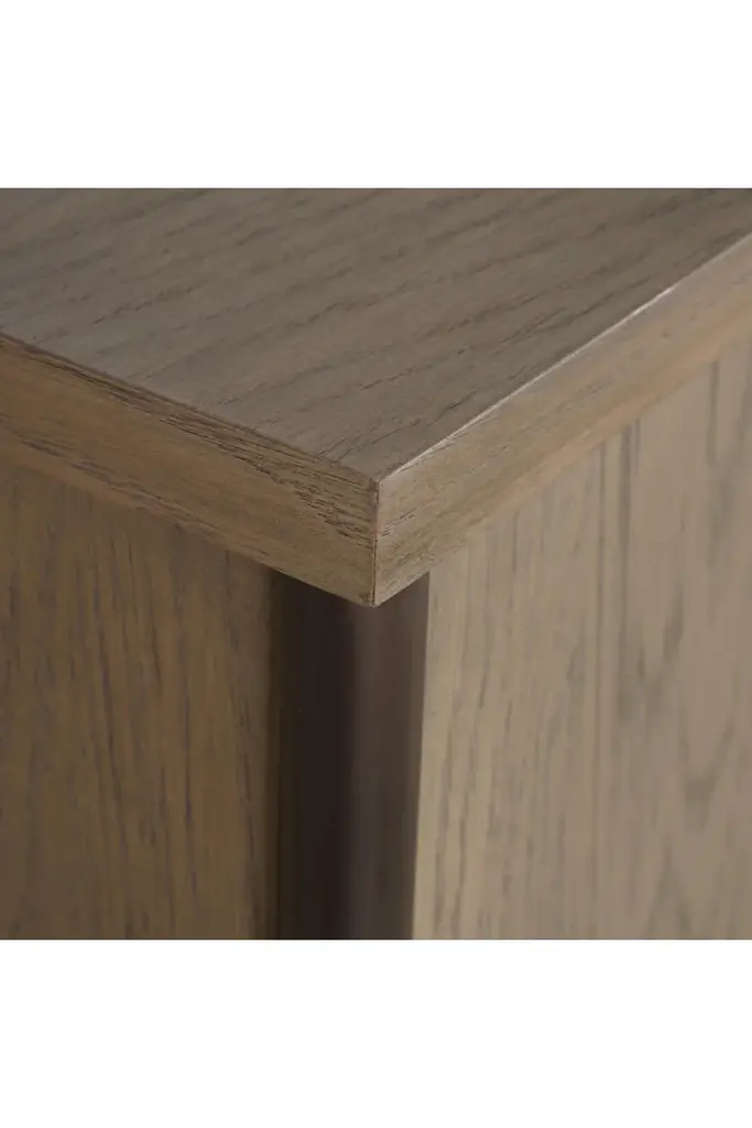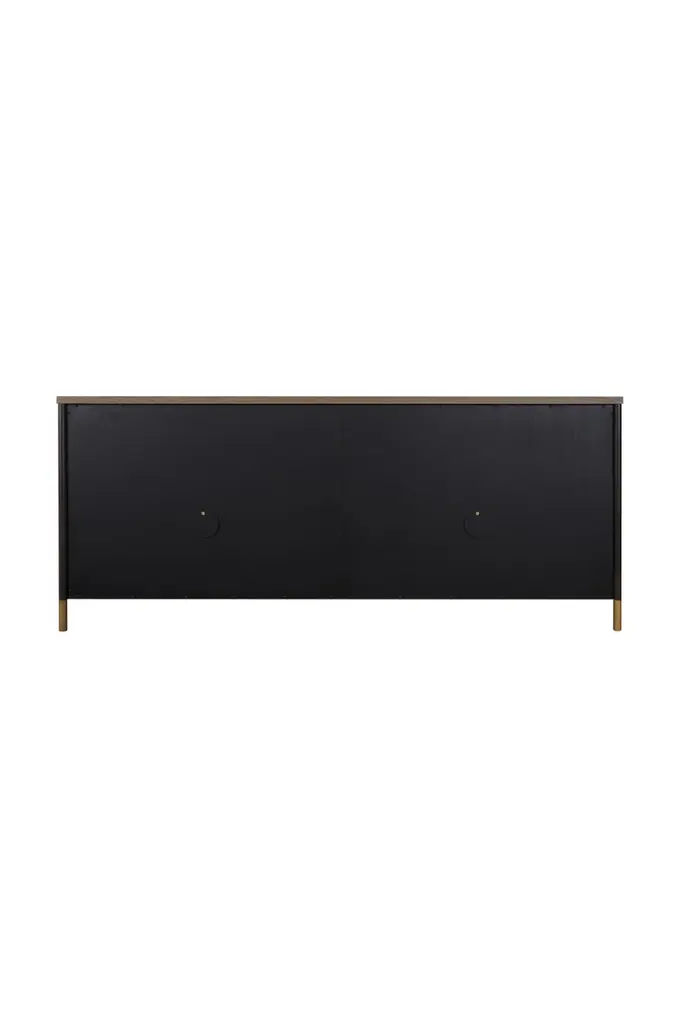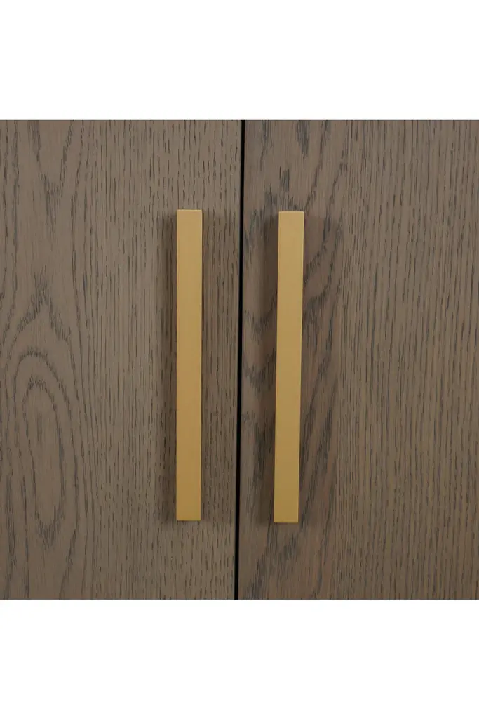The Jeanne Sideboard is a harmonious blend of elegance and functionality, crafted from oak and oak veneers for a timeless, natural appeal. Its sleek iron legs, finished with brushed brass inlays at the base, provide a luxurious yet stable foundation, while the brushed brass door handles enhance the sideboard's refined aesthetic.Designed to meet a variety of storage needs, the Jeanne Sideboard features four doors that open to reveal adjustable inner shelves. These compartments offer generous space for organizing dinnerware, linens, or household essentials, ensuring a neat and polished look for your living or dining area.The Jeanne Sideboard's versatile design fits seamlessly into both modern and classic interiors. Its neutral oak finish and clean lines make it a perfect addition to dining rooms, entryways, or living rooms. Whether styled with minimalist décor for understated elegance or as a complement to more elaborate settings, this sideboard serves as a practical and eye-catching piece.