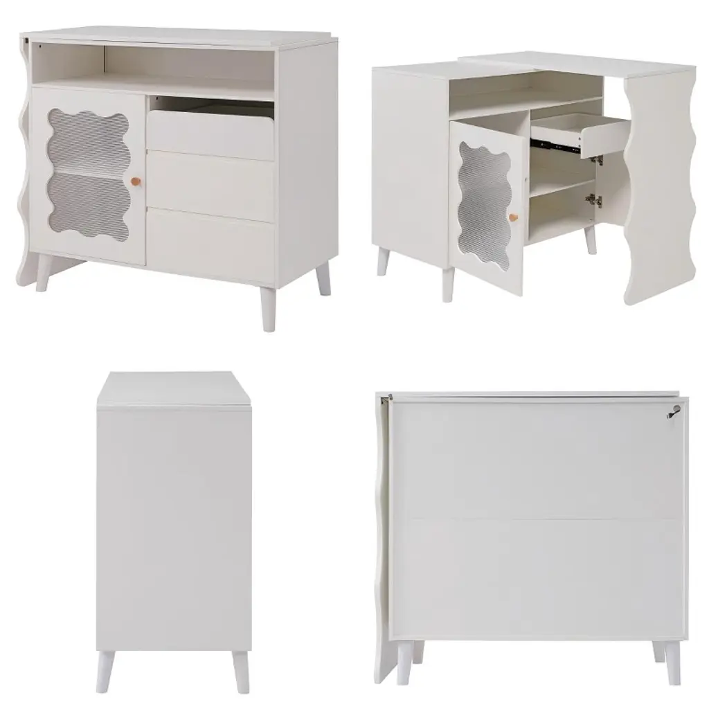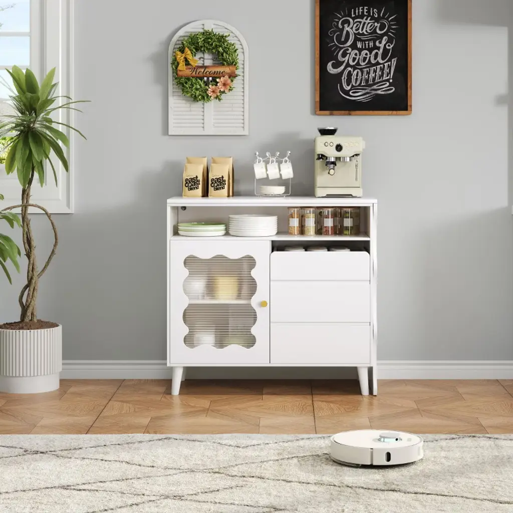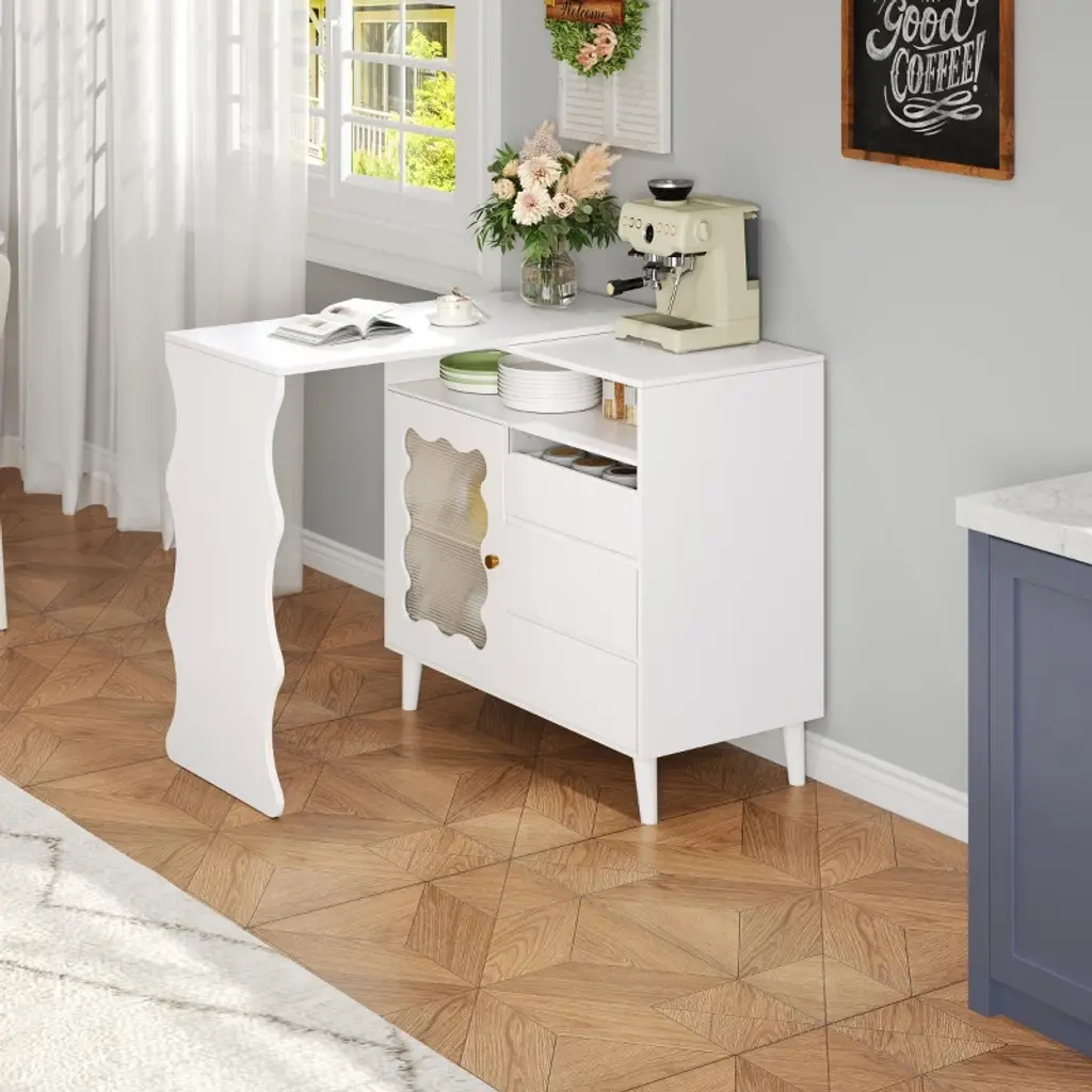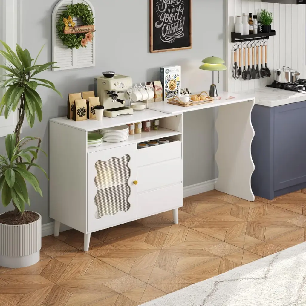 Transform your kitchen or dining room into a modern, multifunctional entertainment hub with the Cuddlewood Extendable Sideboard Buffet Cabinet—a stylish and innovative centerpiece designed to elevate your home. Crafted from premium white MDF wood, this buffet cabinet seamlessly combines sleek aesthetics with smart functionality, offering a fresh take on traditional storage furniture. Whether you're hosting intimate dinners or lively gatherings, the Cuddlewood adapts to your needs with its unique 360° rotating and retractable L-shaped design. Extend it up to an impressive 78.94 inches to accommodate guests or retract it to just 41.34 inches for a compact, space-saving solution that fits effortlessly into any corner. When not extended, it transforms into a beautiful storage centerpiece, making it an ideal choice for smaller spaces without compromising on capacity or style. This sideboard goes beyond simple storage—thoughtfully designed compartments with acrylic glass doors showcase your favorite glassware or collectibles, while discreet cabinets keep essentials organized and out of sight. A spacious open drawer (5.12" H x 16.54" D x 19.57" L) provides easy access to cutlery, napkins, or accessories, and an upper open compartment is perfect for displaying drinks, snacks, or decorative accents. The adjustable shelves allow you to customize your display, while a dedicated lighting area enhances visibility and adds a touch of sophistication, making it easy to locate items even in low light. Built with stability in mind, the Cuddlewood is reinforced with heavy-duty metal hinges and includes an optional metal safety kit to secure the extendable board, ensuring reliable, wobble-free use. The MDF surface is easy to clean, and the smooth-glide drawer slides and classic round wooden handles provide a touch of timeless charm to this modern piece. Whether you're upgrading your dining area or seeking a stylish storage solution, the Cuddlewood Extendable Sideboard Buffet Cabinet delivers the perfect balance of form and function. It’s more than a cabinet—it’s a statement of elegance, versatility, and innovation that will transform the way you entertain and organize your space.