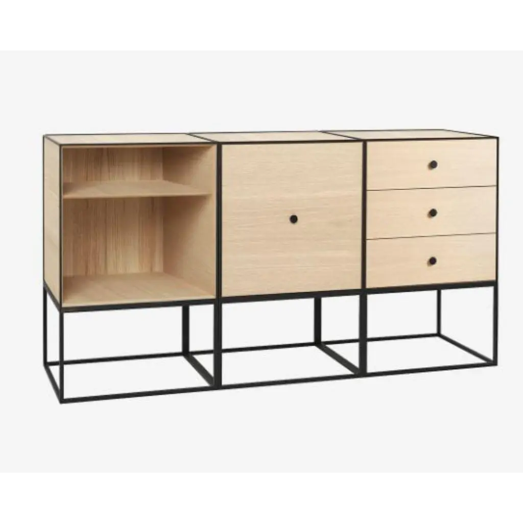49 oak frame sideboard trio by Lassen.Dimensions: D 147 x W 42 x H 77 cm Materials: Finér, melamin, melamine, metal, veneer, oakAlso available in different colors and dimensions. Weight: 88 kgBy Lassen is a Danish design brand focused on iconic designs created by Mogens and Flemming Lassen, founded by Lassens’ relatives in 2008. Brothers Mogens (1901-1987) and Flemming (1902-1984) Lassen are known as two of Denmark’s greatest architects and designers. Both were renowned pioneers of Danish functionalism and modernist architecture, honoured with numerous prestigious medals and awards. Headed by Mogens Lassen’s grandson Søren Lassen, By Lassen carries on the brothers’ design philosophy by manufacturing their iconic designs as well as products by other designers that complement the Lassen’s functionalist style. The company’s mission is to continue the tradition of timelessness, functionality and quality, and to introduce the Lassen’s design heritage to new generations.