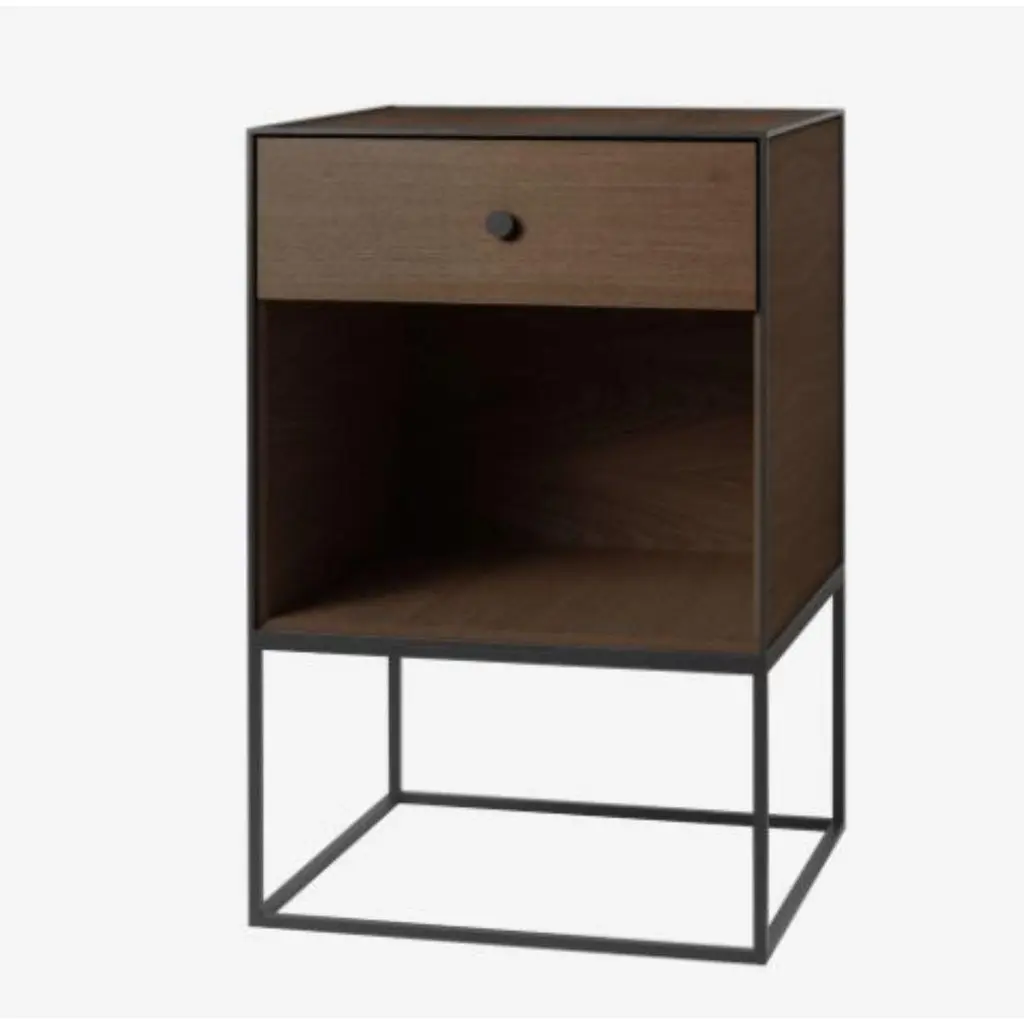 49 smoked oak frame sideboard with 1 drawer by LassenDimensions: W 49 x D 42 x H 77 cm Materials: Finér, melamin, melamine, metal, veneer, oakAlso available in different colours and dimensions.Weight: 15.50 kgBy Lassen is a Danish design brand focused on iconic designs created by Mogens and Flemming Lassen, founded by Lassens’ relatives in 2008. Brothers Mogens (1901-1987) and Flemming (1902-1984) Lassen are known as two of Denmark’s greatest architects and designers. Both were renowned pioneers of Danish functionalism and modernist architecture, honoured with numerous prestigious medals and awards. Headed by Mogens Lassen’s grandson Søren Lassen, By Lassen carries on the brothers’ design philosophy by manufacturing their iconic designs as well as products by other designers that complement the Lassen’s functionalist style. The company’s mission is to continue the tradition of timelessness, functionality and quality, and to introduce the Lassen’s design heritage to new generations.