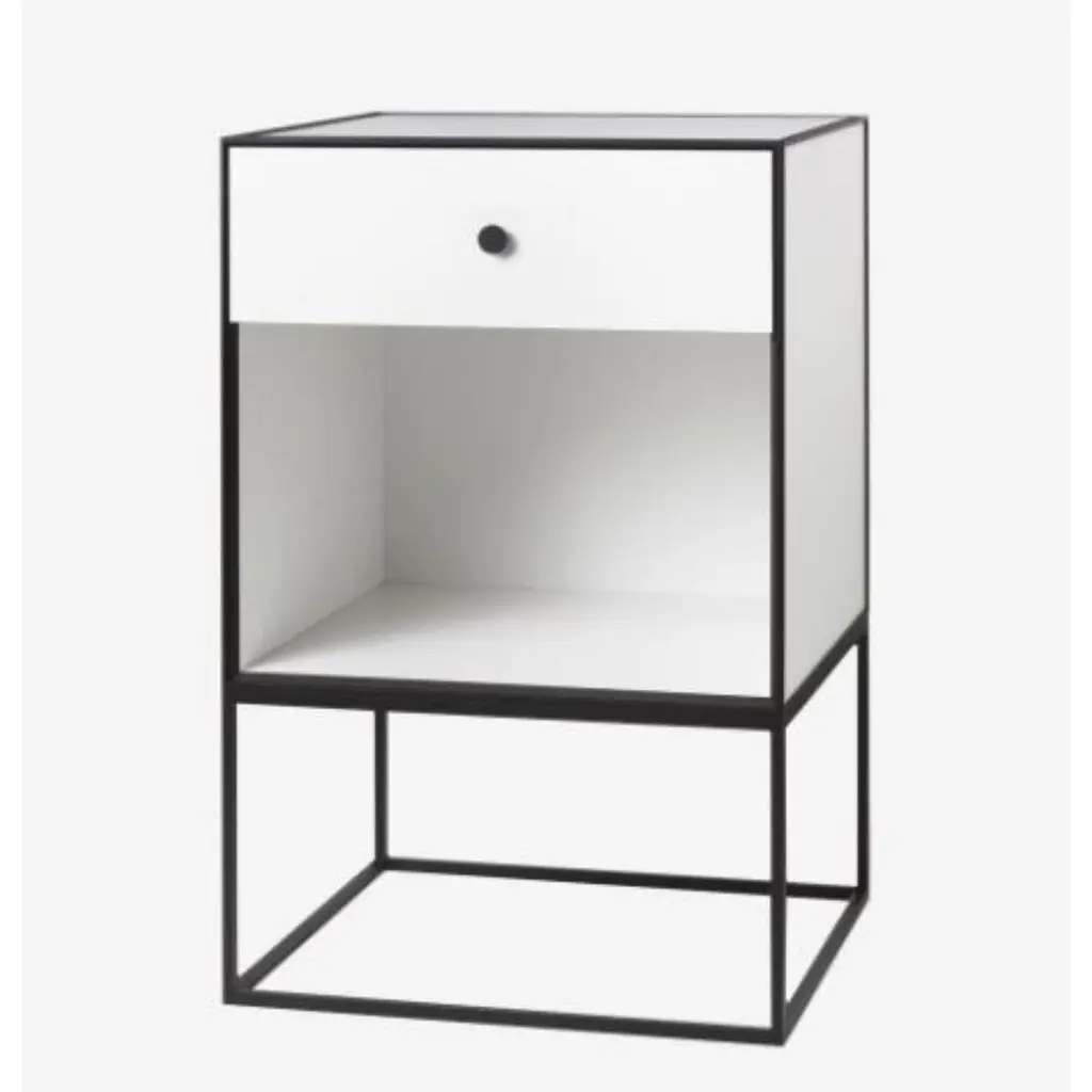 49 white frame sideboard with 1 drawer by LassenDimensions: w 49 x d 42 x h 77 cm Materials: Finér, Melamin, Melamine, Metal, VeneerAlso available in different colors and dimensions.Weight: 15.50 KgBy Lassen is a Danish design brand focused on iconic designs created by Mogens and Flemming Lassen, founded by Lassens’ relatives in 2008. Brothers Mogens (1901-1987) and Flemming (1902-1984) Lassen are known as two of Denmark’s greatest architects and designers. Both were renowned pioneers of Danish functionalism and modernist architecture, honoured with numerous prestigious medals and awards. Headed by Mogens Lassen’s grandson Søren Lassen, By Lassen carries on the brothers’ design philosophy by manufacturing their iconic designs as well as products by other designers that complement the Lassen’s functionalist style. The company’s mission is to continue the tradition of timelessness, functionality and quality, and to introduce the Lassen’s design heritage to new generations.