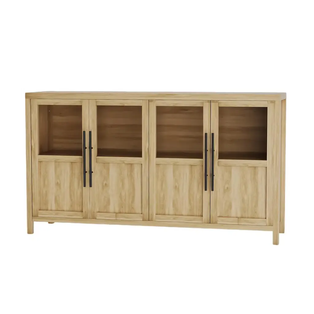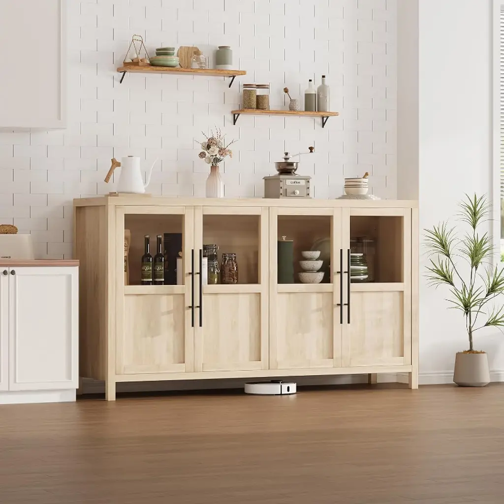 Discover the perfect blend of style and storage with this 55'' large sideboard buffet cabinet! Elevate your space with this elegant piece that keeps your items organized and beautifully displayed.Highlights at a glance:This stunning piece features elegant glass doors that showcase your beautiful tableware while keeping everything neatly organized.Crafted from robust engineered wood, this buffet cabinet is designed for lasting use, supported by sturdy metal hardware for added strength.The central shelf maximizes space, while the spacious tabletop is perfect for placing your coffee maker and decorative items, combining functionality with style in this versatile 4 door kitchen cabinet.Its simple yet chic design complements various styles, making it a timeless addition to your home.Whether you're using it as a stylish buffet table, a kitchen storage cabinet, or a farmhouse coffee bar, this versatile glass door sideboard cabinet fits seamlessly into any dining room or living room decor.Specification:Size:15.75x33.86x55.12 inchesColor: white+natural / natural / blackMaterial: engineered wood+glass+metalPackage dimension: 57.87x18.50x6.69 inchesPackage weight: 101.41 lbsFriendly note:Please follow the steps in the instruction manual, arrange each panel by the numbered order, and complete the assembly.Packing list:Buffet cabinet x1Hardware bagsAssembly guide x1